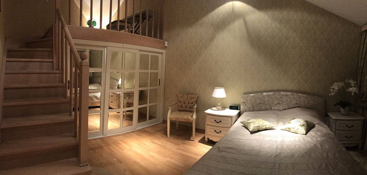 В случае, если квартира является студией, лестничное пространство можно использовать как спальню. Спальное место можно оборудовать кроватью, прикроватной тумбой, светильником и пуфом. Для правильного оформления данной зоны нужно воспользоваться советами дизайнеров по поводу светового освещения, так как именно от него зависит зонирование и отделение территории отдыха от общего интерьера помещения.