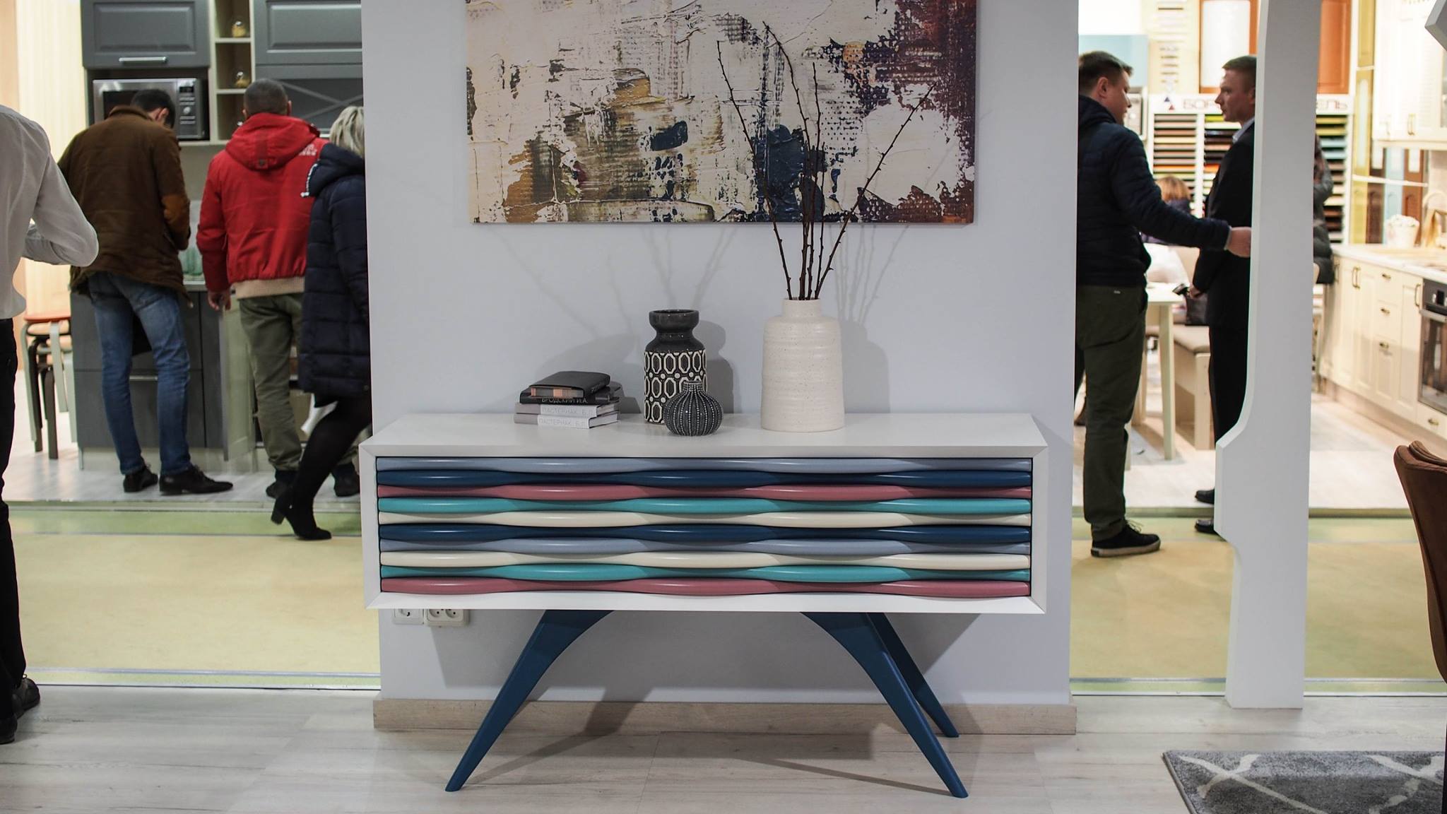Стенды обработки стекла и и стенды с материалами, необходимыми нам для создания мягких элементов в нашей корпусной твёрдой мебели притягивали всех наших дизайнеров.