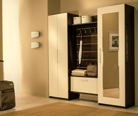 Закрытые шкафы для обуви вместо открытых полок. Минимум декоративных элементов. Компактная прихожая.