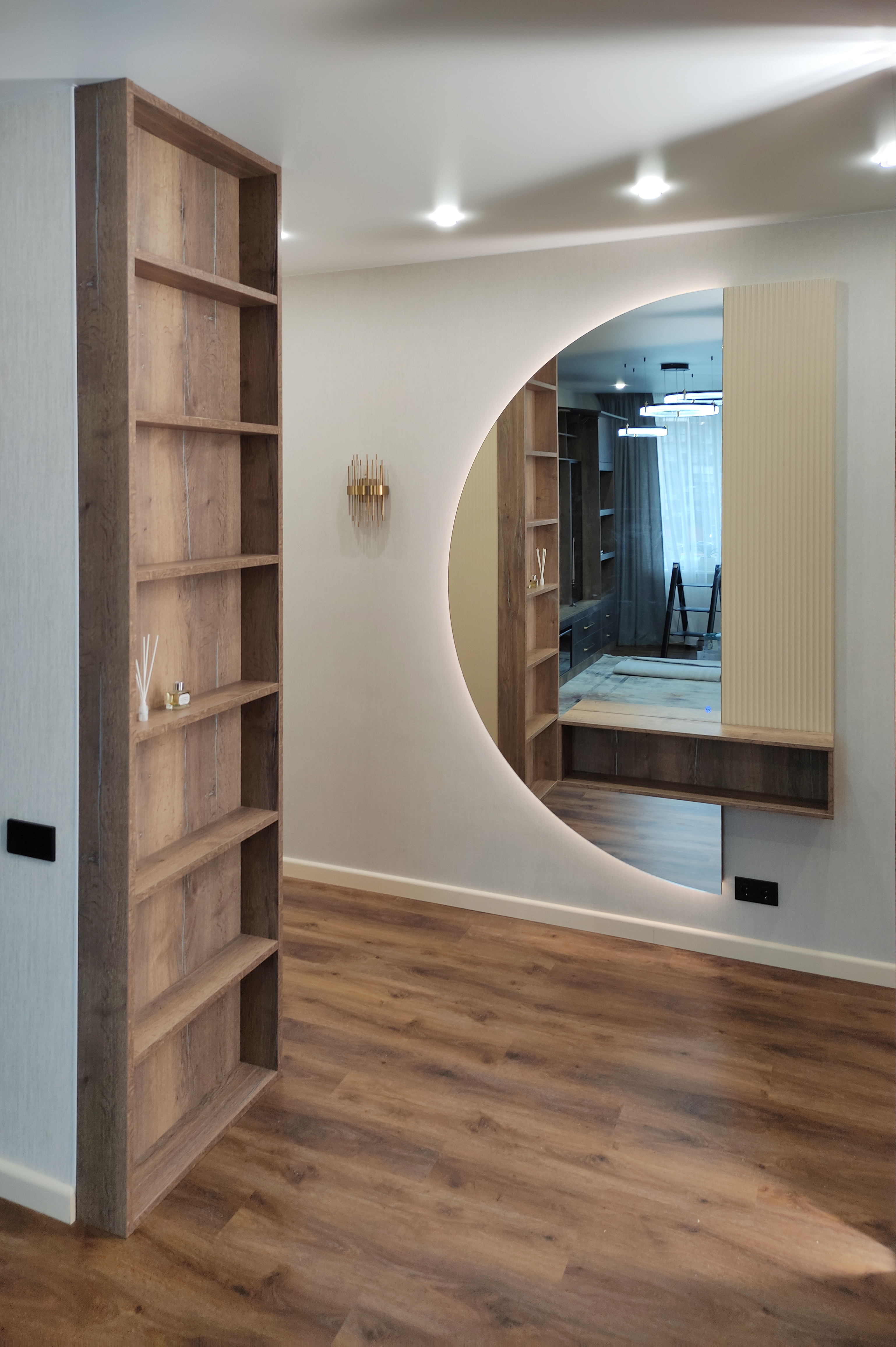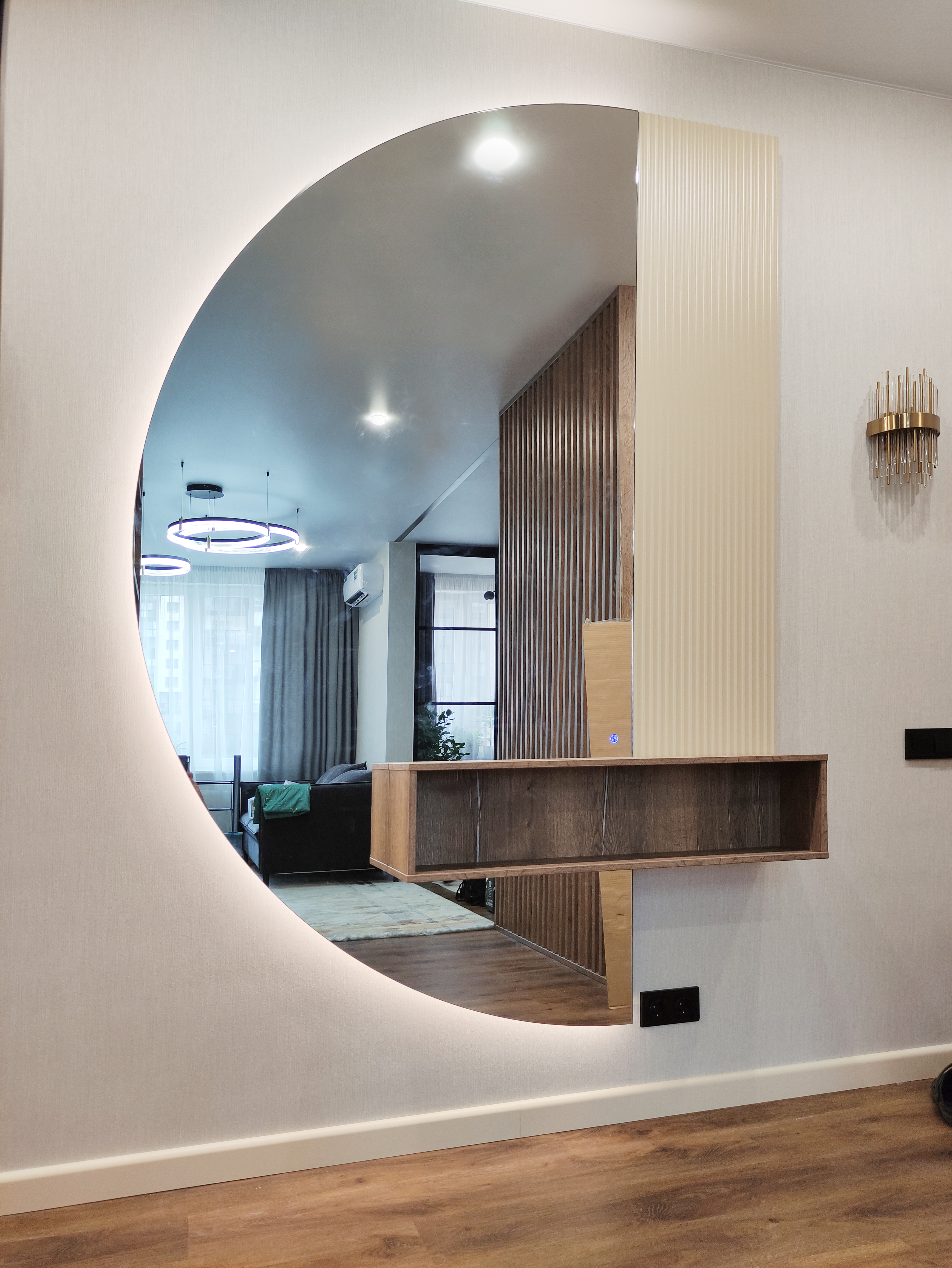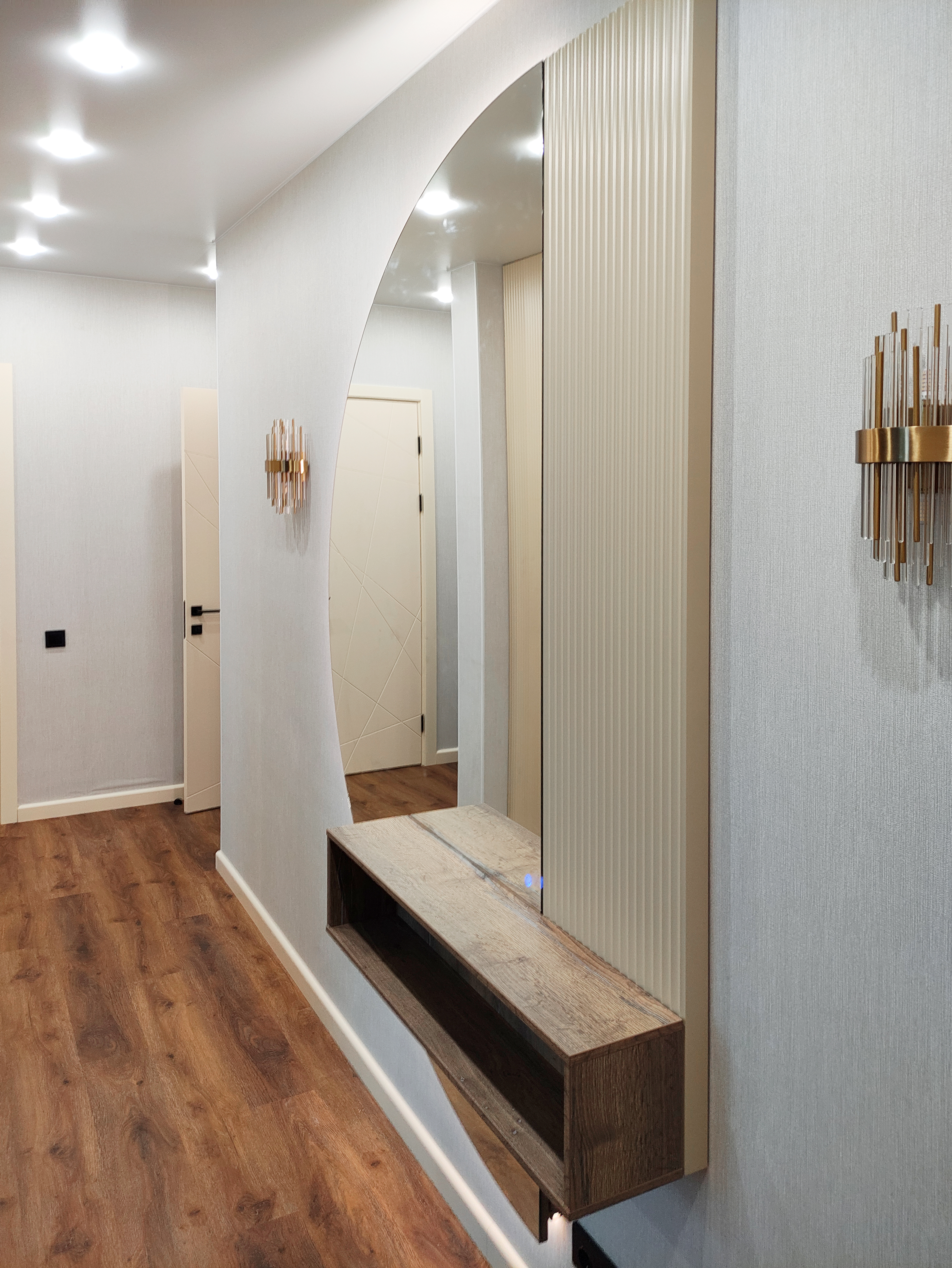 В целом, прихожая с полукруглым зеркалом и рейками с подсветкой – это стильный и функциональный дизайн, который поможет создать уютную и комфортную атмосферу в вашем доме.