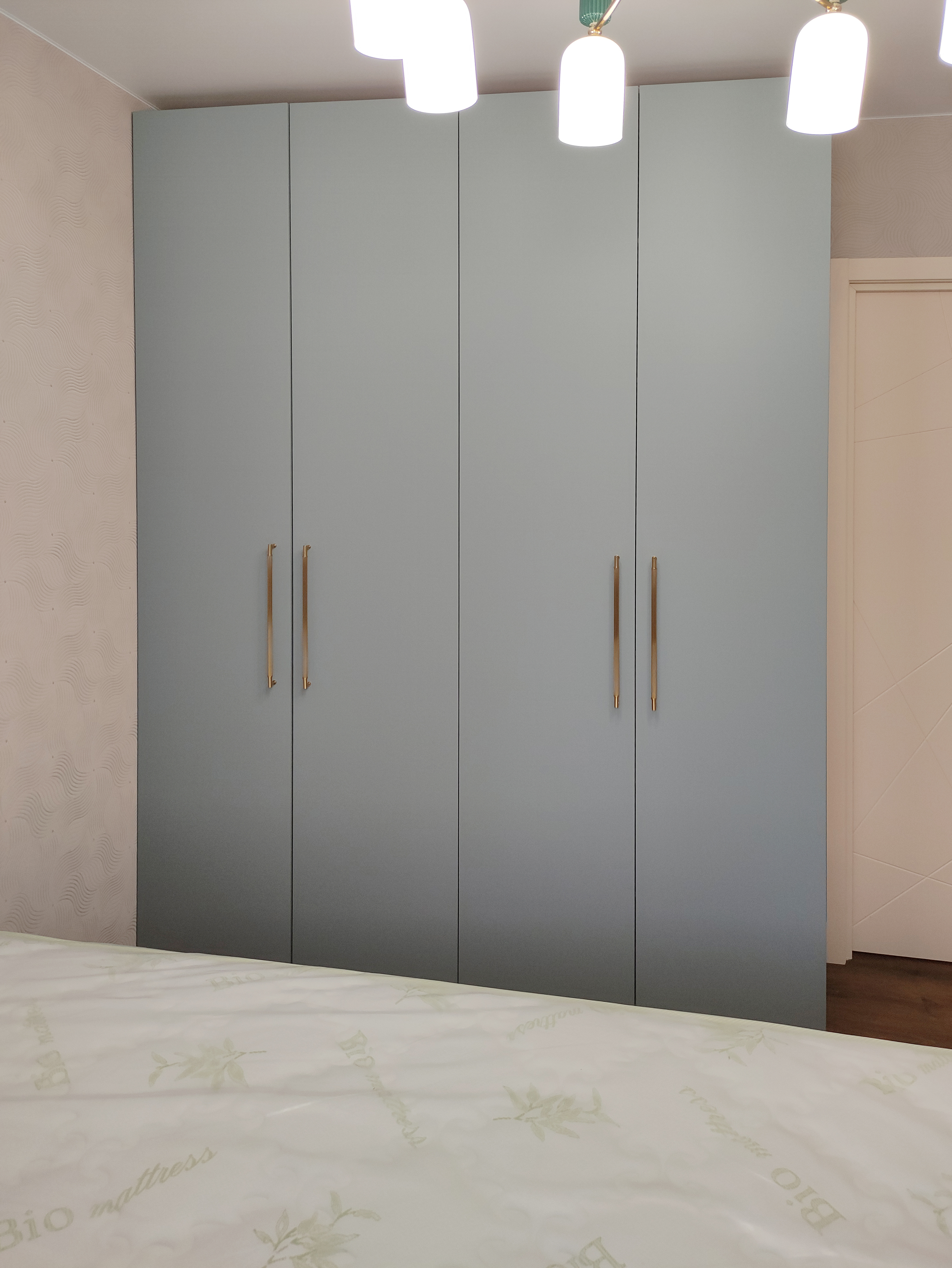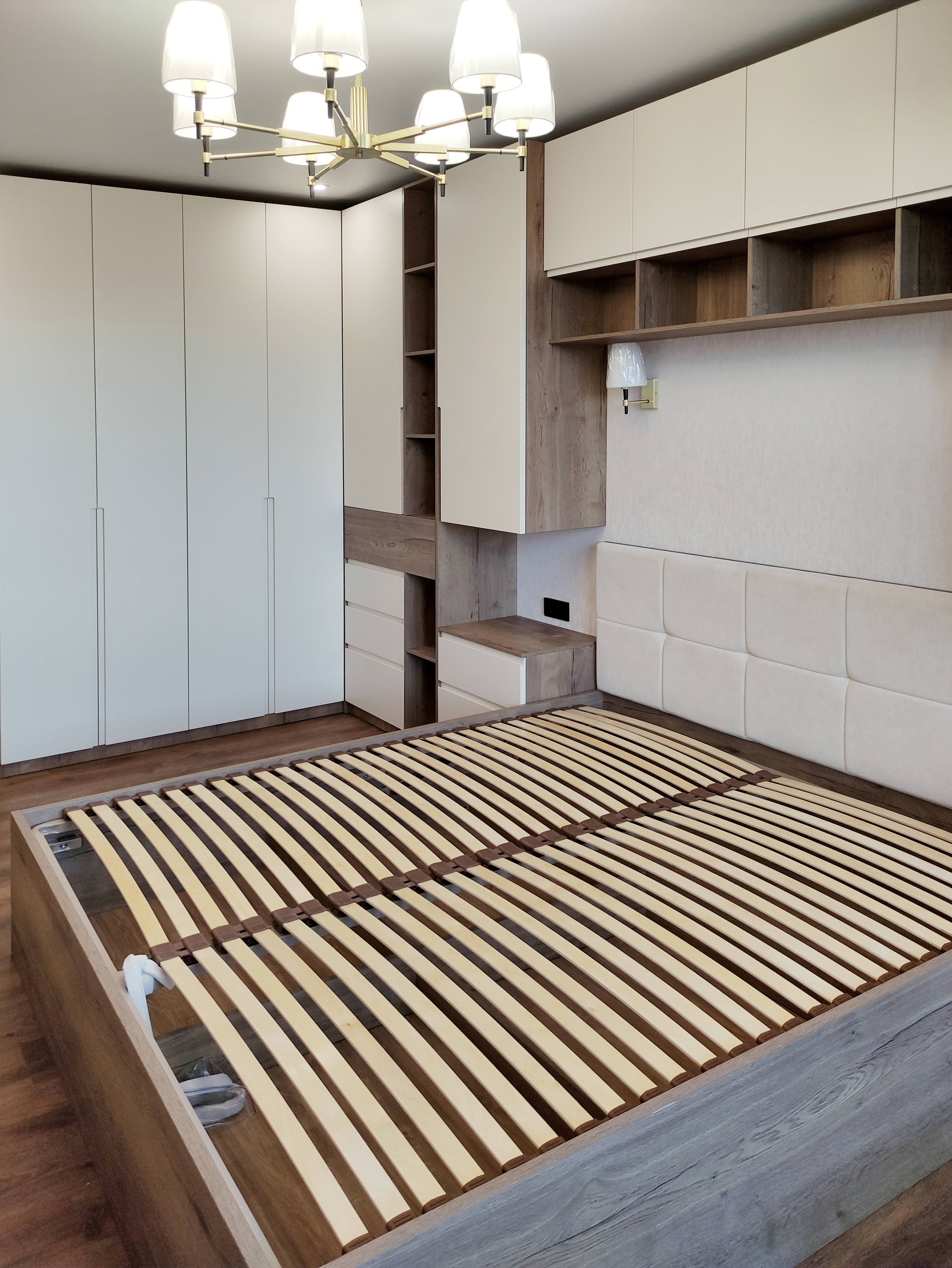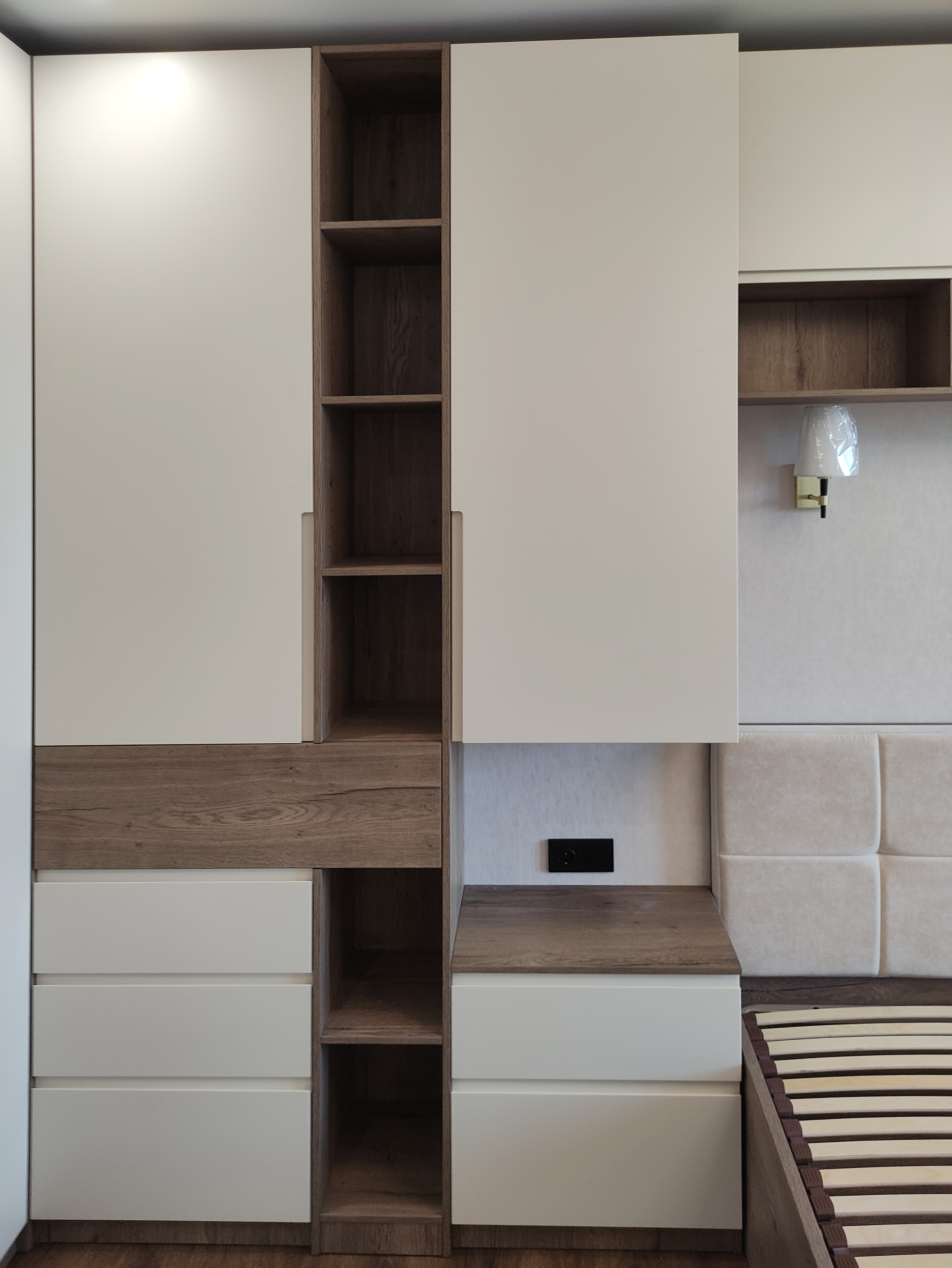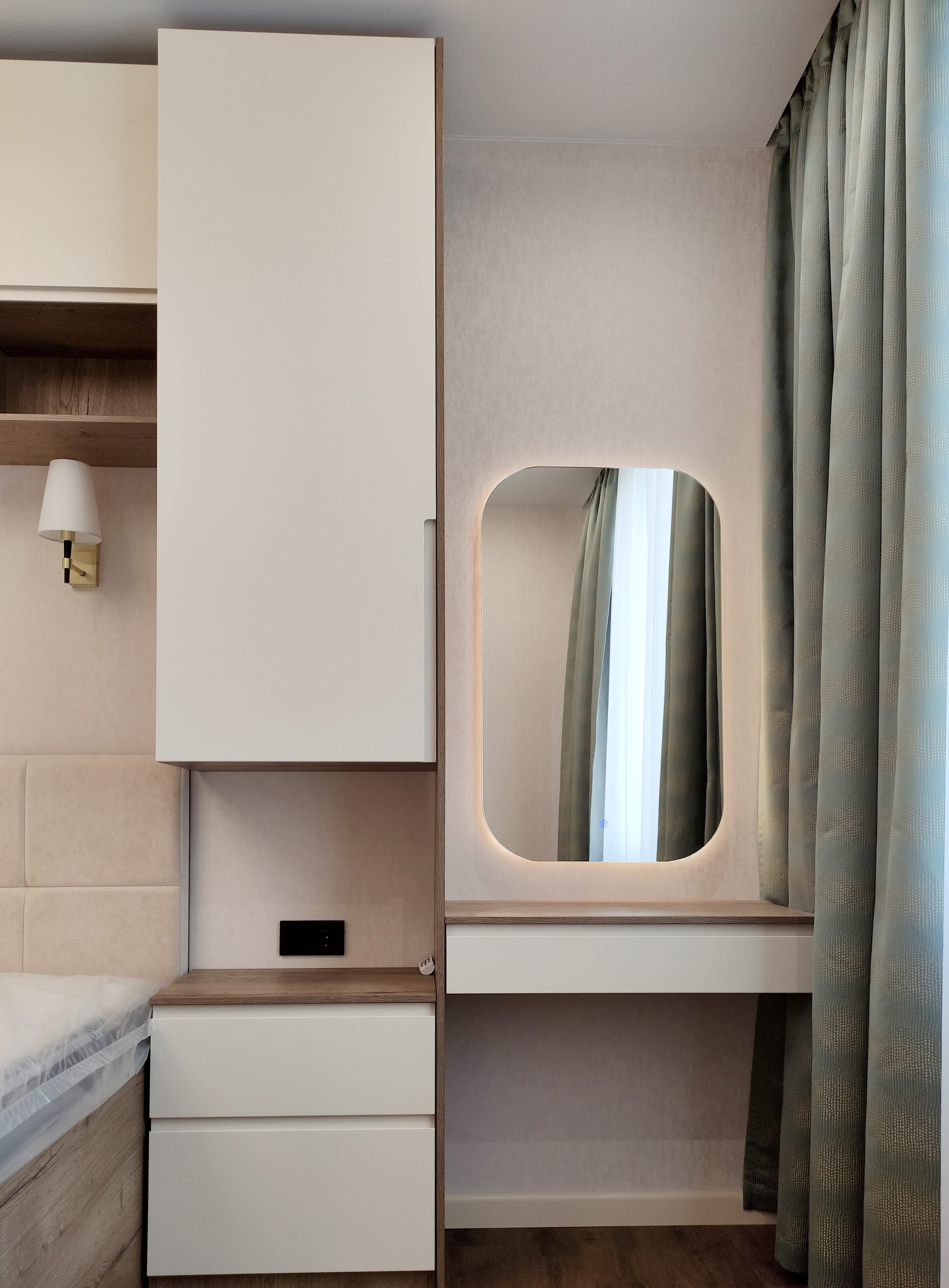 В спальне установлена кровать с мягким изголовьем, чтобы обеспечить максимальный комфорт во время сна. Зона хранения представлена шкафами с МДФ фасадами с врезными ручками и прикроватными корпусными элементами.