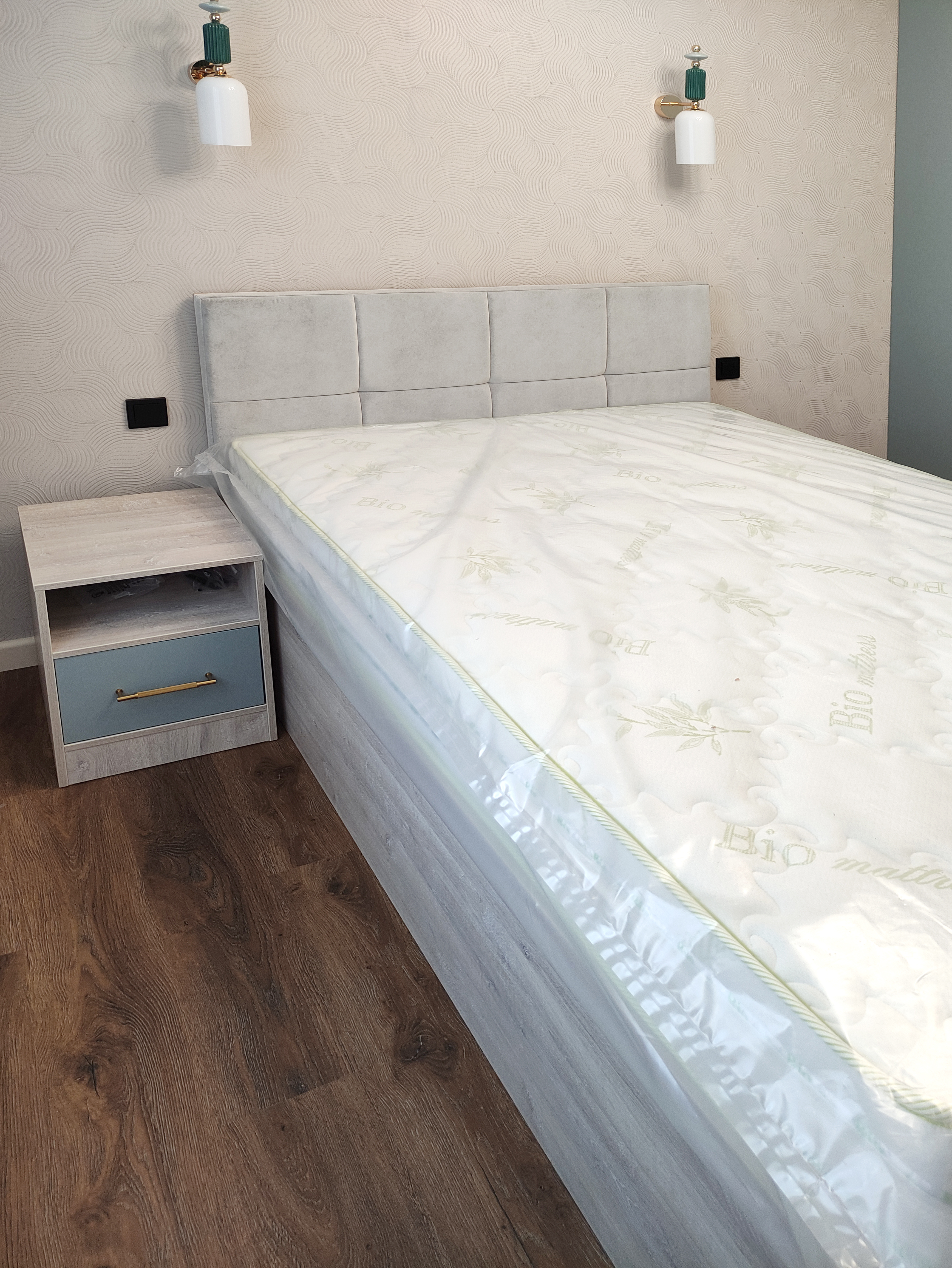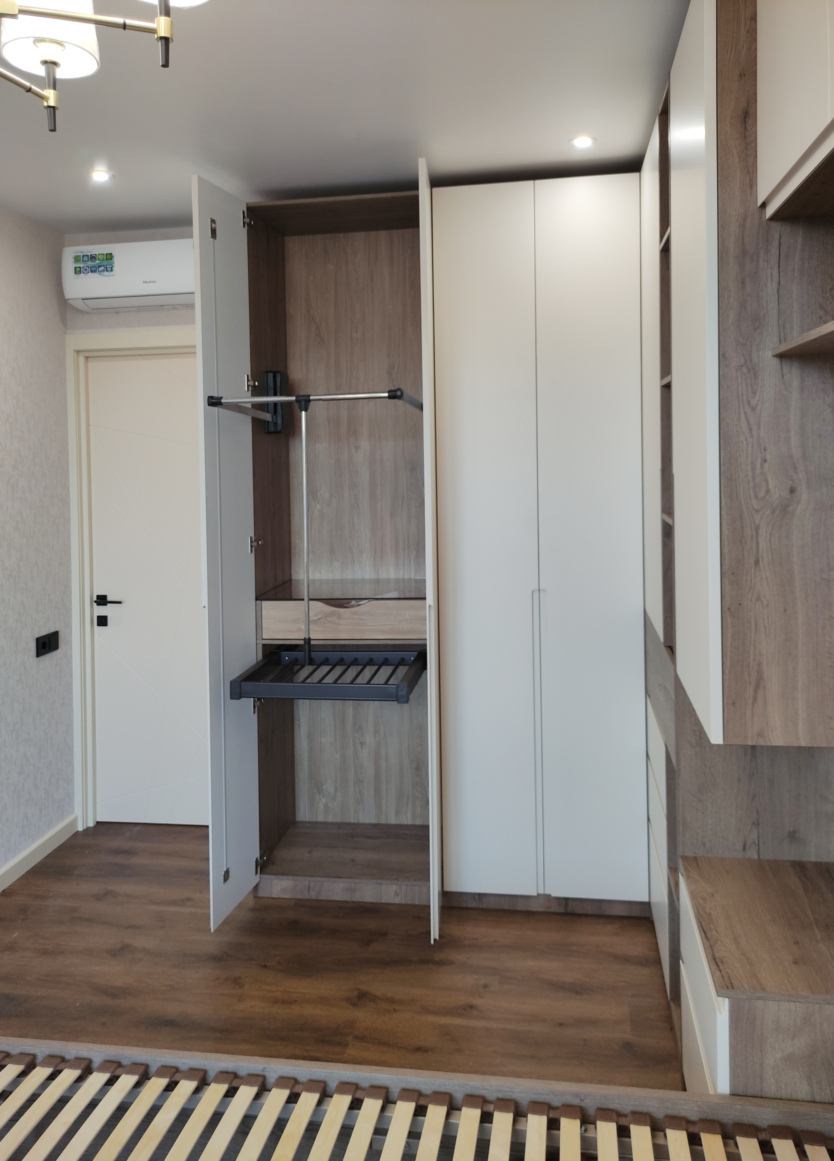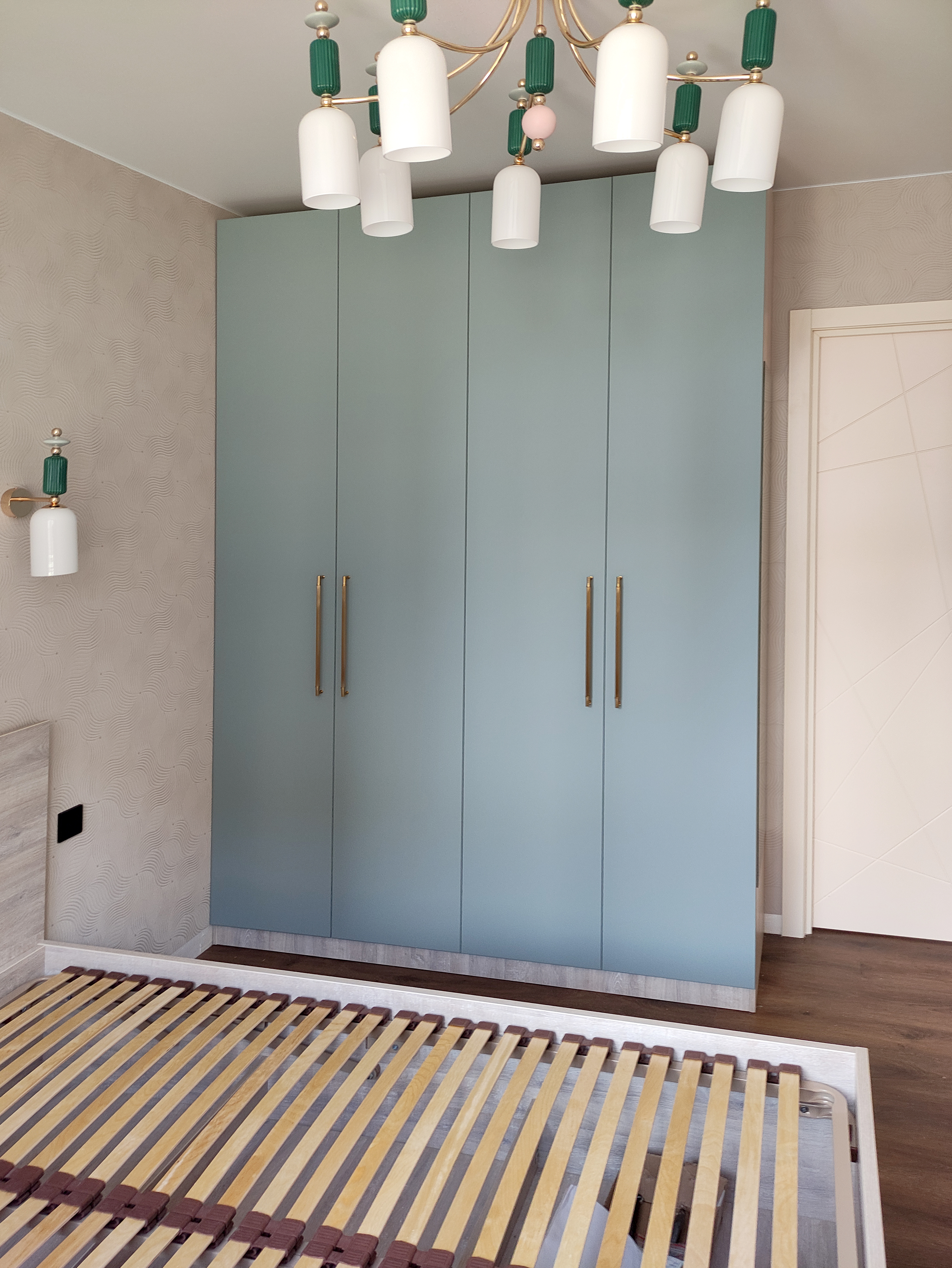 В спальне установлена кровать с мягким изголовьем, чтобы обеспечить максимальный комфорт во время сна. Зона хранения представлена шкафами с МДФ фасадами с врезными ручками и прикроватными корпусными элементами.