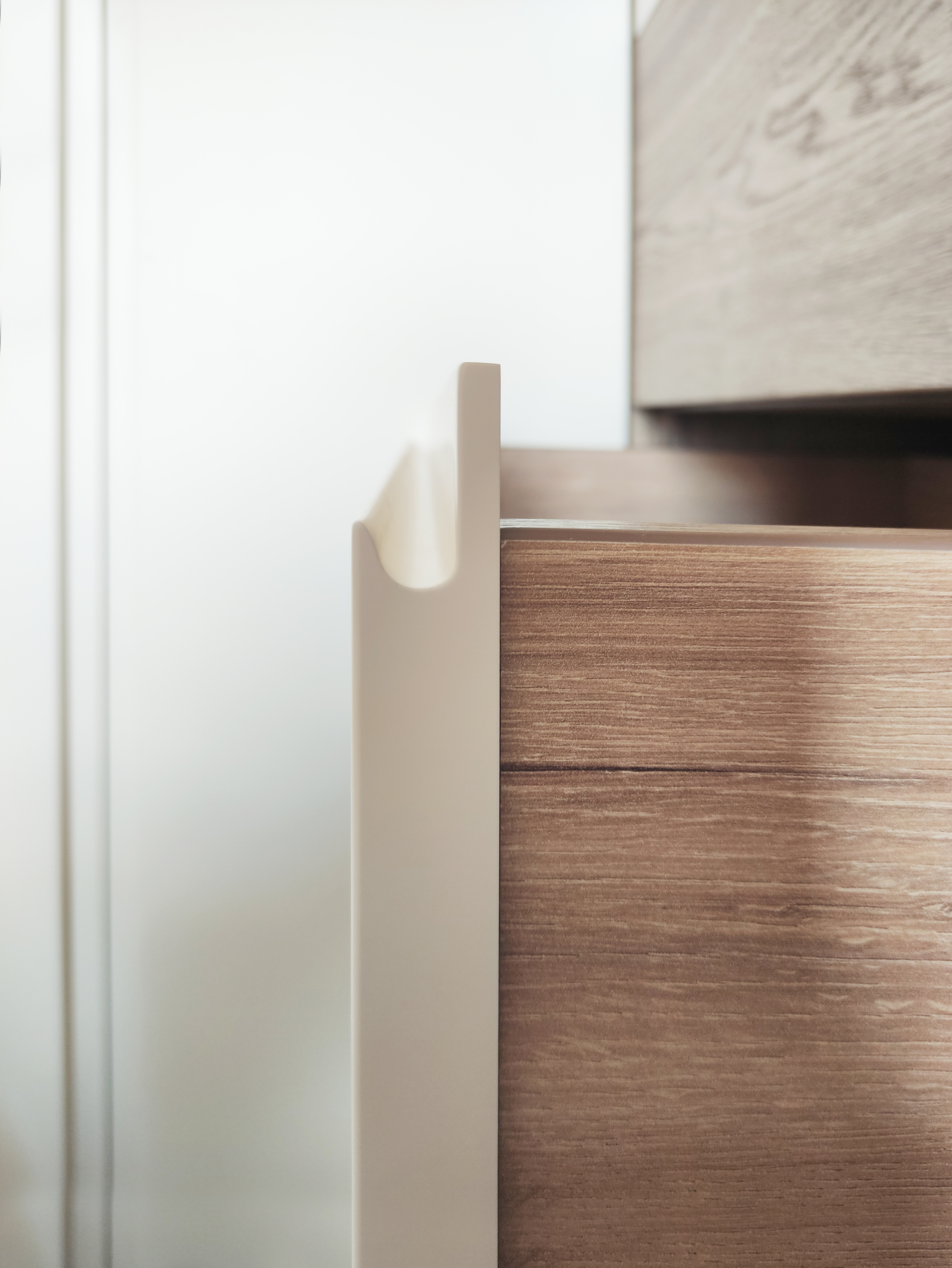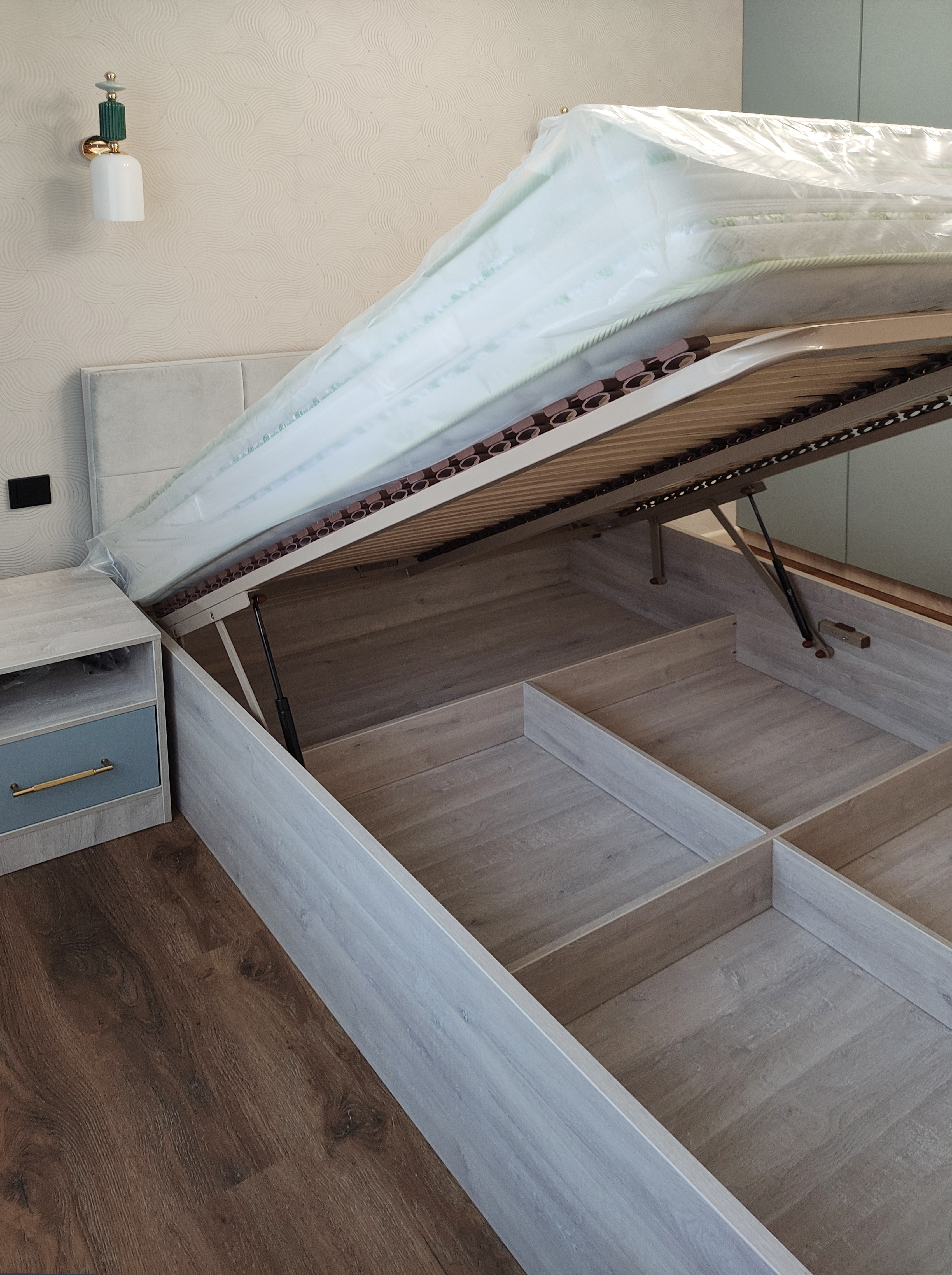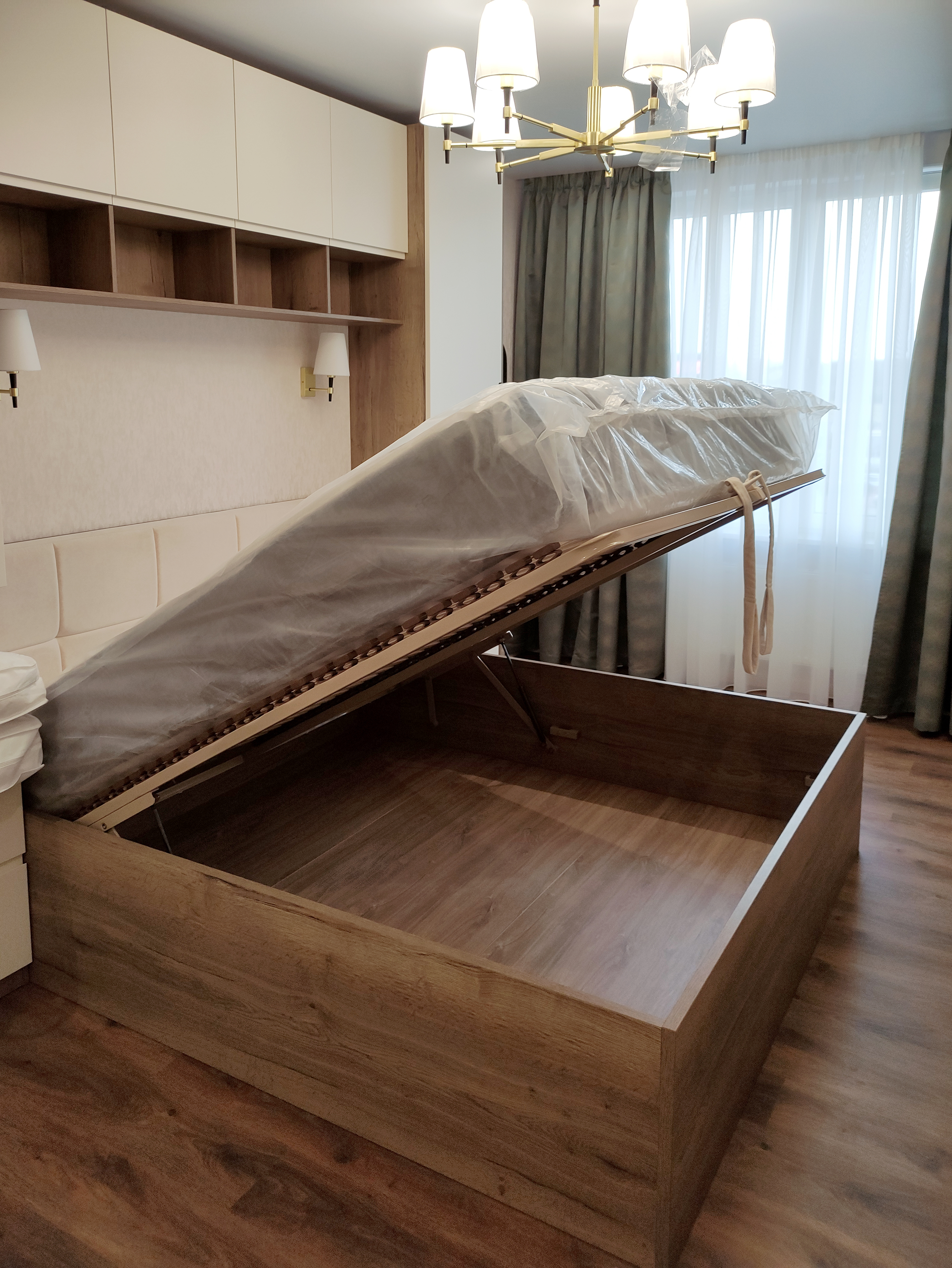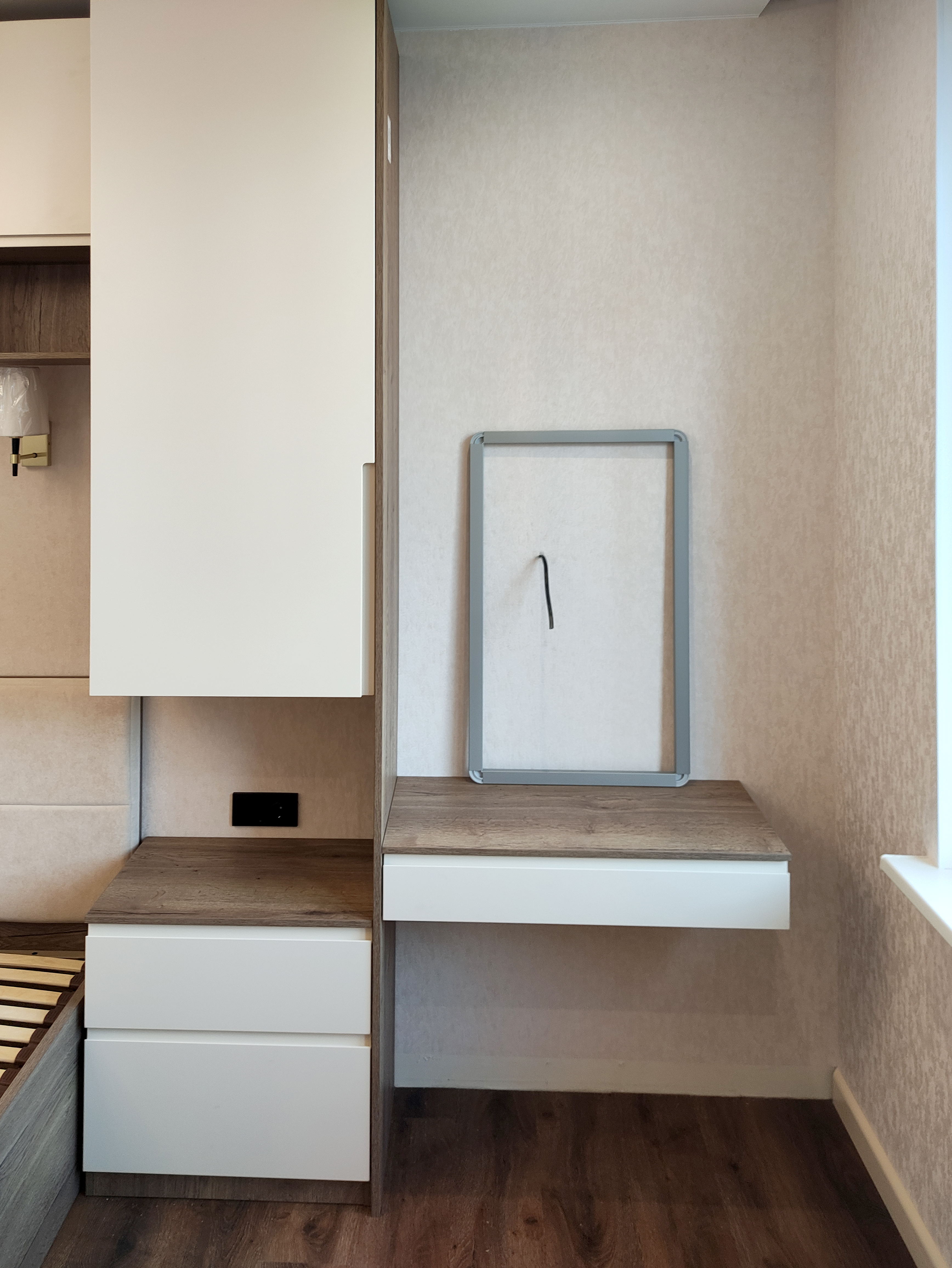 В спальне установлена кровать с мягким изголовьем, чтобы обеспечить максимальный комфорт во время сна. Зона хранения представлена шкафами с МДФ фасадами с врезными ручками и прикроватными корпусными элементами.