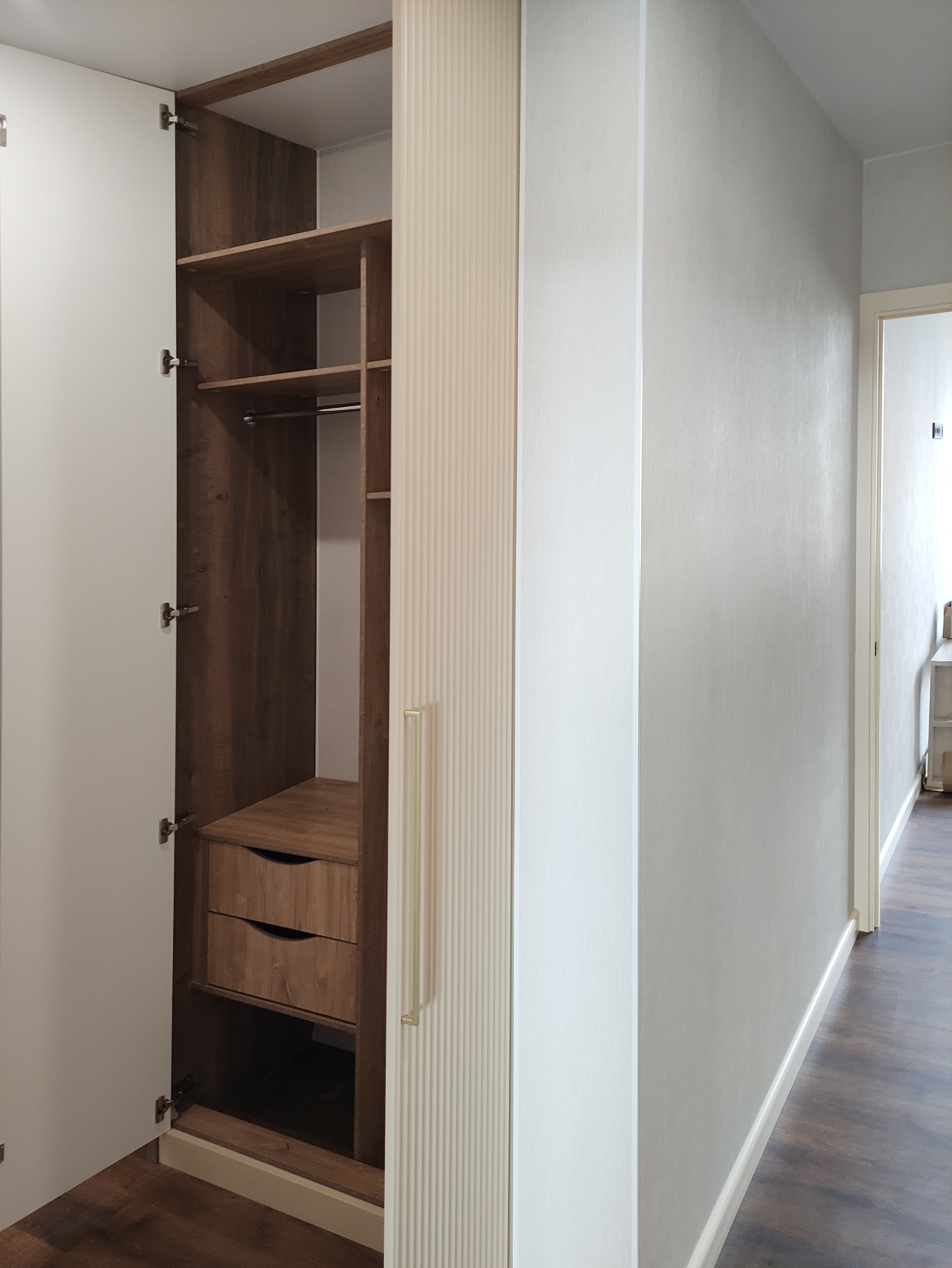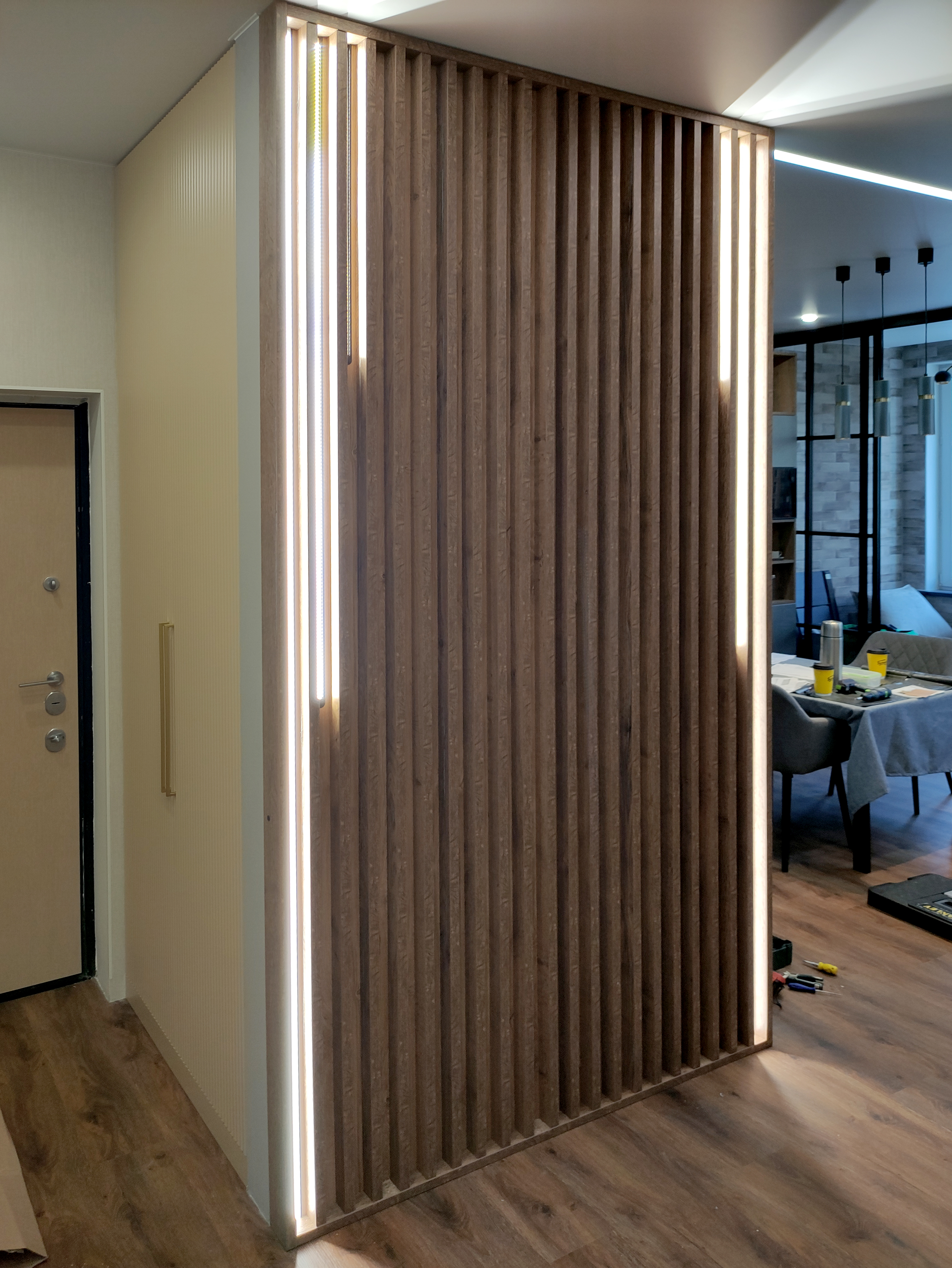 Рейки с подсветкой – еще один модный и функциональный элемент в интерьере прихожей. Рейки могут быть выполнены из натурального дерева, ЛДСП, МДФ. Подсветка реек может быть как встроенной, так и наружной. Это создает уютную атмосферу в прихожей и подчеркивает ее индивидуальность.