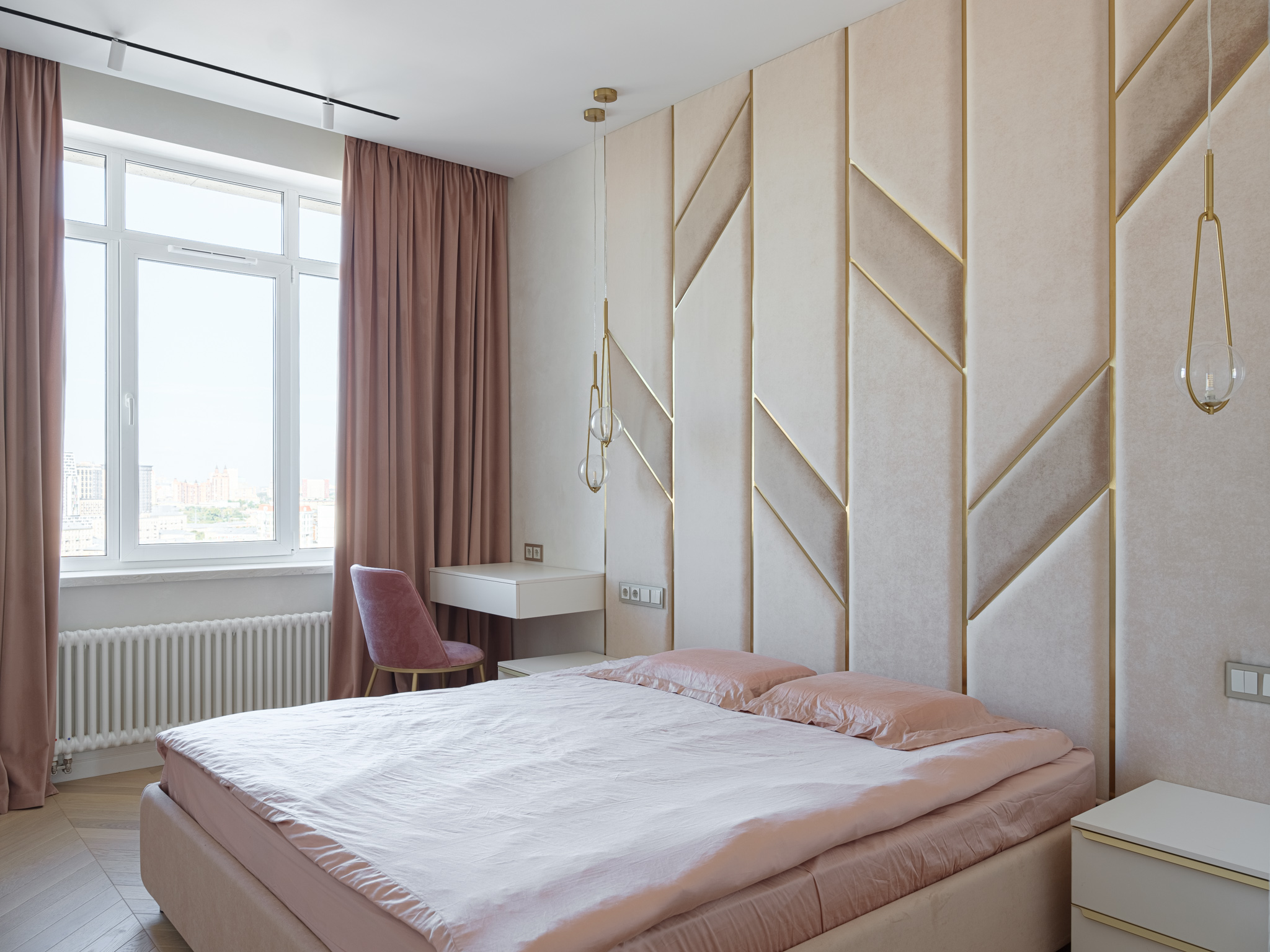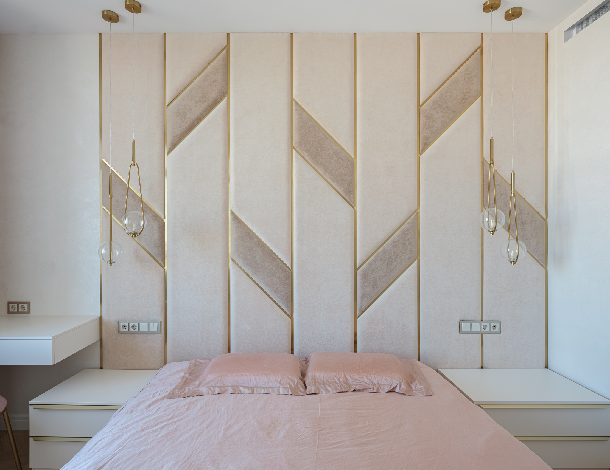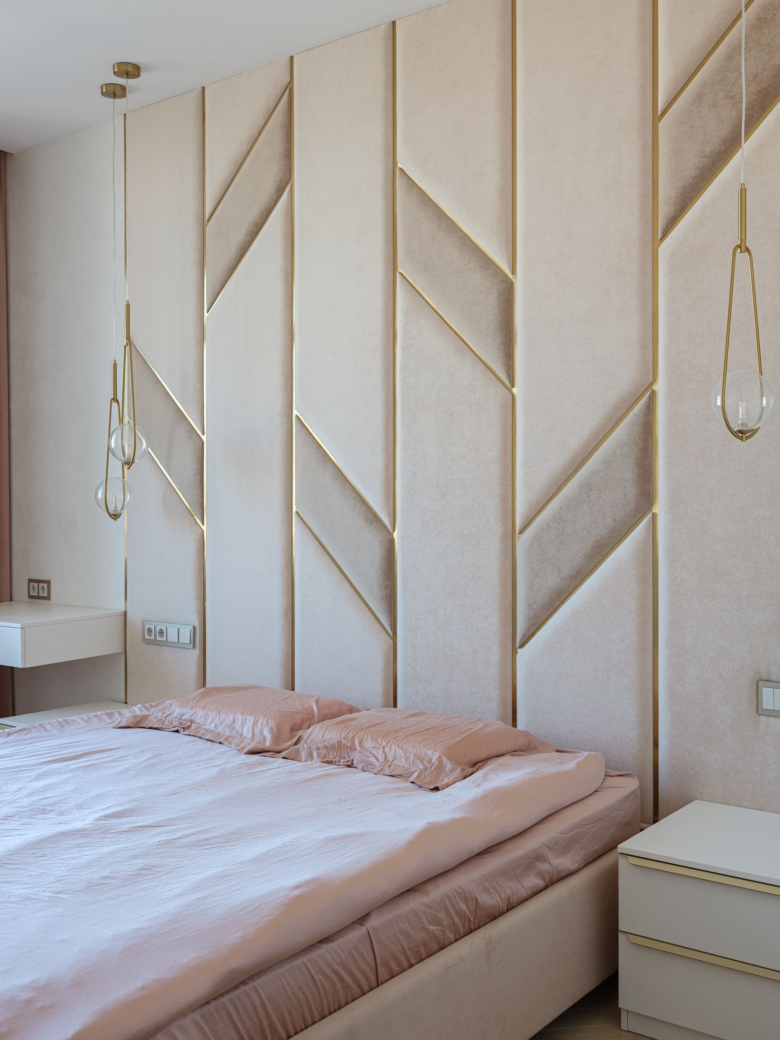 Спальня. Комната, где мы можем быть сами собой, где мы восстанавливаем силы и приводим мысли в порядок. Интерьер этой комнаты должен позволить расслабиться и почувствовать себя в безопасности. Мягкая стеновая панель с декоративными вставками из металлического профиля в золотом цвете придают комнате ощущение комфорта и спокойствия, делают атмосферу комнаты уютной и стильной.