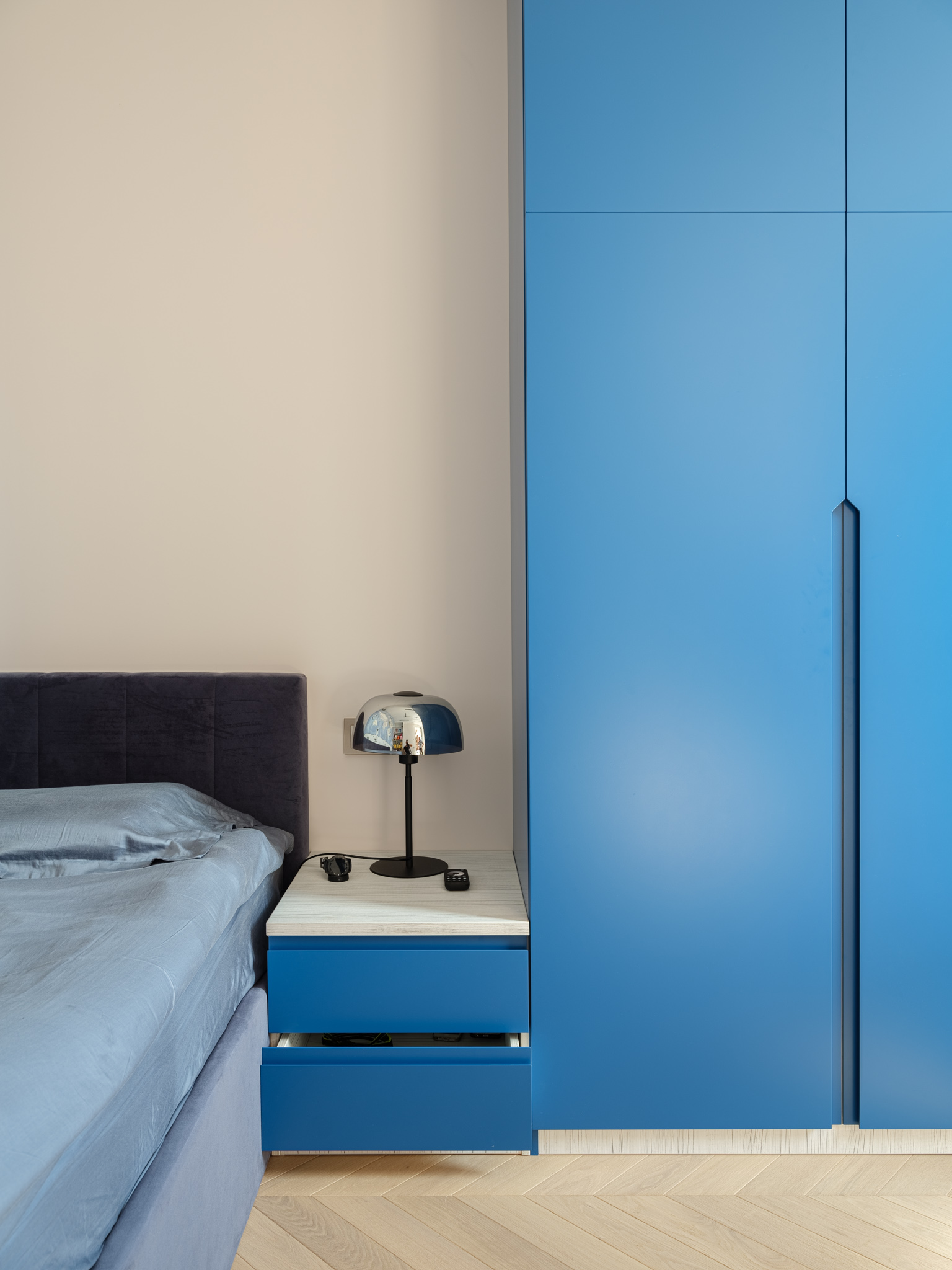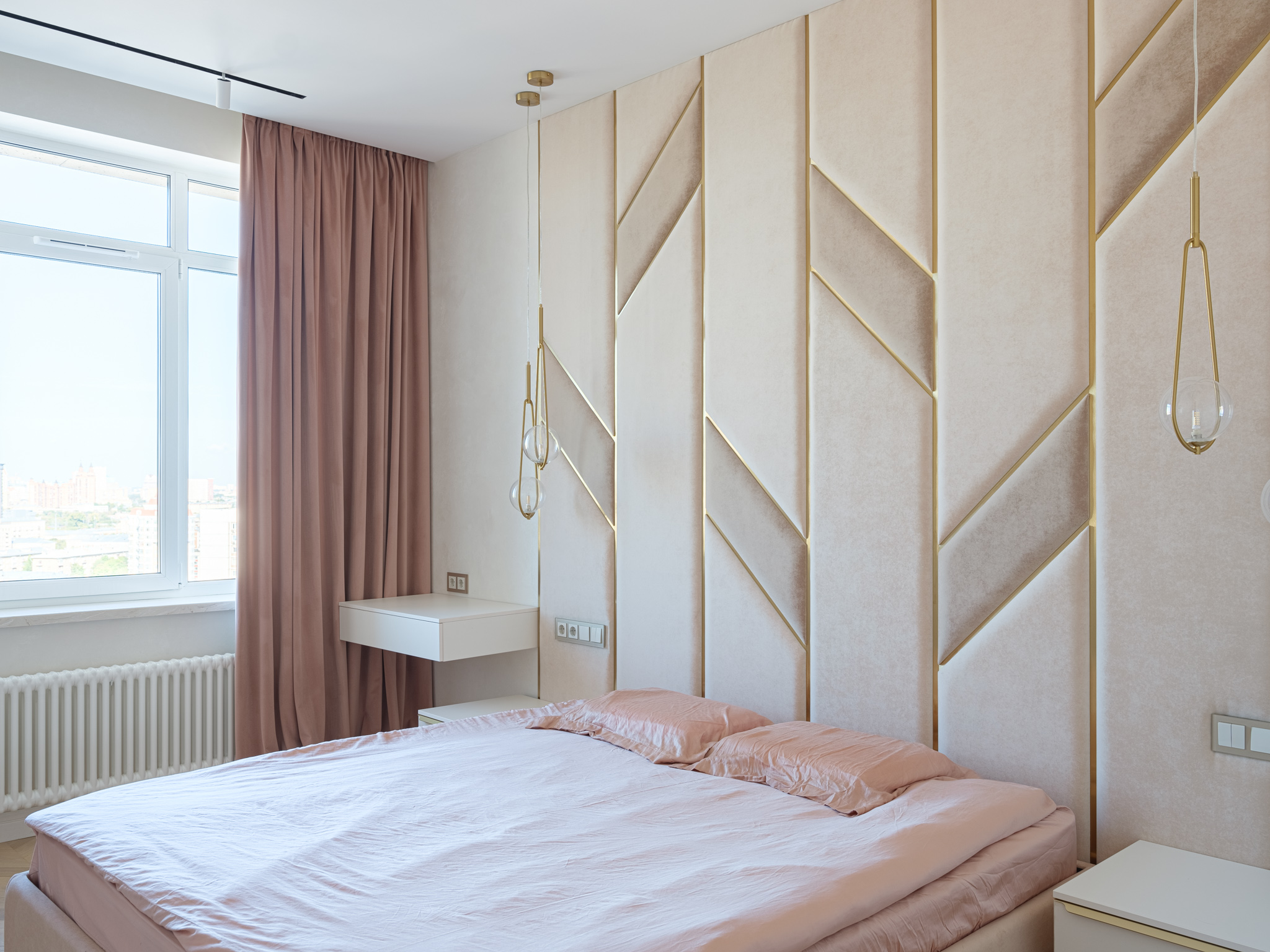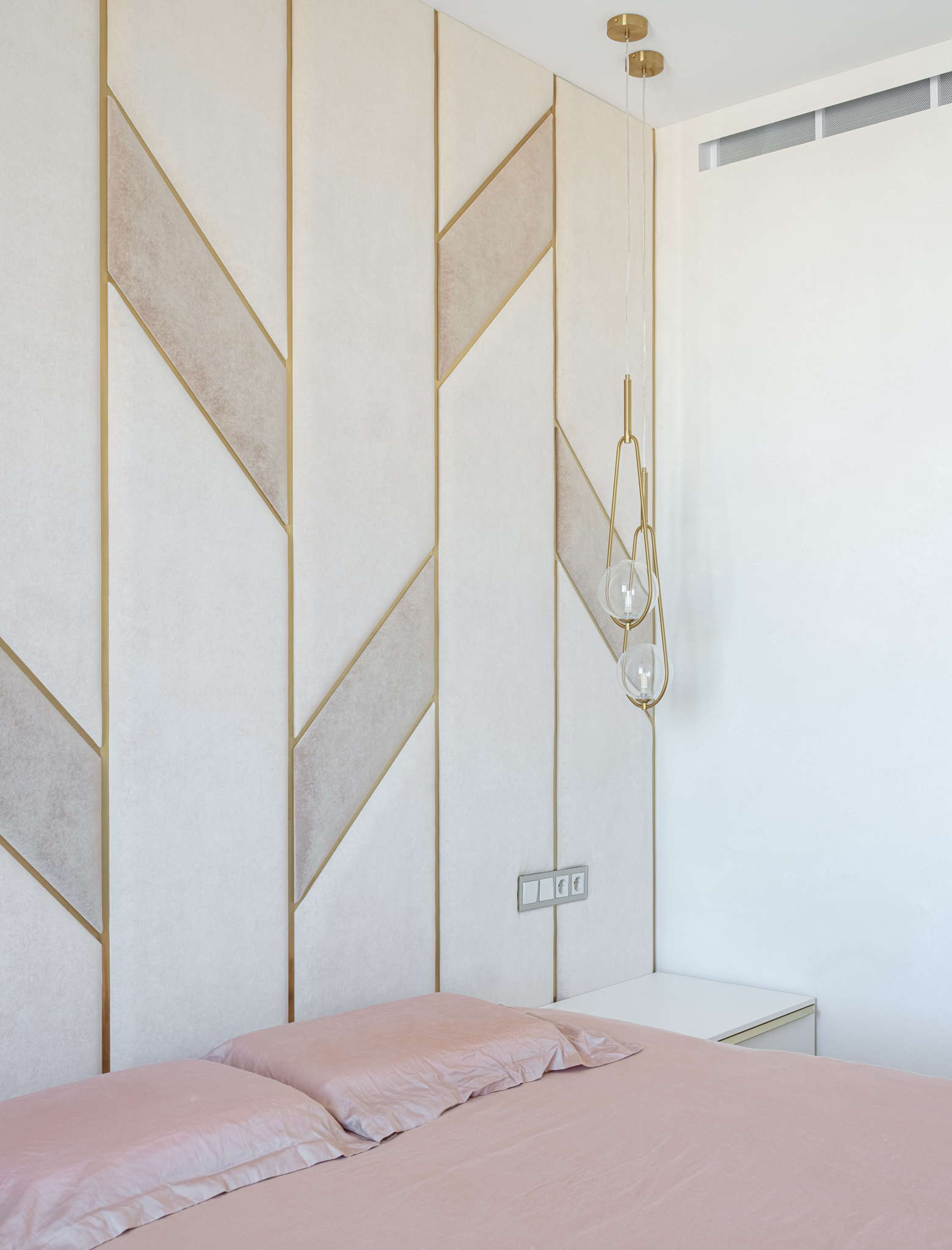 Спальня. Комната, где мы можем быть сами собой, где мы восстанавливаем силы и приводим мысли в порядок. Интерьер этой комнаты должен позволить расслабиться и почувствовать себя в безопасности. Мягкая стеновая панель с декоративными вставками из металлического профиля в золотом цвете придают комнате ощущение комфорта и спокойствия, делают атмосферу комнаты уютной и стильной.