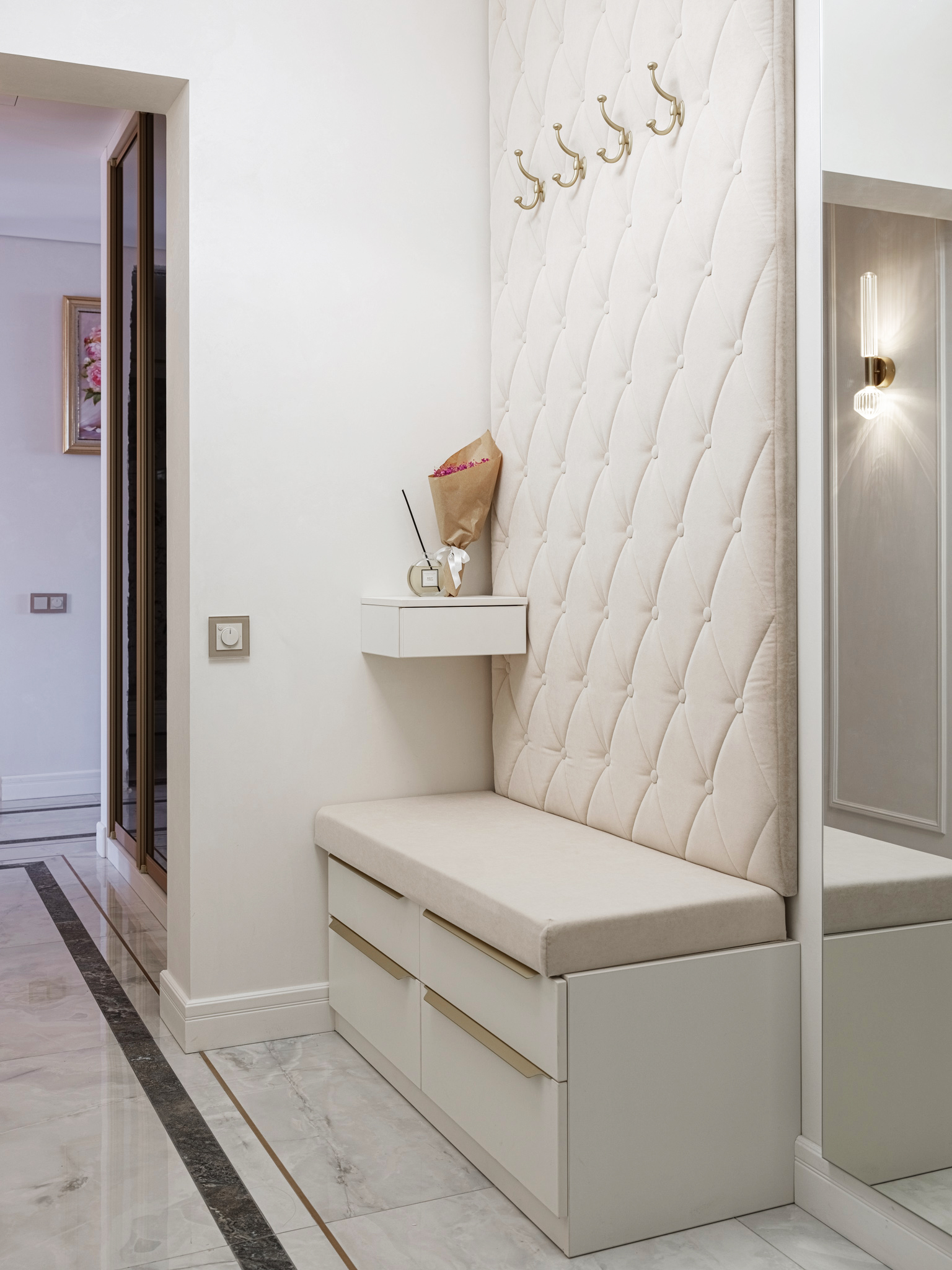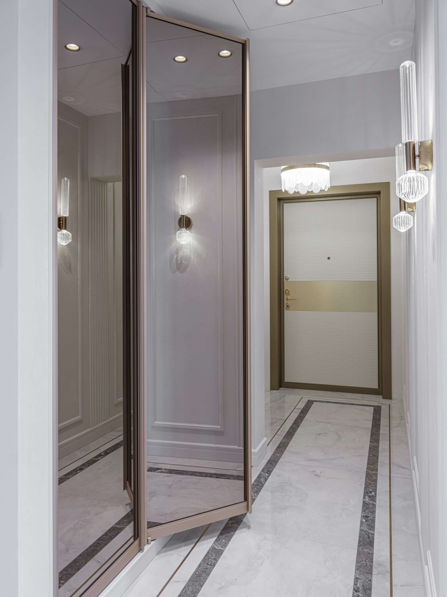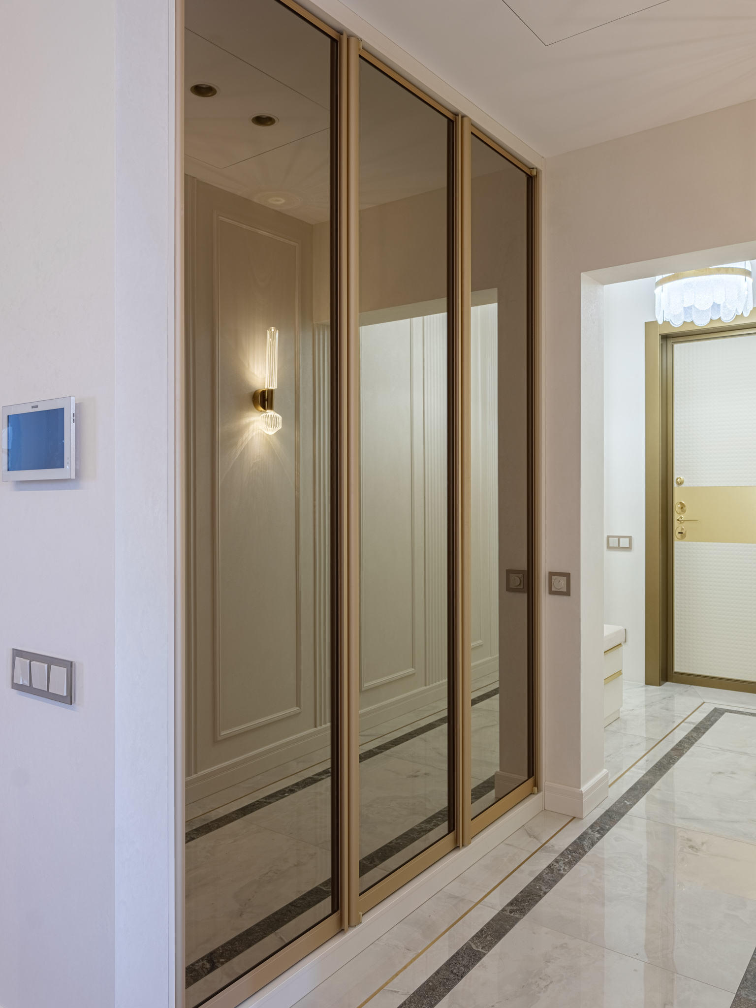 Итак, при входе в квартиру нас "встречает" прихожая с мягким элементом, где удобно расположить сумку и верхнюю одежду. Мягкий элемент с пиковкой придает изделию изысканный вид. Далее в нише за распашными зеркальными фасадами в алюминиевом профиле расположен встроенный шкаф для верхней одежды. Тонкие линии профиля и тонированное зеркало, которое отражает свет, создают иллюзию глубины пространства, поэтому шкаф не воспринимается как крупногабаритное изделие, а является функциональным дополнением прихожей.