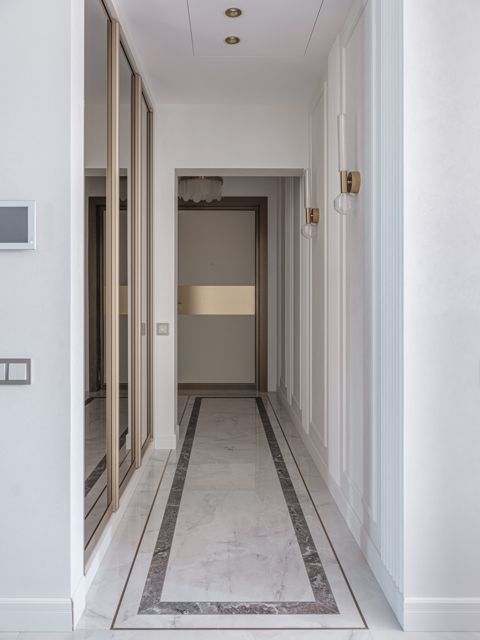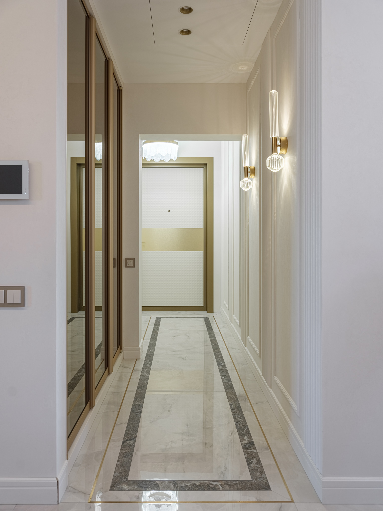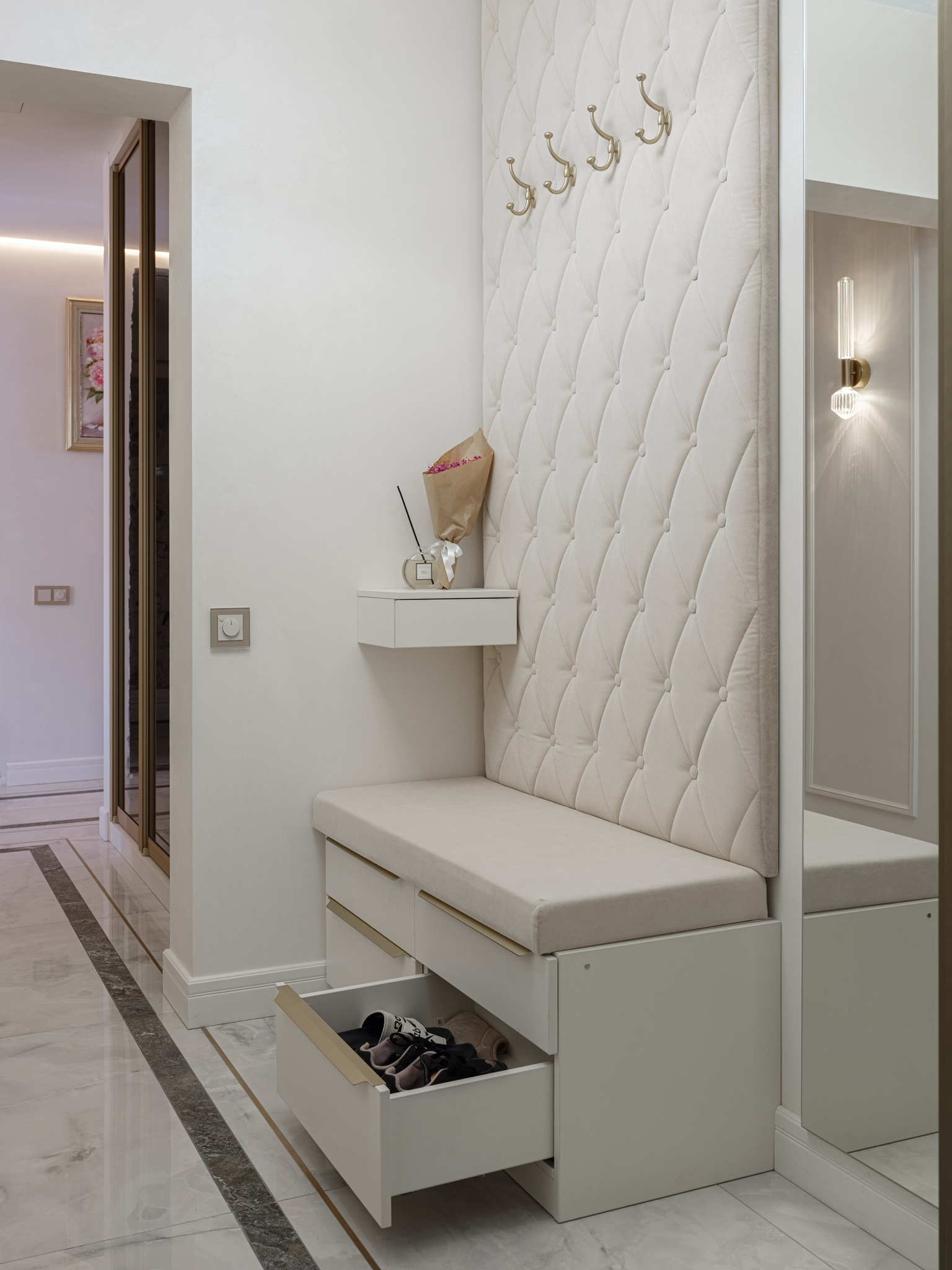 Итак, при входе в квартиру нас "встречает" прихожая с мягким элементом, где удобно расположить сумку и верхнюю одежду. Мягкий элемент с пиковкой придает изделию изысканный вид. Далее в нише за распашными зеркальными фасадами в алюминиевом профиле расположен встроенный шкаф для верхней одежды. Тонкие линии профиля и тонированное зеркало, которое отражает свет, создают иллюзию глубины пространства, поэтому шкаф не воспринимается как крупногабаритное изделие, а является функциональным дополнением прихожей.