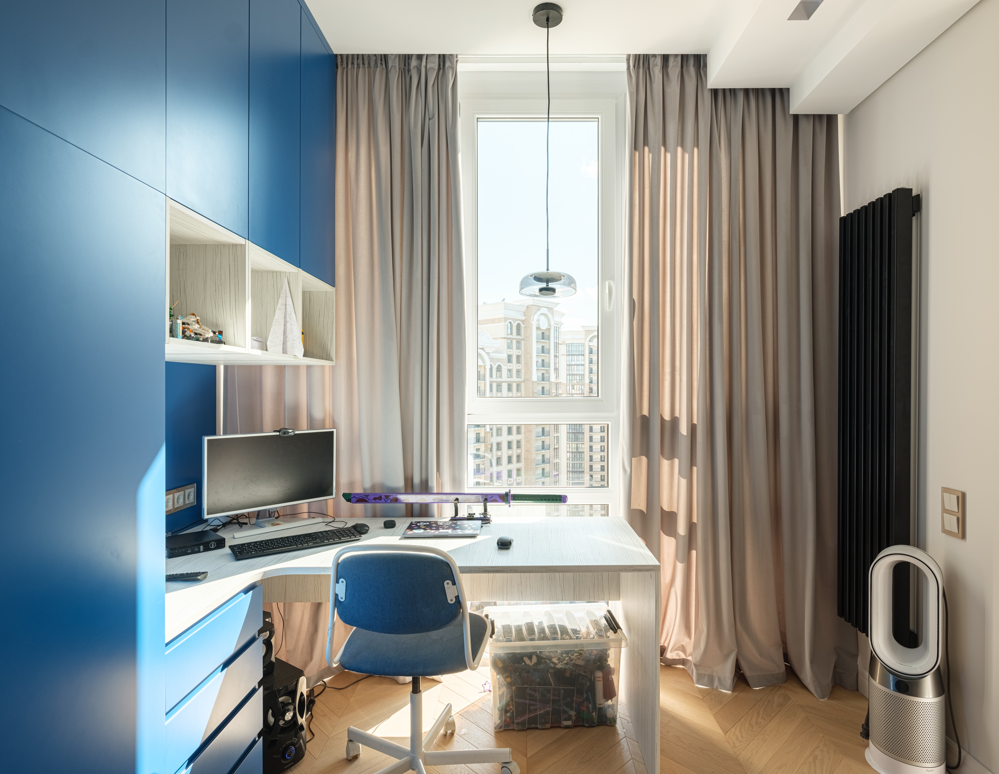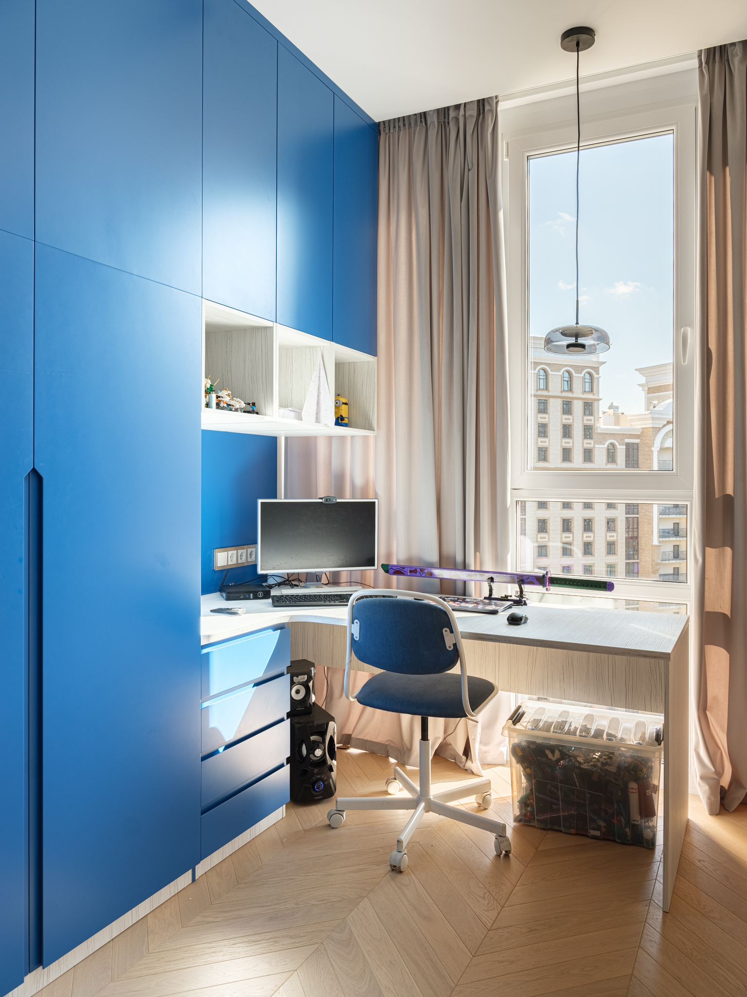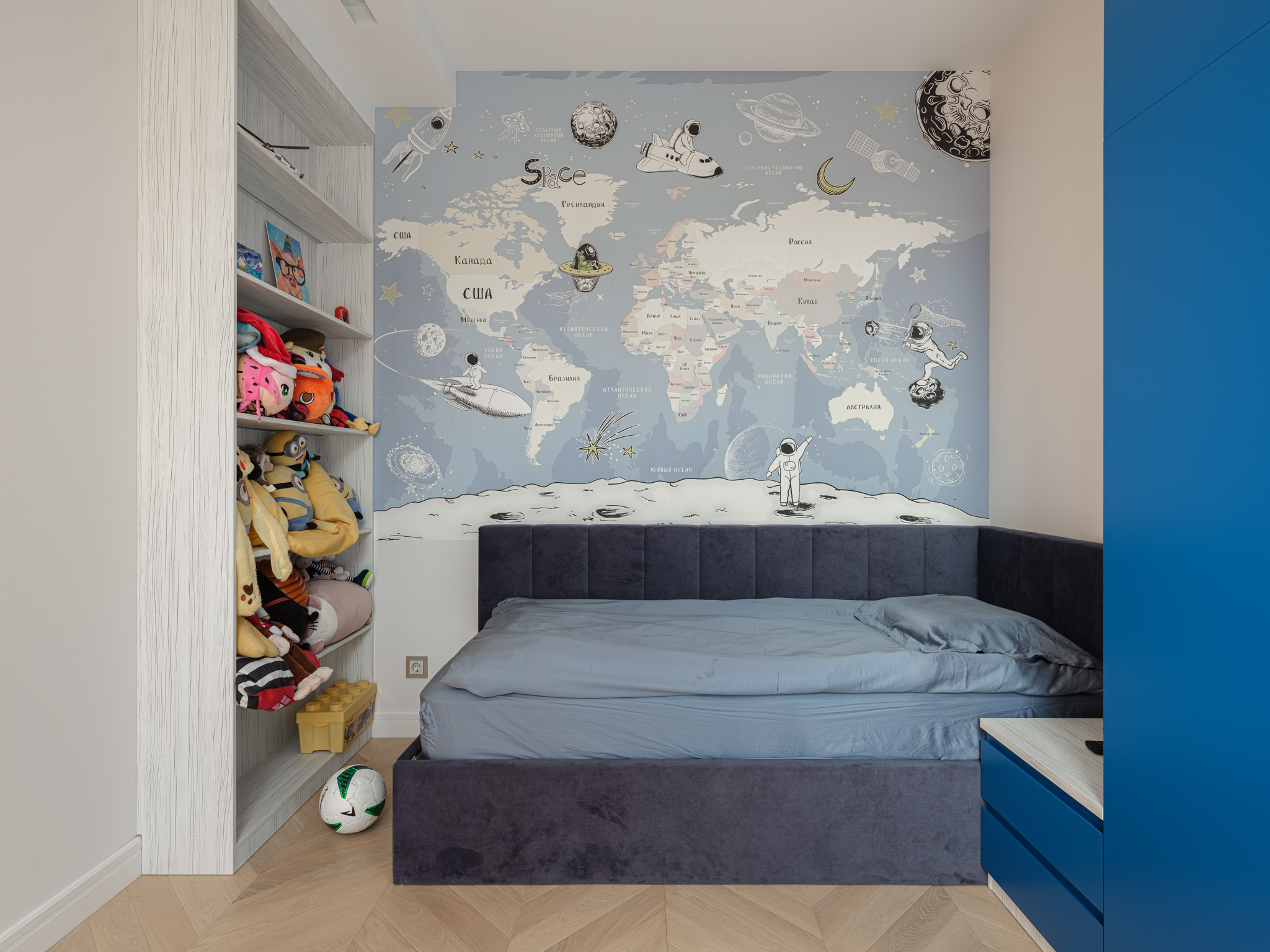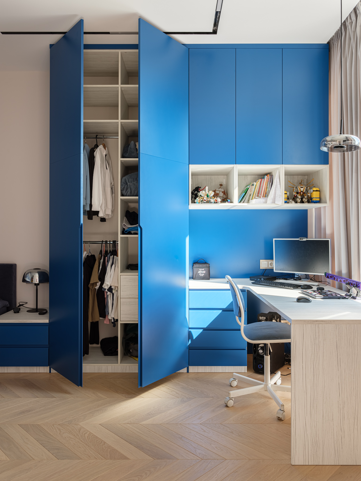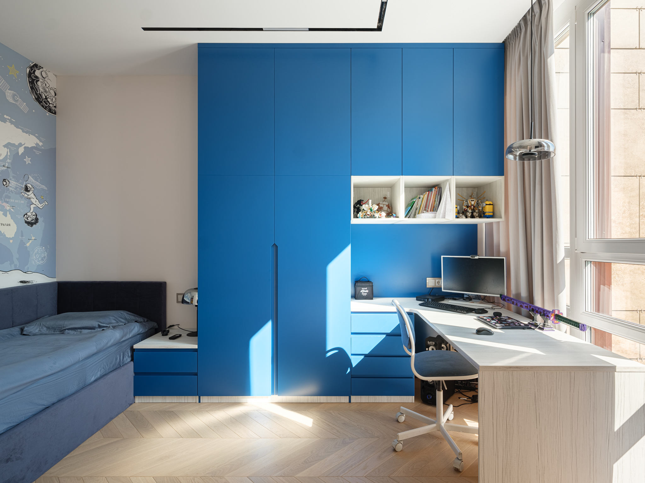 Шкаф в комнате мальчика - это комплексное решение, которое закрывает вопрос хранения вещей и организации рабочей зоны. Изделие спроектировано с учетом особенностей комнаты и потребностей владельца комнаты. Зона отдыха оборудована открытым стеллажом для хранения самых любимых игрушек, а у кровати расположилась прикроватная тумба, которая является продолжение мебельного гарнитура.