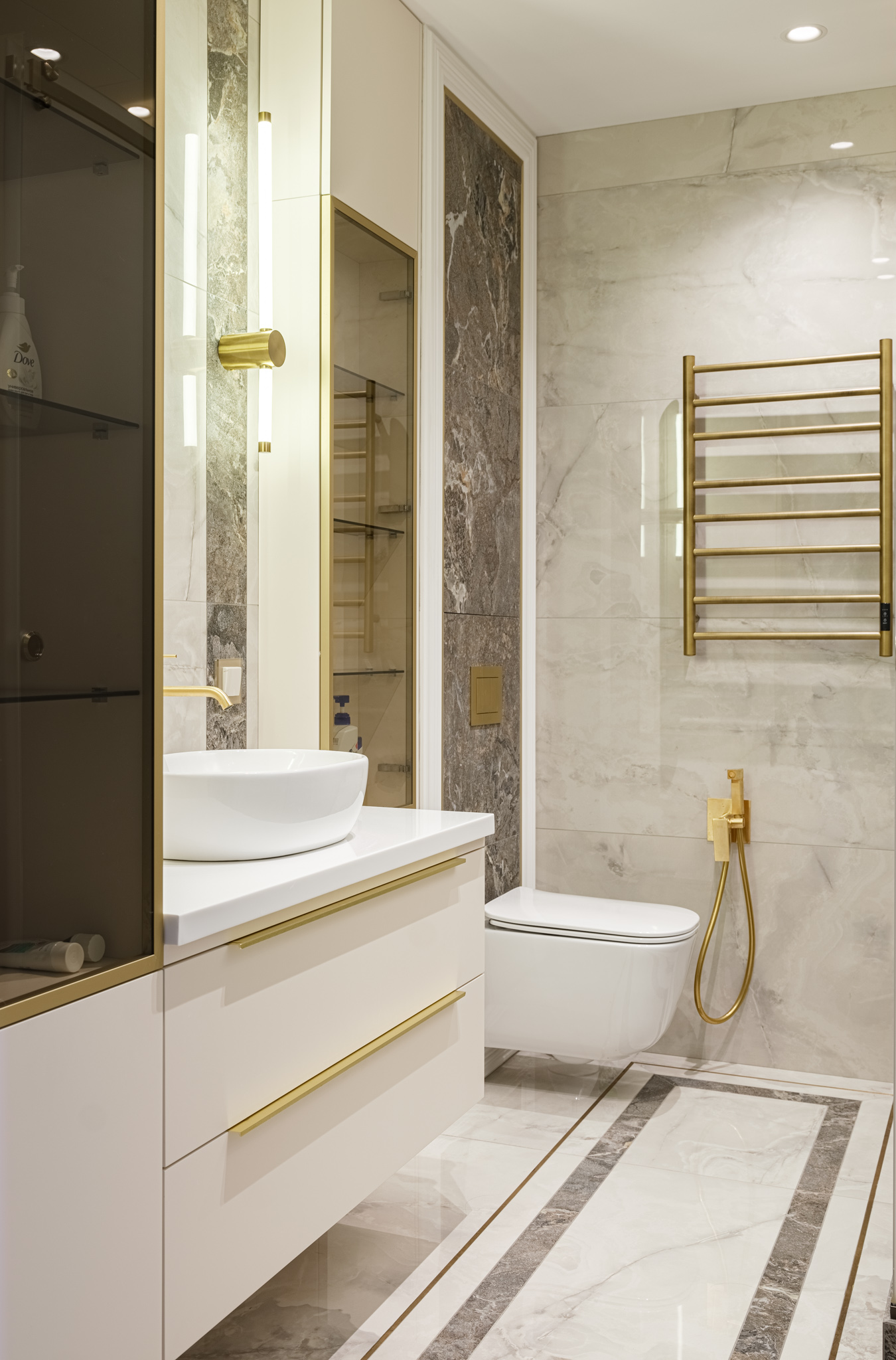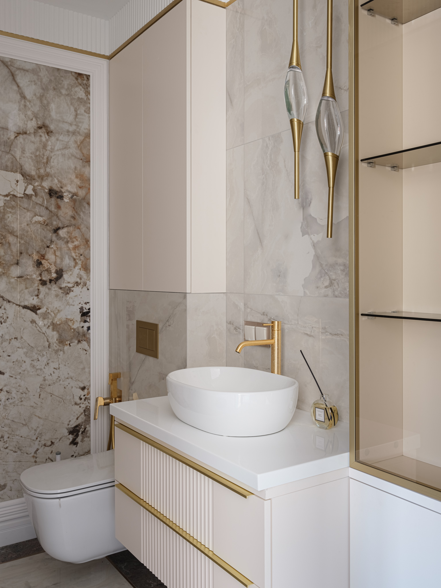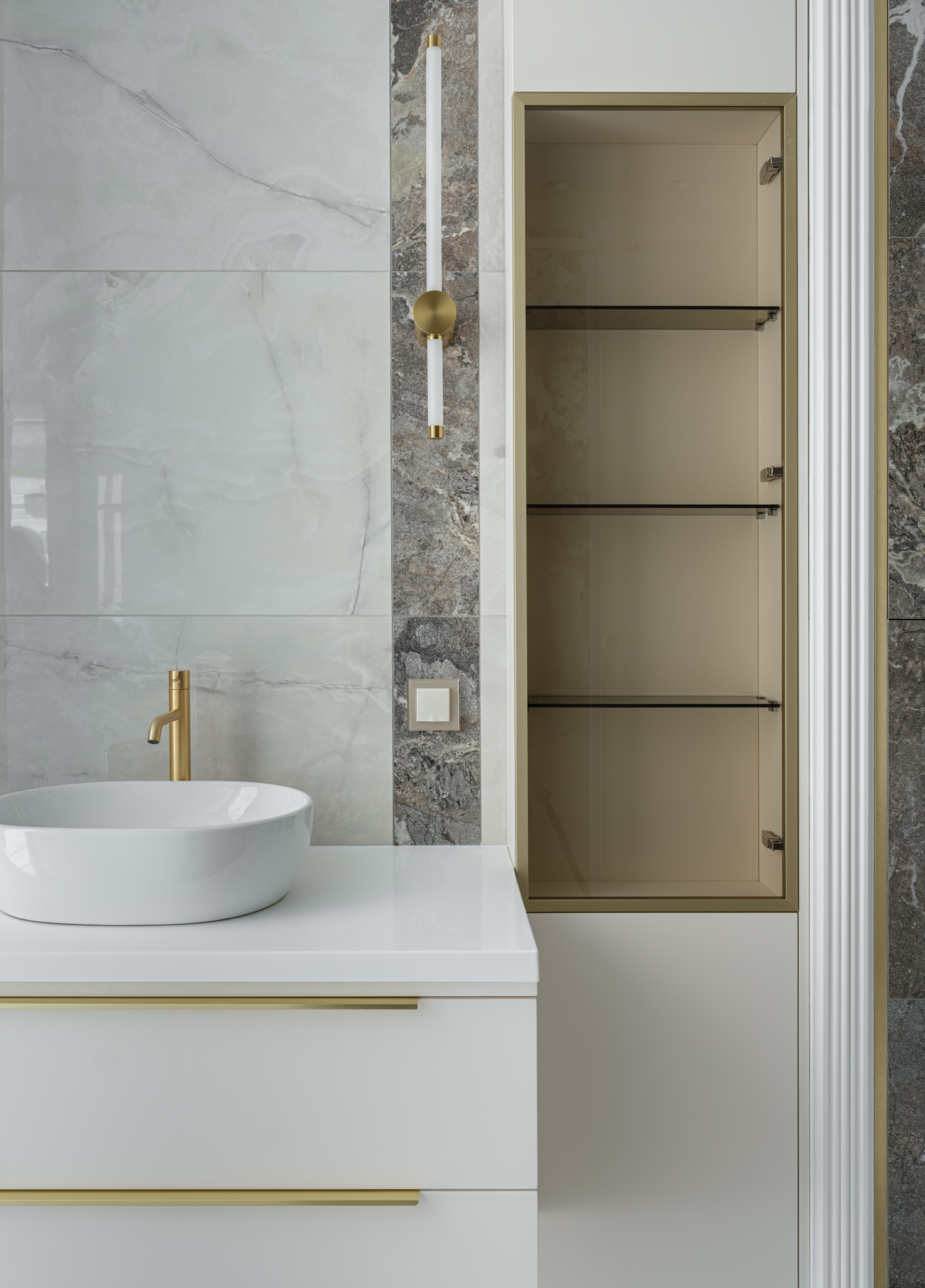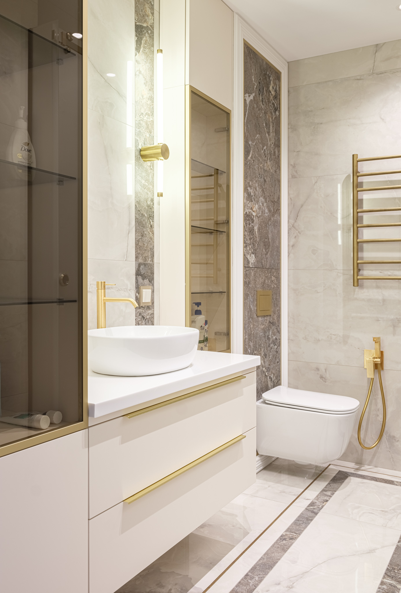 Мебель в санузел выполнена из МДФ с с двухсторонним покрасом по NCS. Стекло в тонком профиле придает изделию легкости, а ручки и профиль в цвете "золото" идеально дополняют мебель и интерьер в целом.