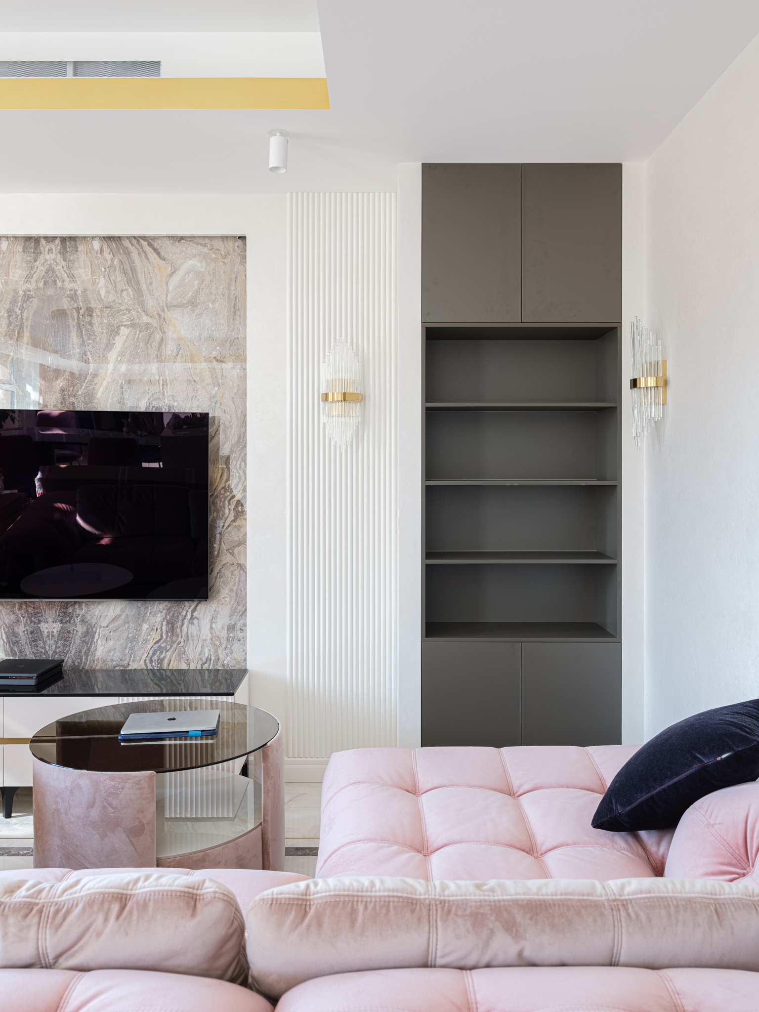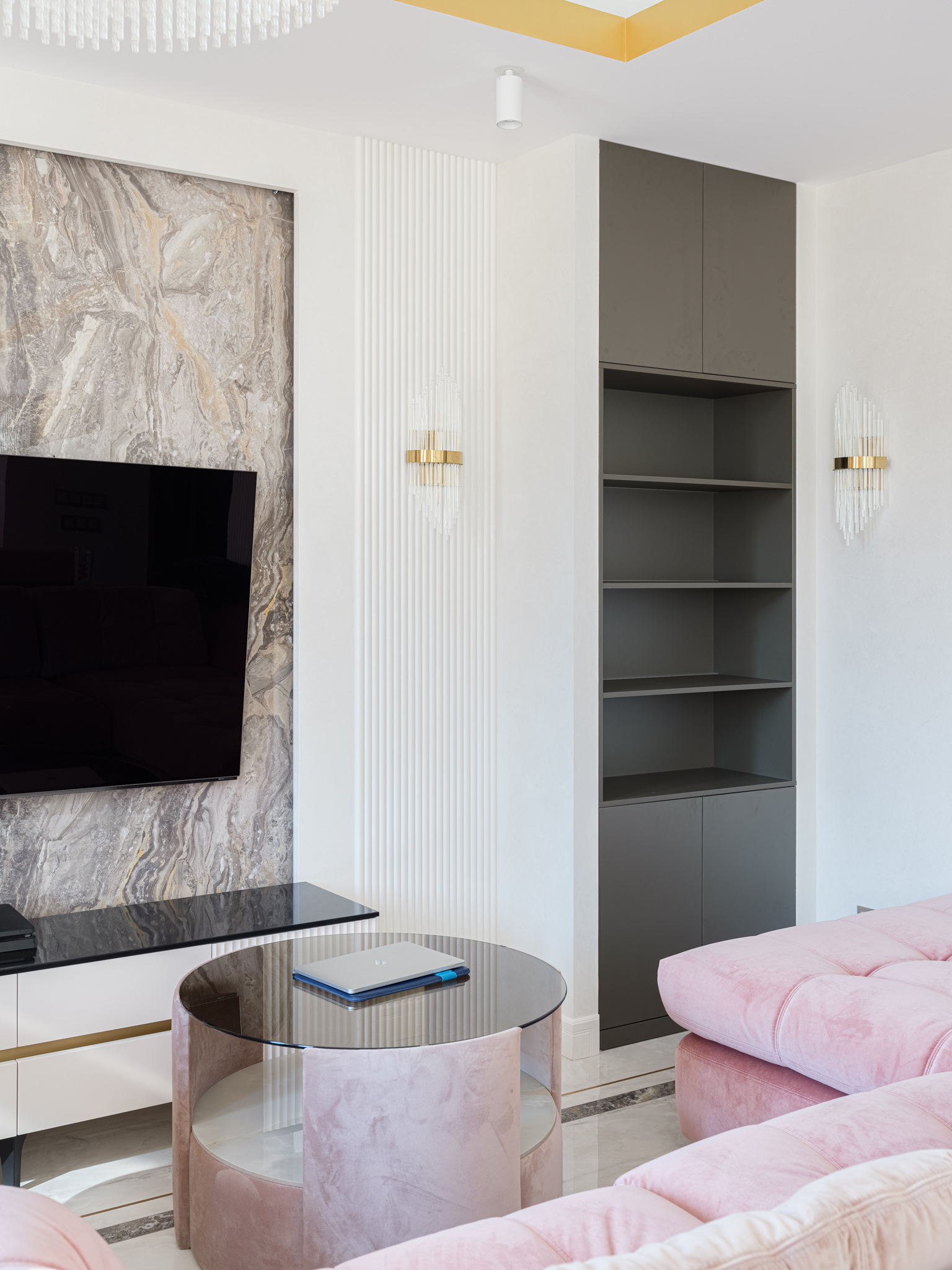В гостиной установлены два встроенных в нишу стеллажа с открытыми и закрытыми полками, где удобно на открытых полках расположить декоративные элементы/книги и спрятать от посторонних глаз что-то личное за распашными фасадами.