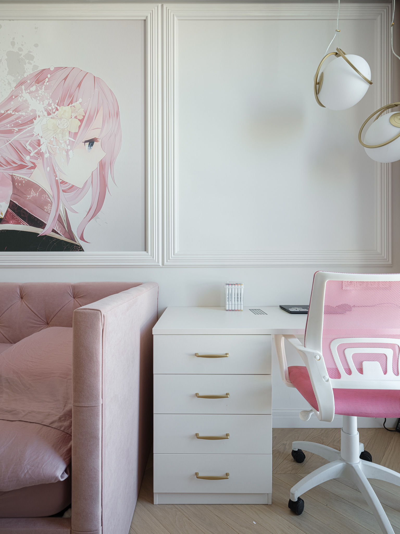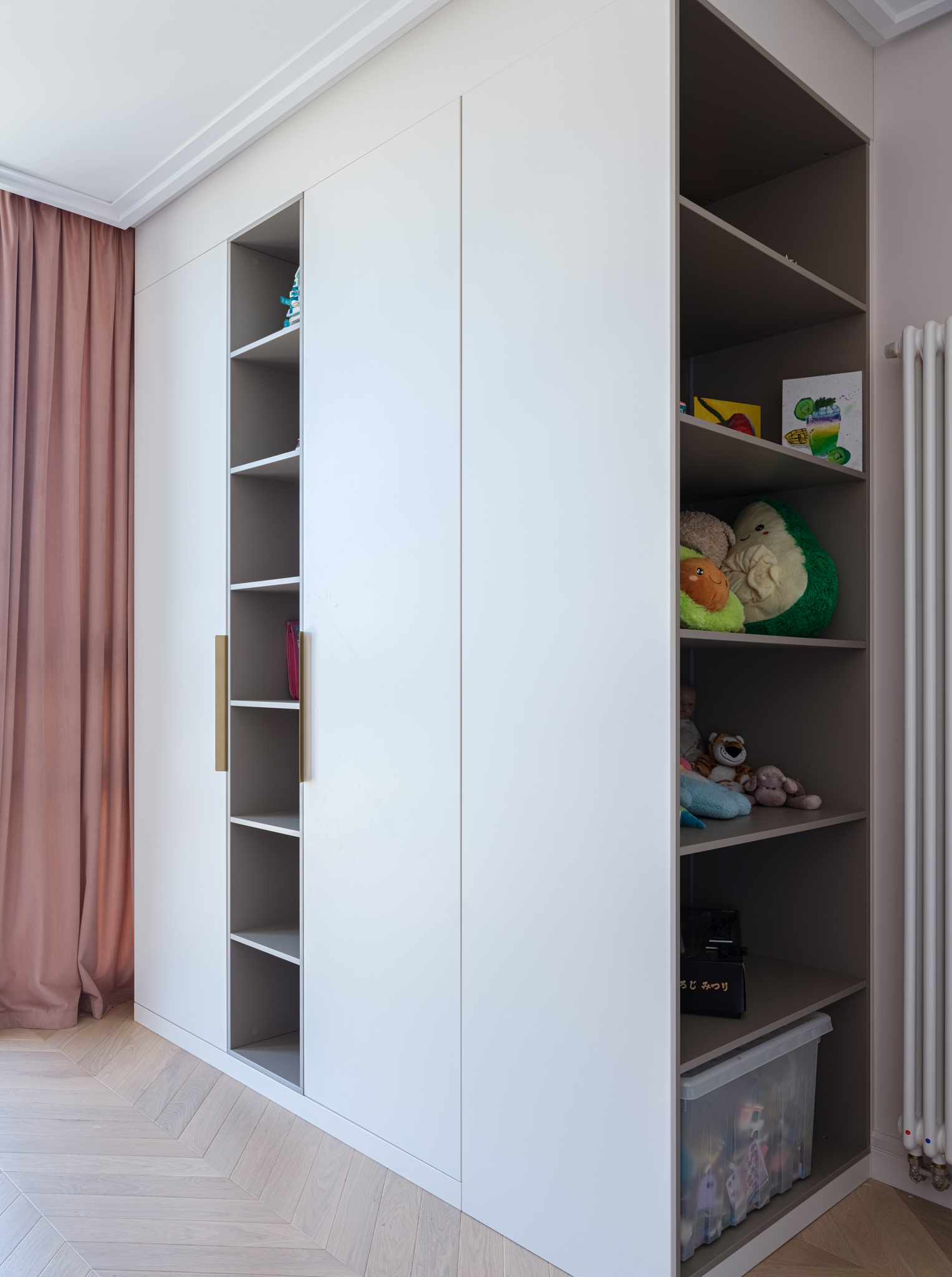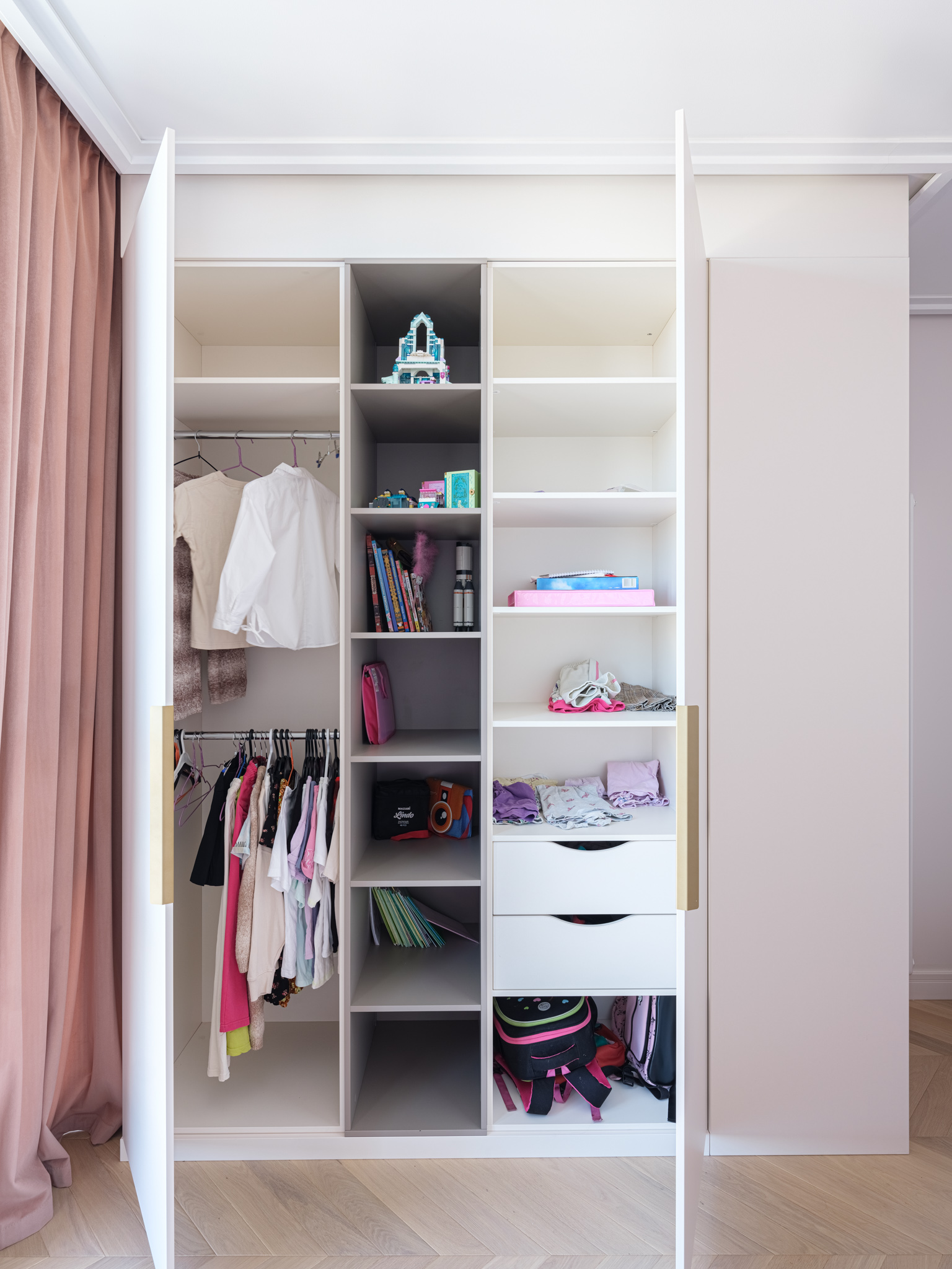 Детские. Встроенный распашной шкаф в комнате девочки - это идеальное решение для экономии пространства и организации хранения вещей. Такое расположение шкафа позволяет максимально эффективно использовать доступное пространство. Здесь предусмотрено место для хранения одежды, игрушек и школьных принадлежностей. При этом есть как закрытые ниши, так и открытые, которые "облегчают" изделие и делают его более стильным, менее громоздким.