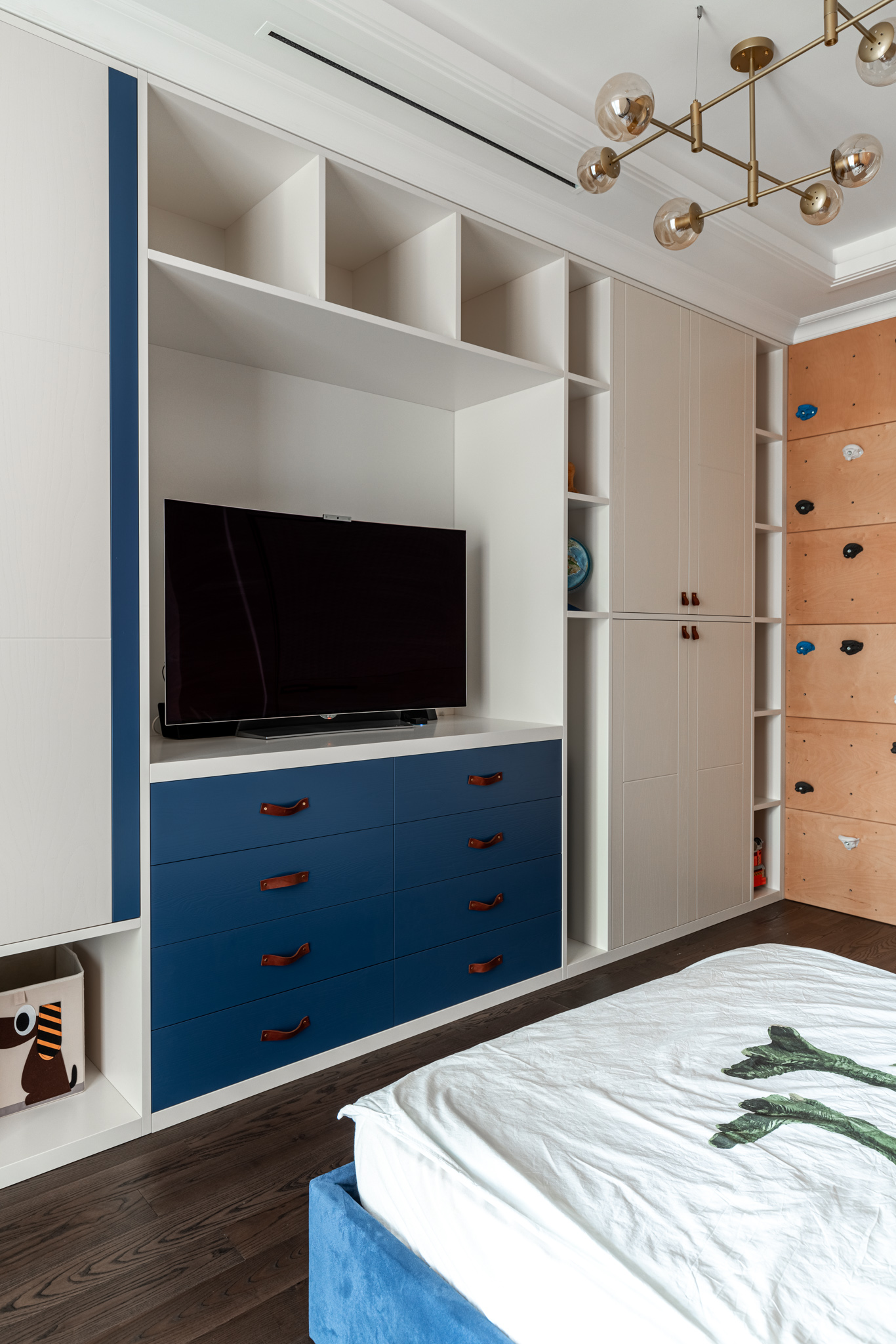 Напротив кровати расположена система хранения с ТВ-зоной. Фасад изделия выполнен из шпона ясеня коллекции "Сохо", а корпус - из МДФ эмаль с покрасом по RAL.