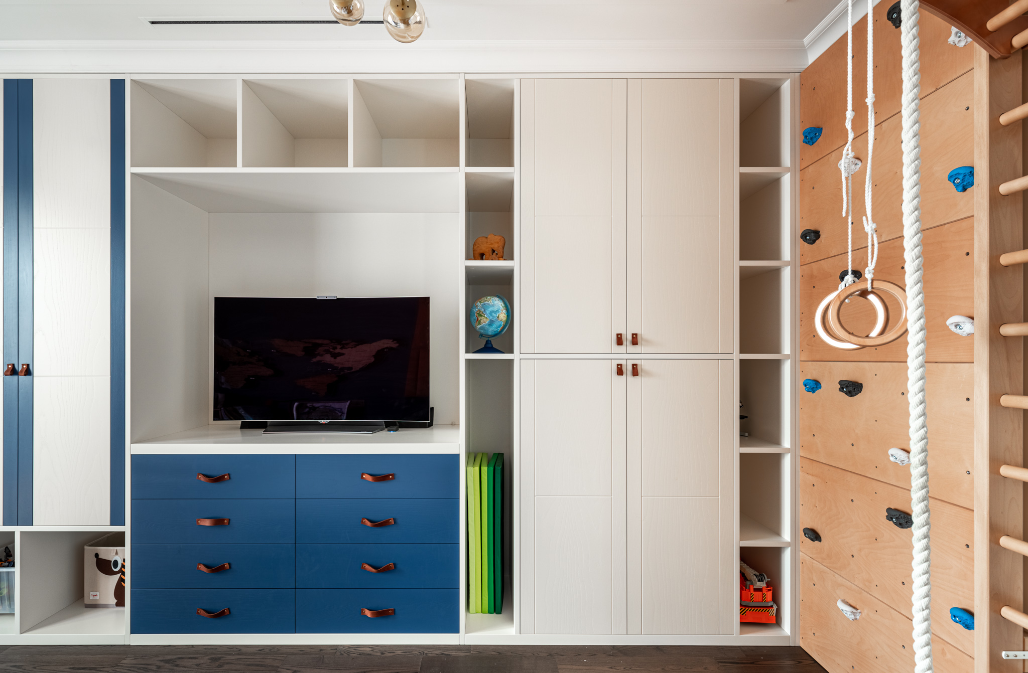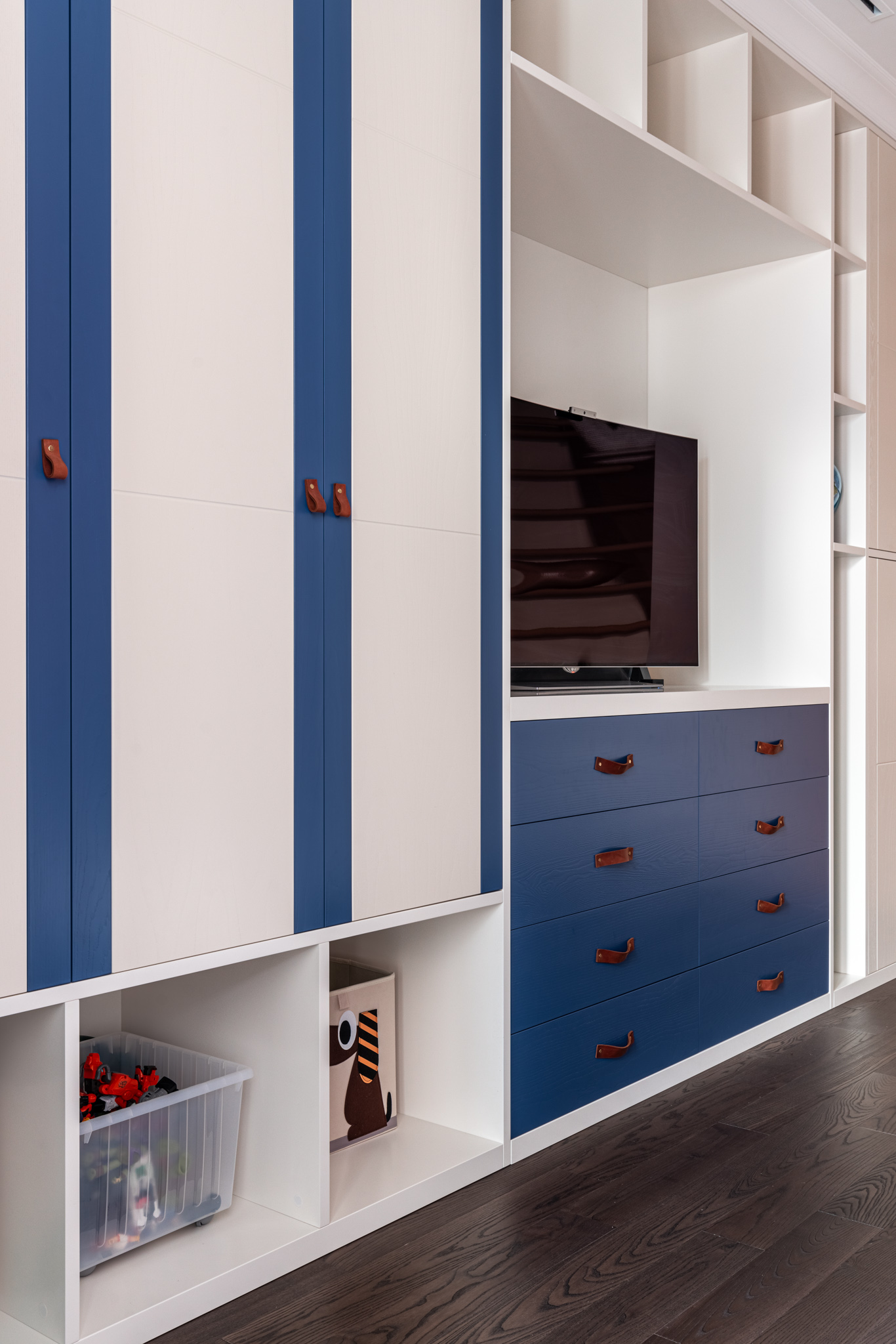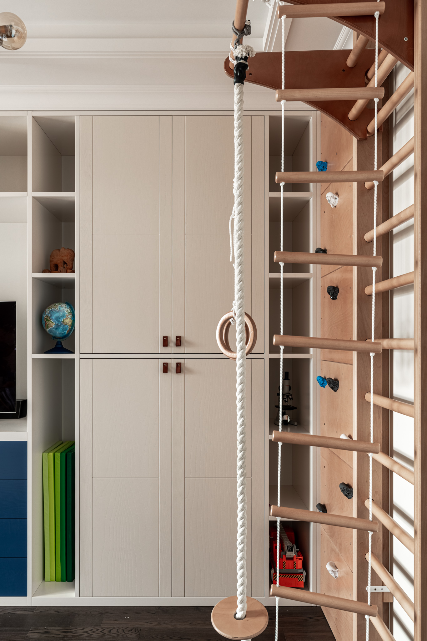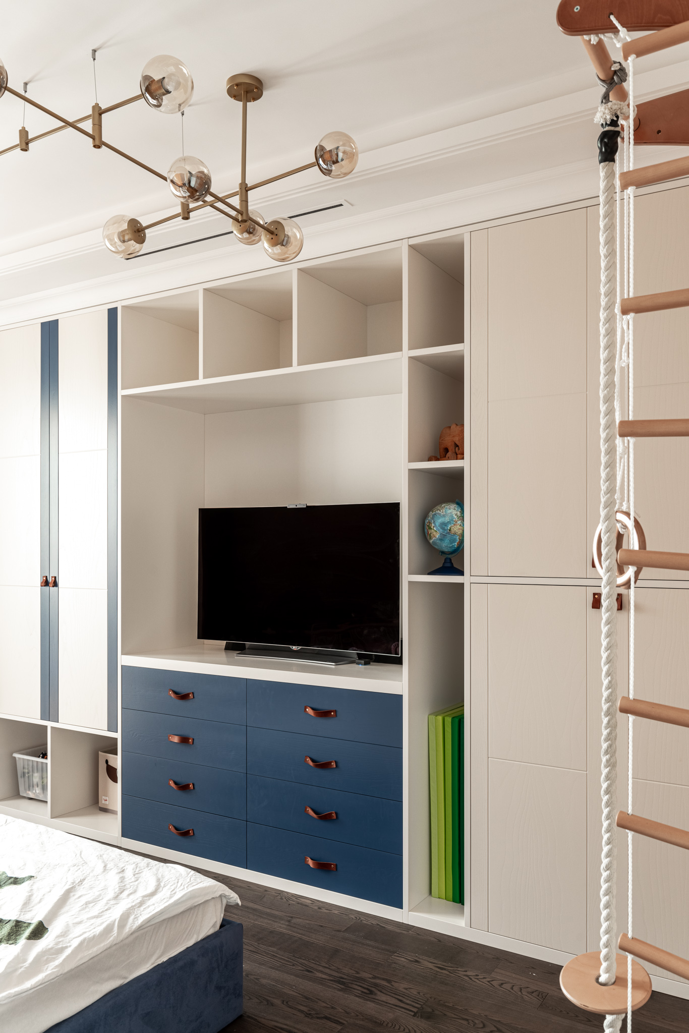 Особое обаяние этому изделию придают кожаные ручки на дверцах. Это уникальное решение, которое стильно смотрится и соотносится с оформлением детской.