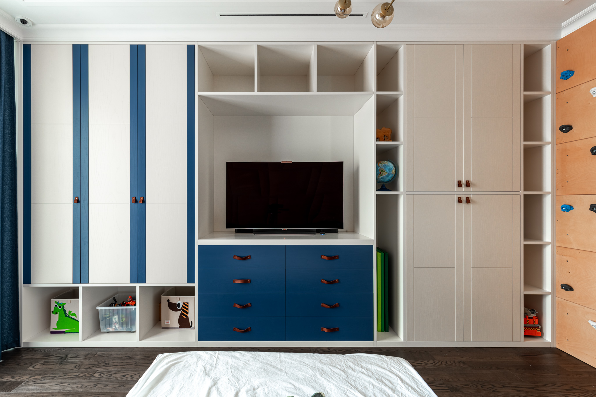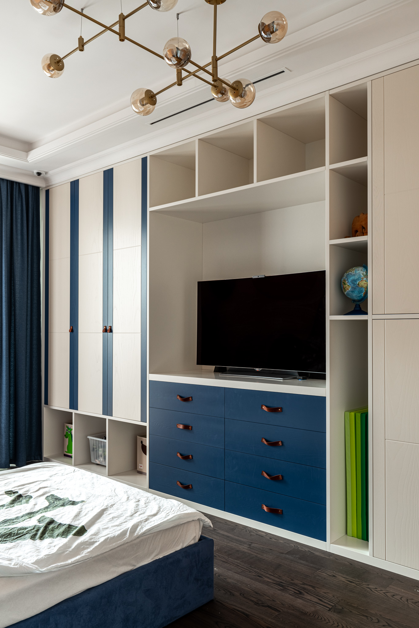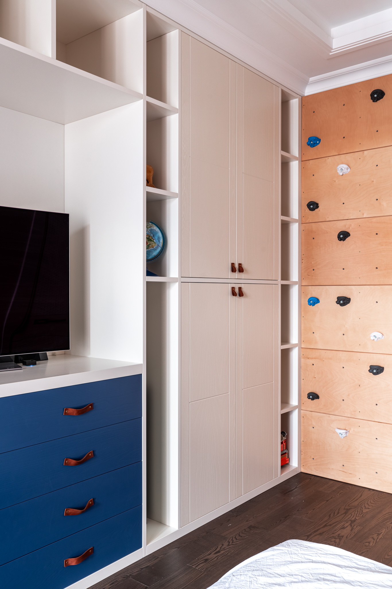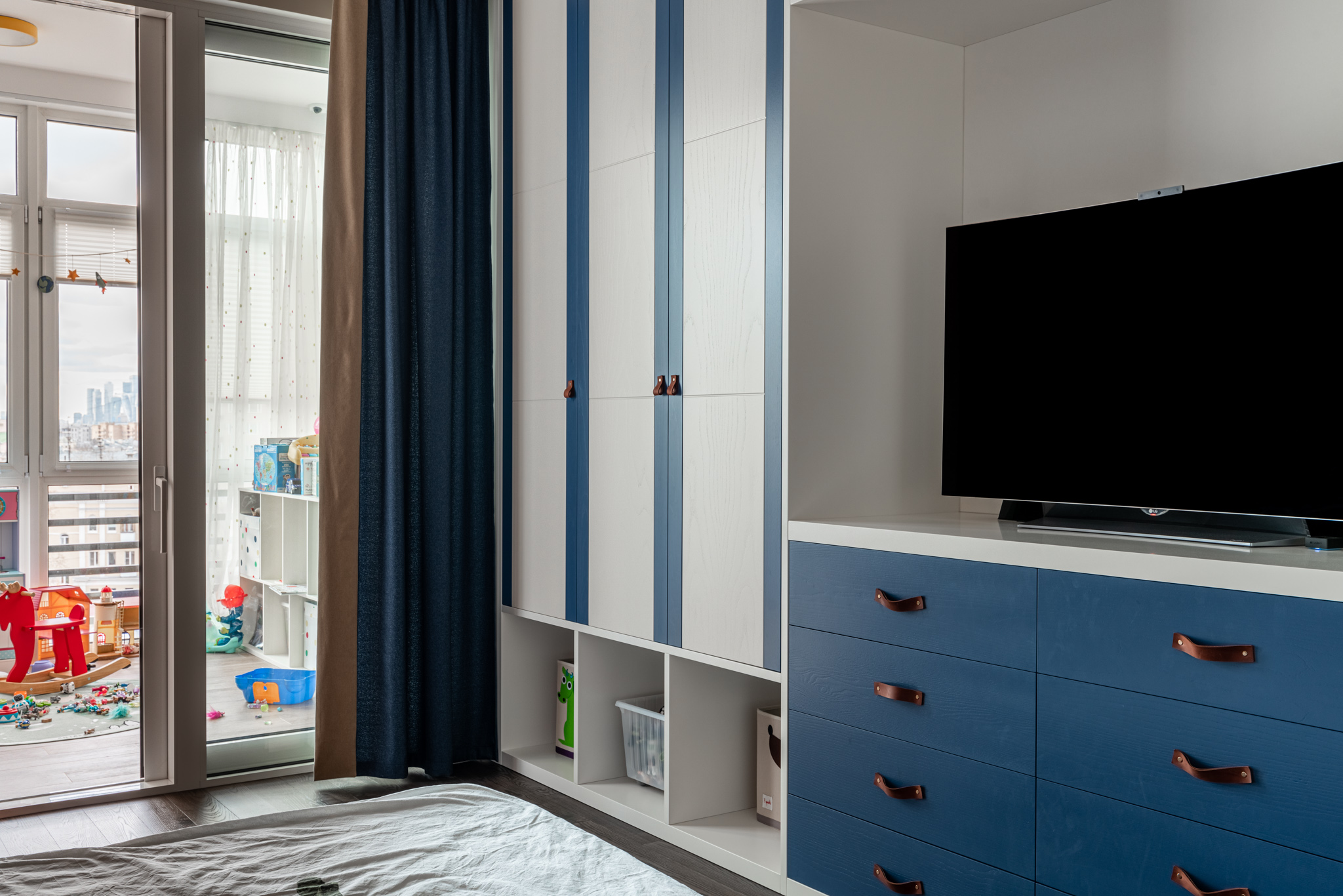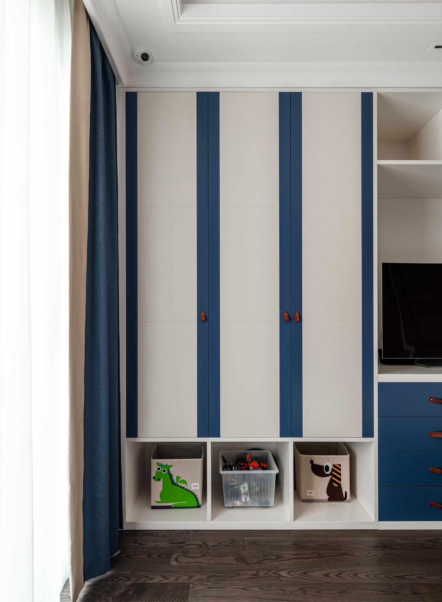 Особое обаяние этому изделию придают кожаные ручки на дверцах. Это уникальное решение, которое стильно смотрится и соотносится с оформлением детской.