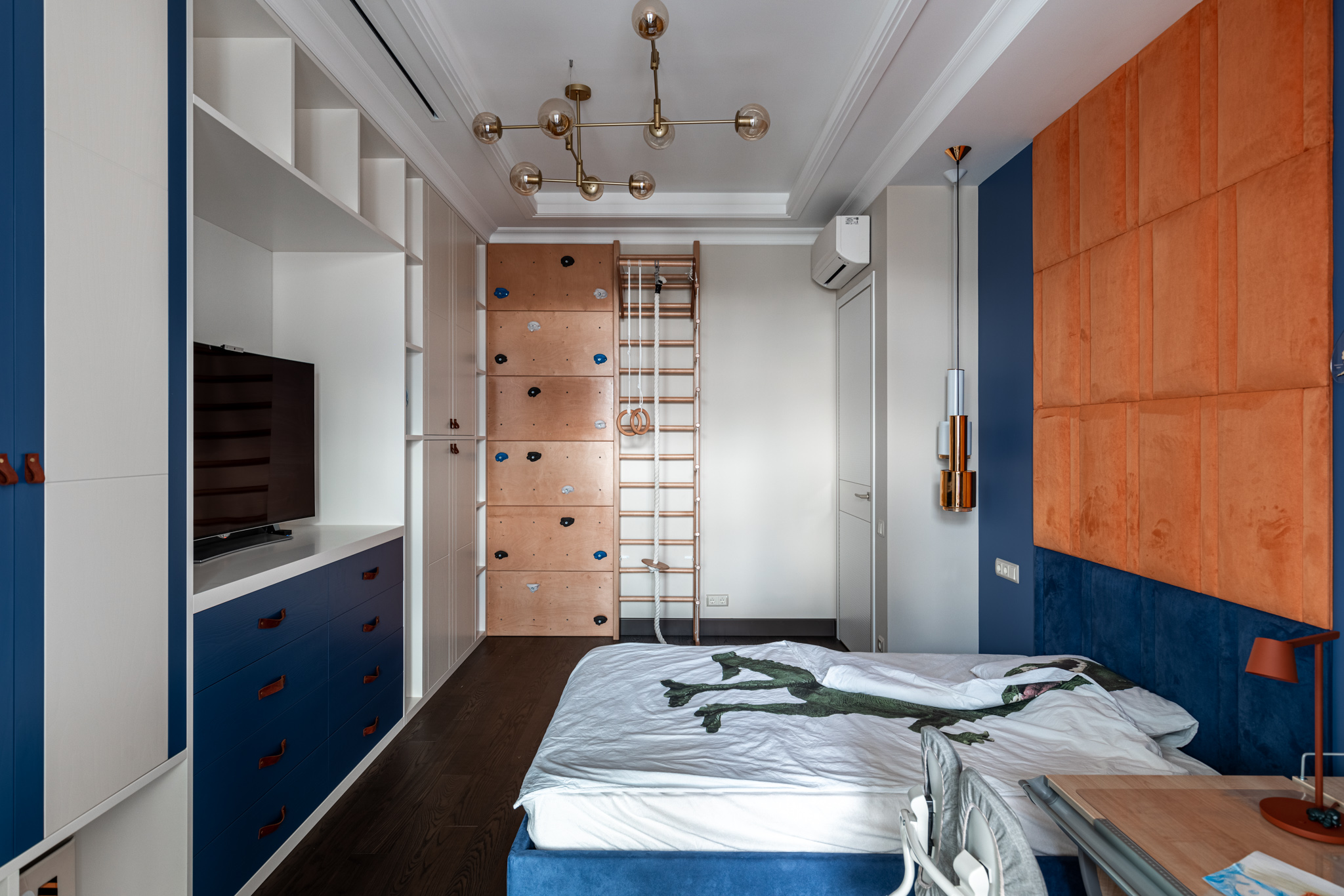 В этом проекте эту мечту удалось осуществить. Уют достигается сочетанием гармонирующих друг с другом цветов, а комфорт - удобным расположением мебели, изготовленной на заказ. Именно изготовление мебели по индивидуальным размерам позволяет как учесть все пожелания ребенка и родителя, так и не упустить особенности помещения.