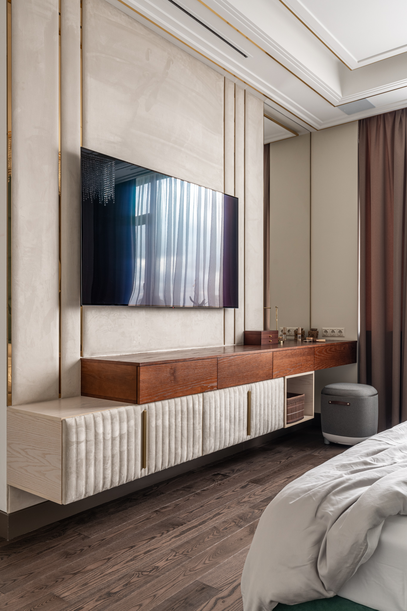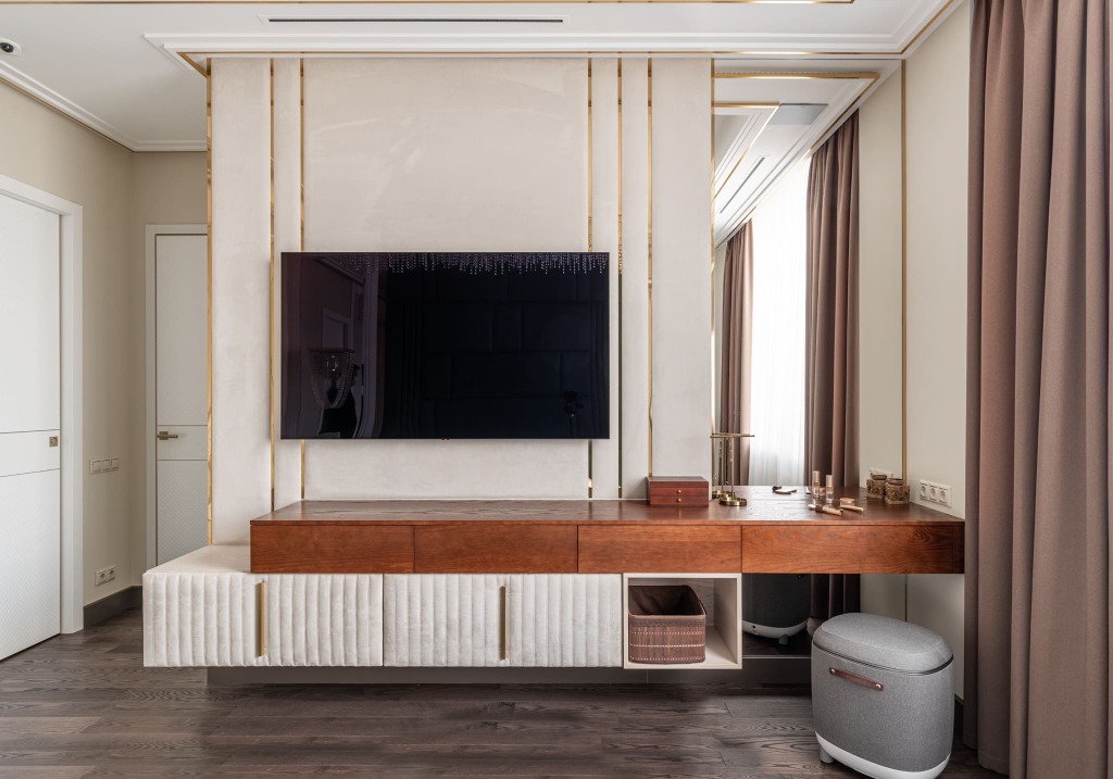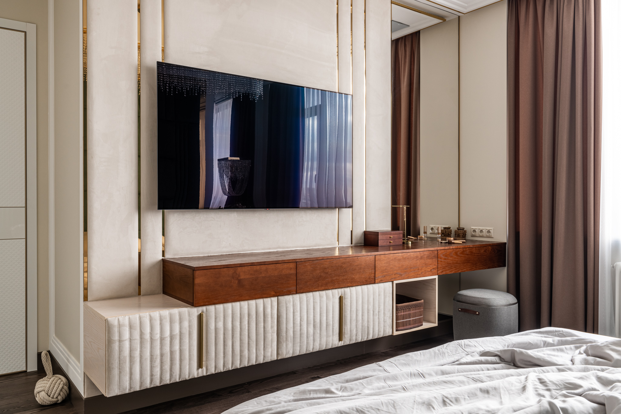 Под телевизором расположена навесная консоль, которая представляет собой дополнительное место хранения и акцентирует внимание на отдельной части интерьера спальни.
