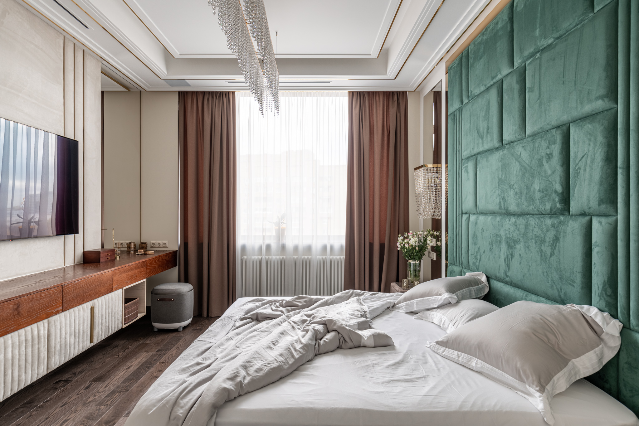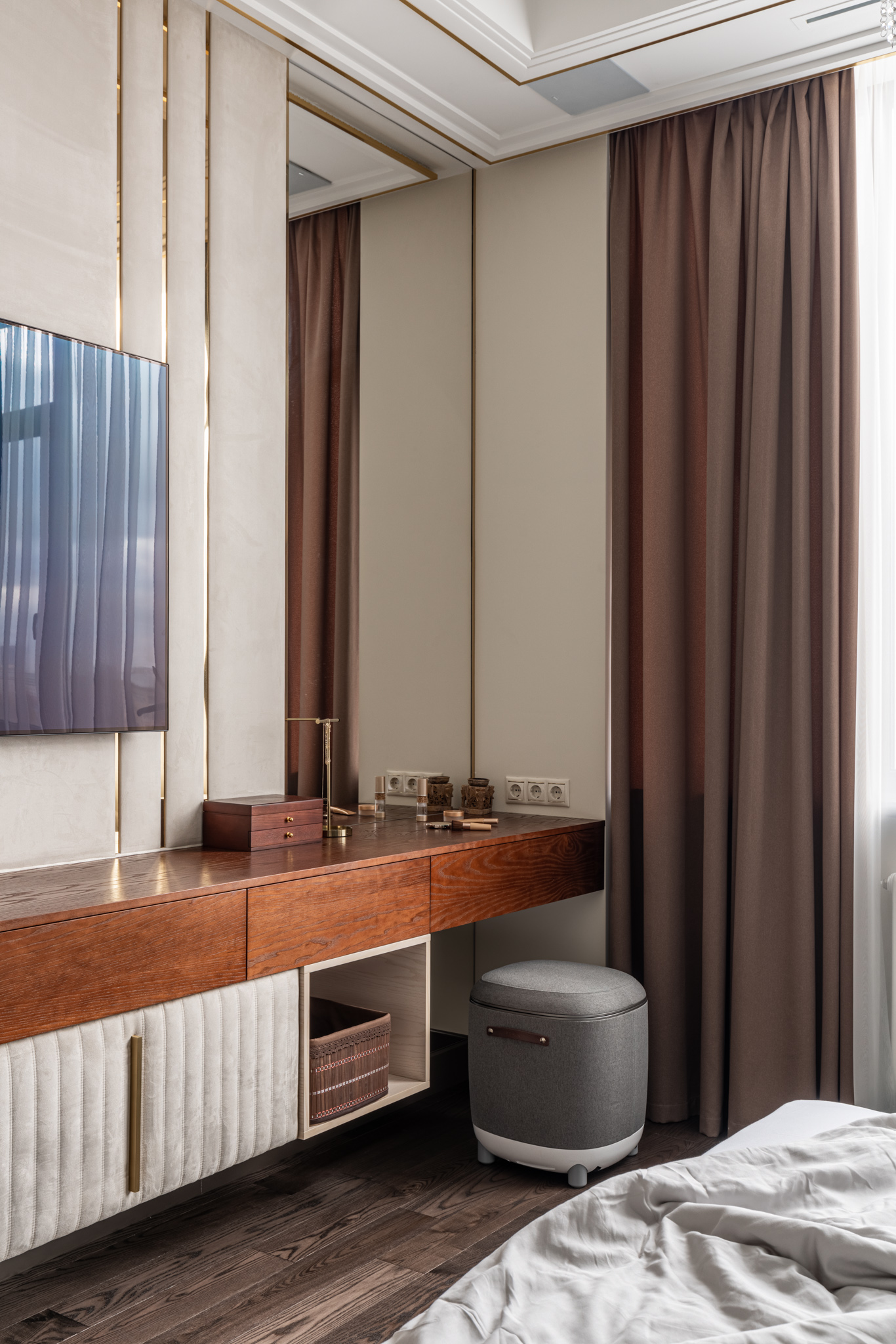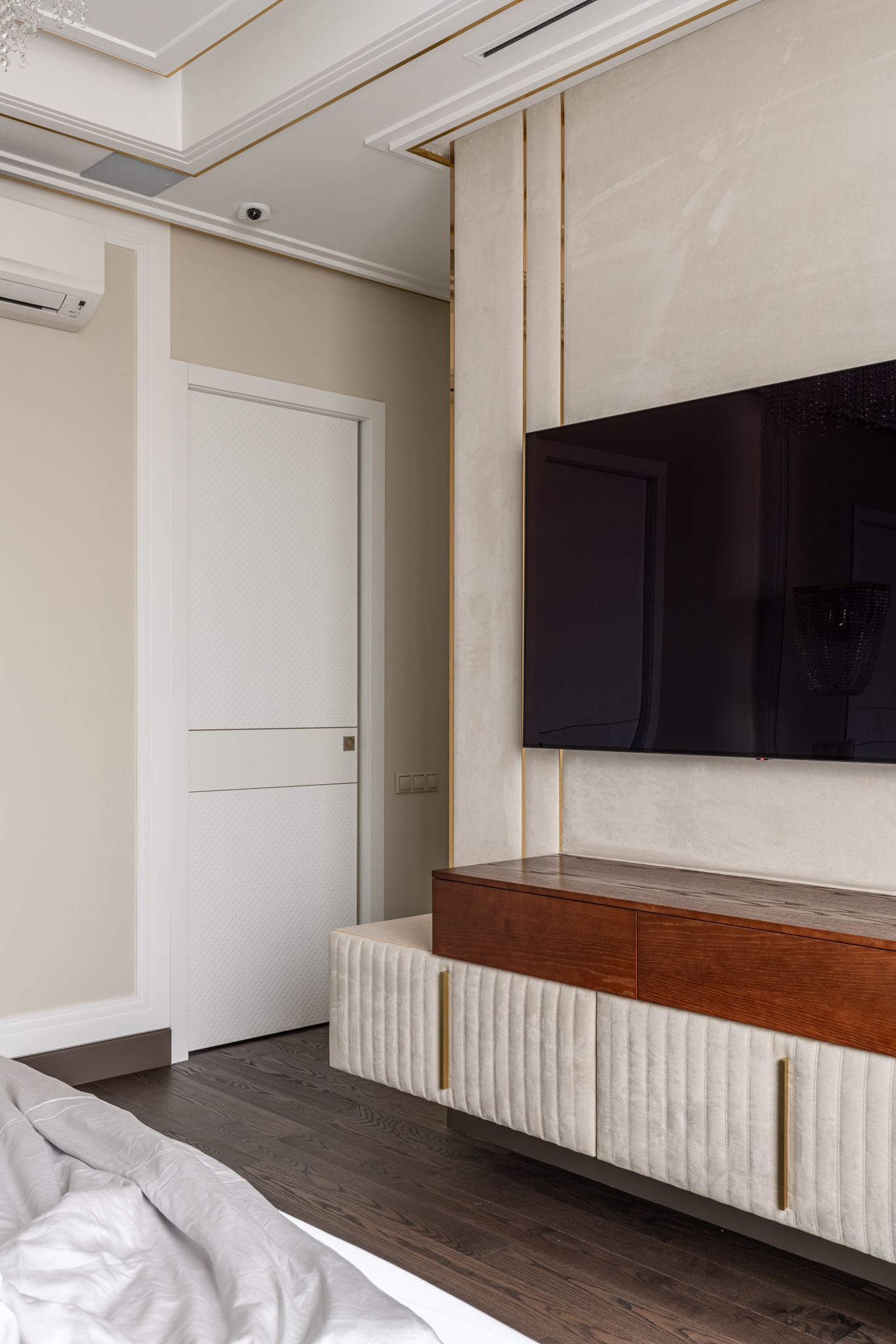 Под телевизором расположена навесная консоль, которая представляет собой дополнительное место хранения и акцентирует внимание на отдельной части интерьера спальни.