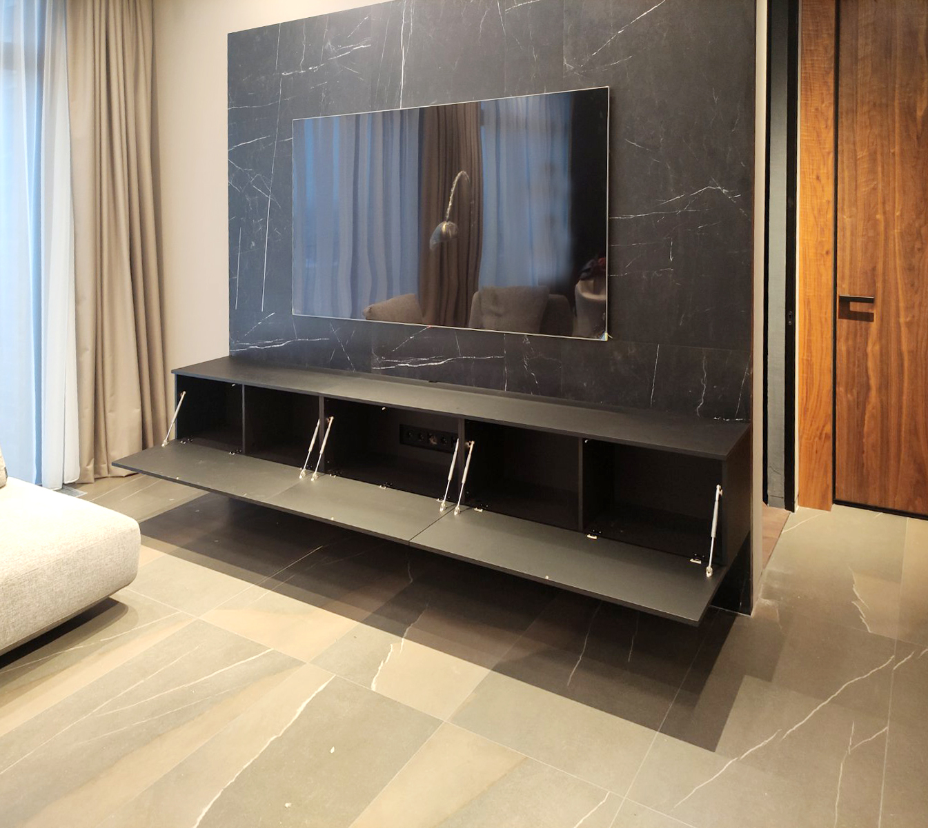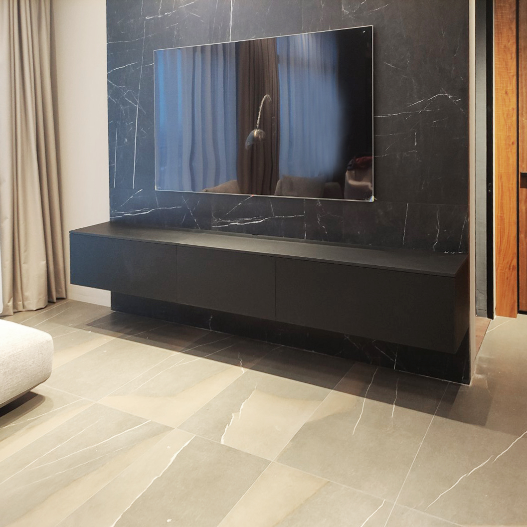 Лаконичность. ТВ-зона в гостиной представлена подвесной тумбой из МДФ SUPRAMAT (матерал с самовосстанавливающейся поверхностью).