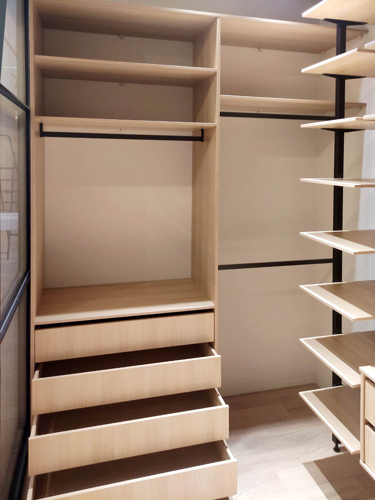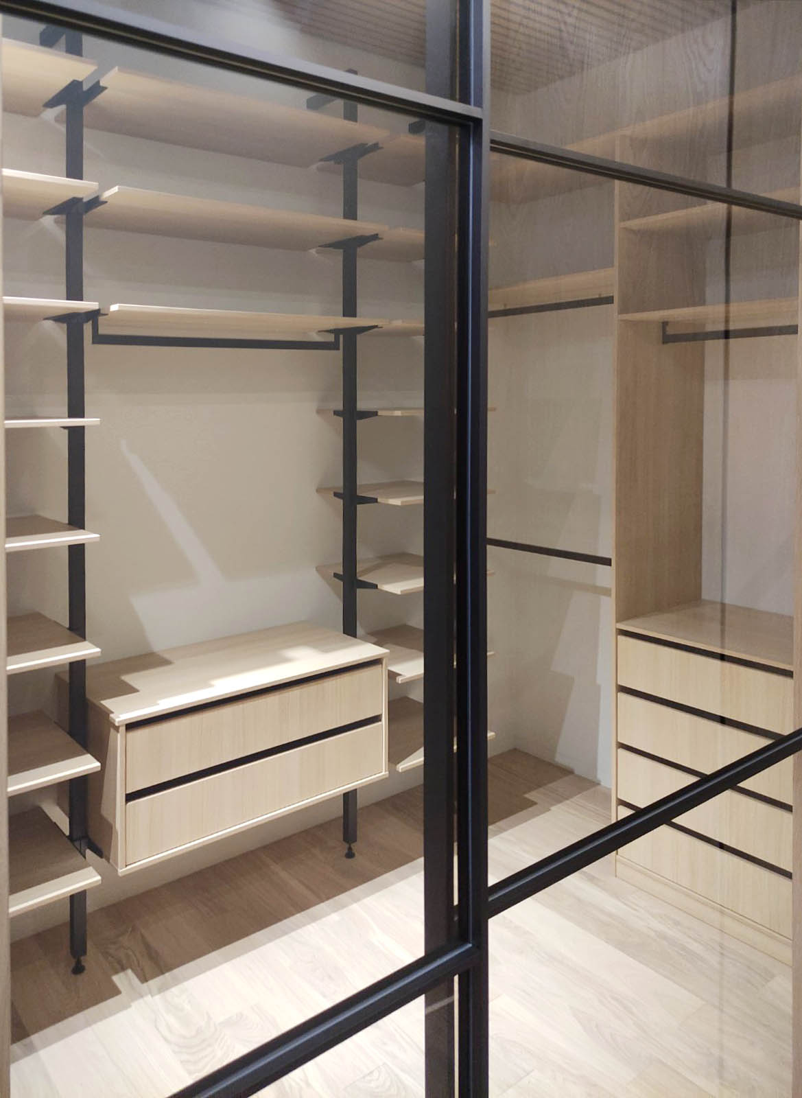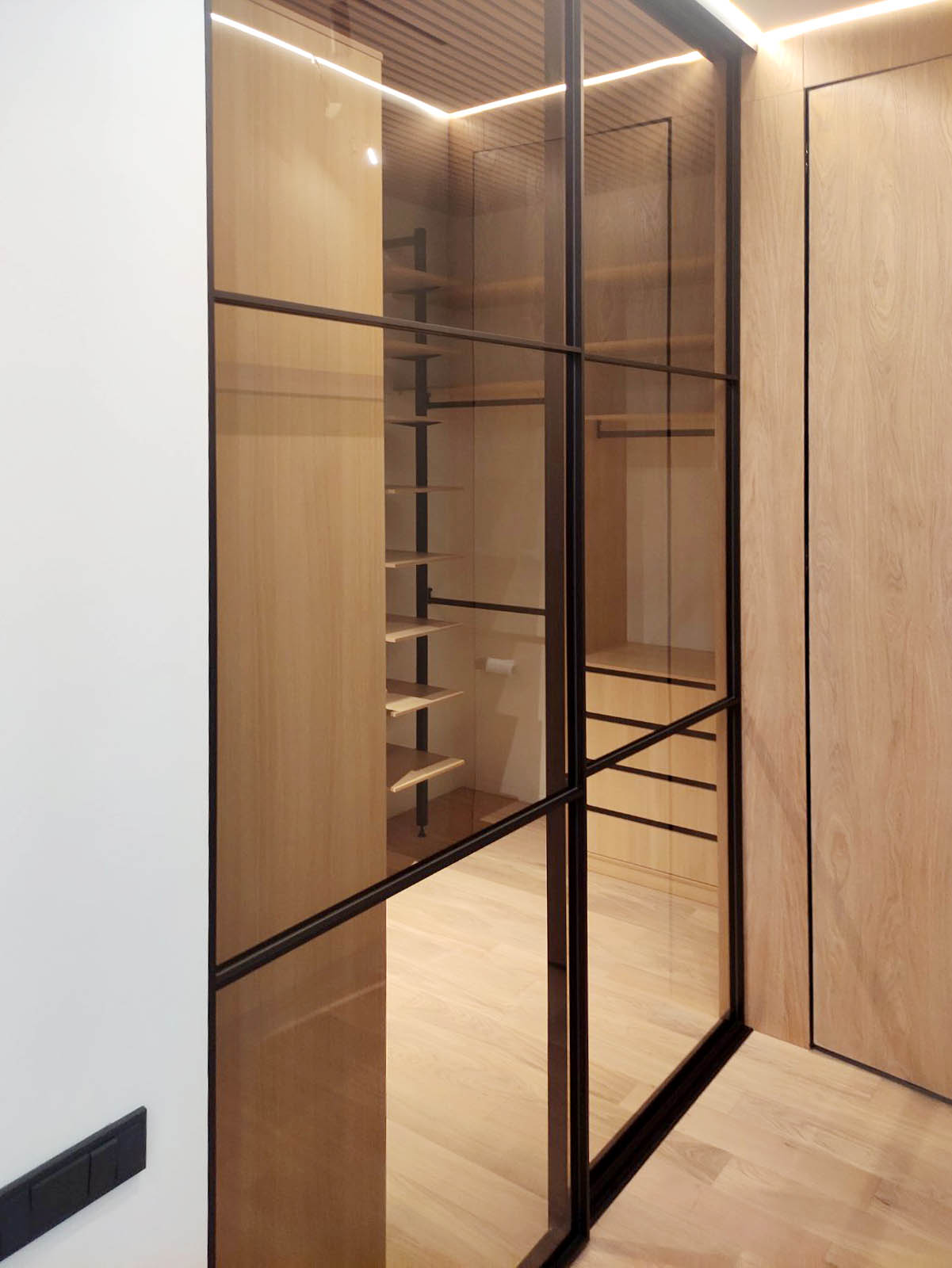 За прозрачной дверью-купе скрывается модульная гардеробная система с немецким профилем UNO, которая является ценnральной частью гардеробной. Боковые части представлены вместительными стеллажами с ящиками для хранения одежды и мелочей.