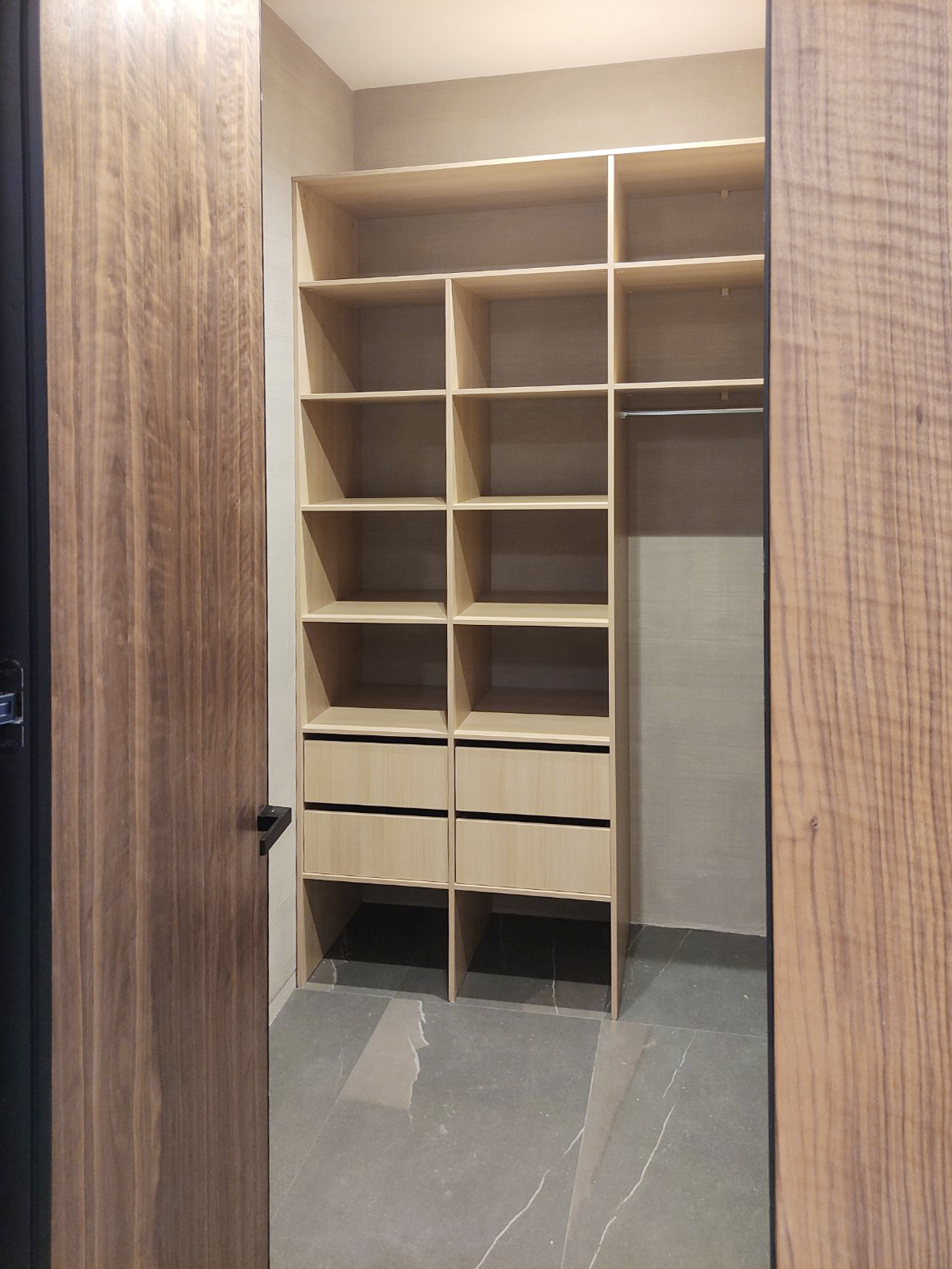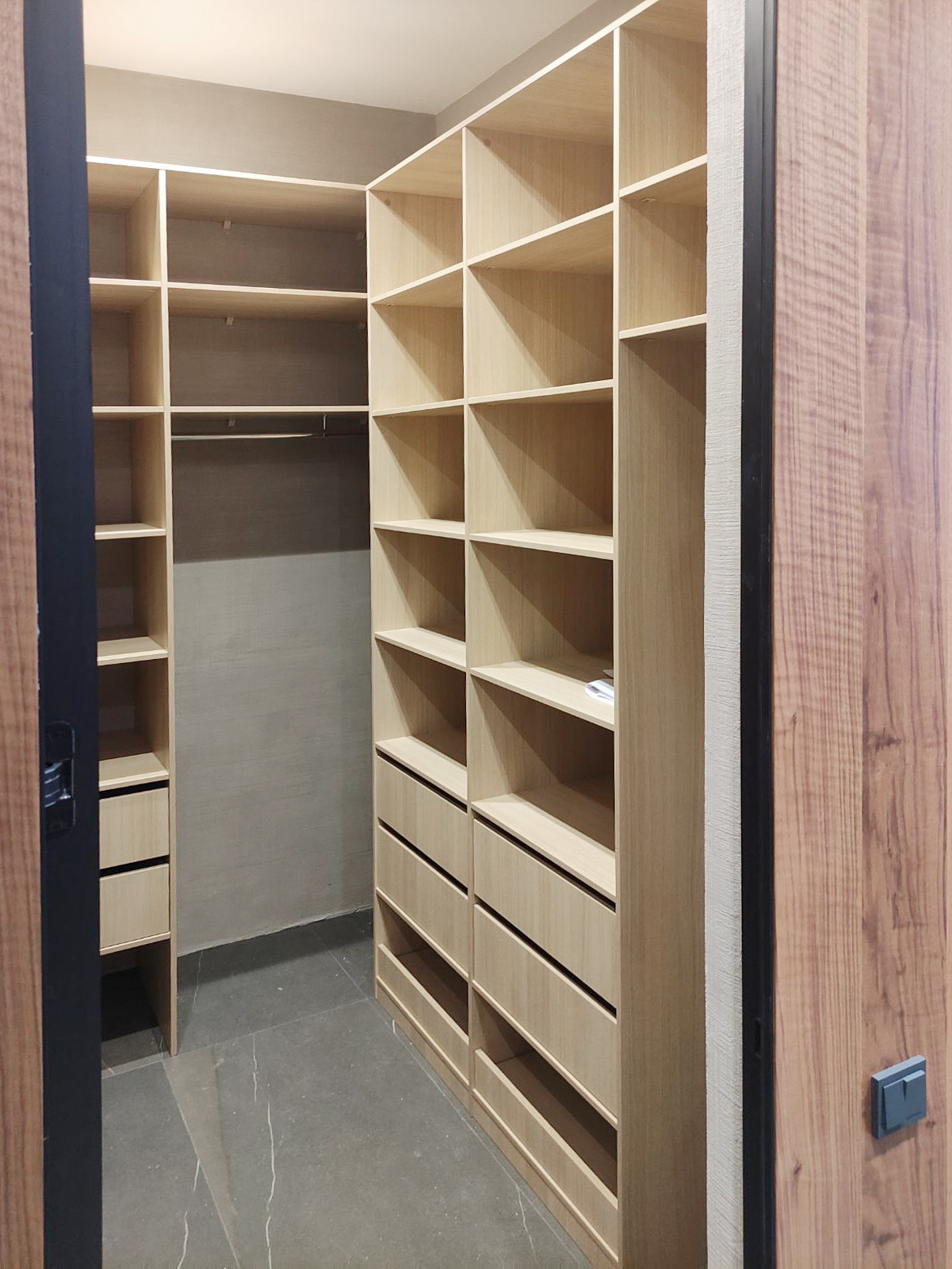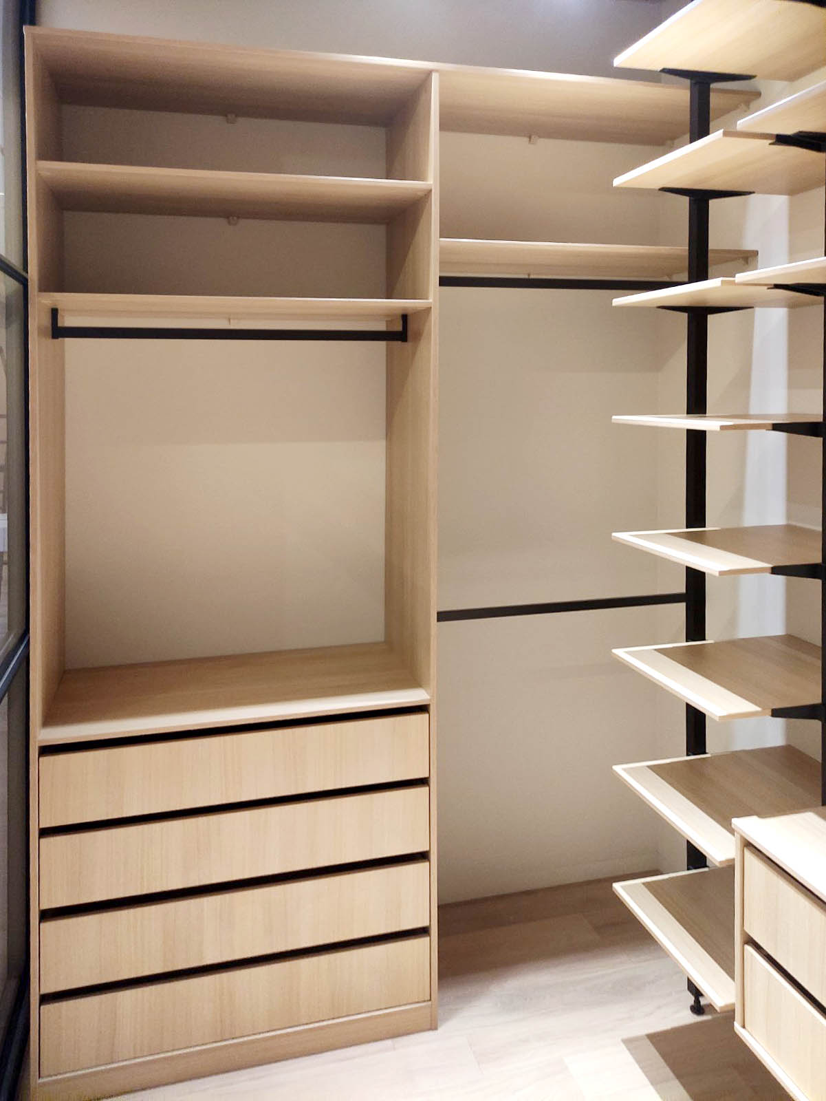 За прозрачной дверью-купе скрывается модульная гардеробная система с немецким профилем UNO, которая является ценnральной частью гардеробной. Боковые части представлены вместительными стеллажами с ящиками для хранения одежды и мелочей.