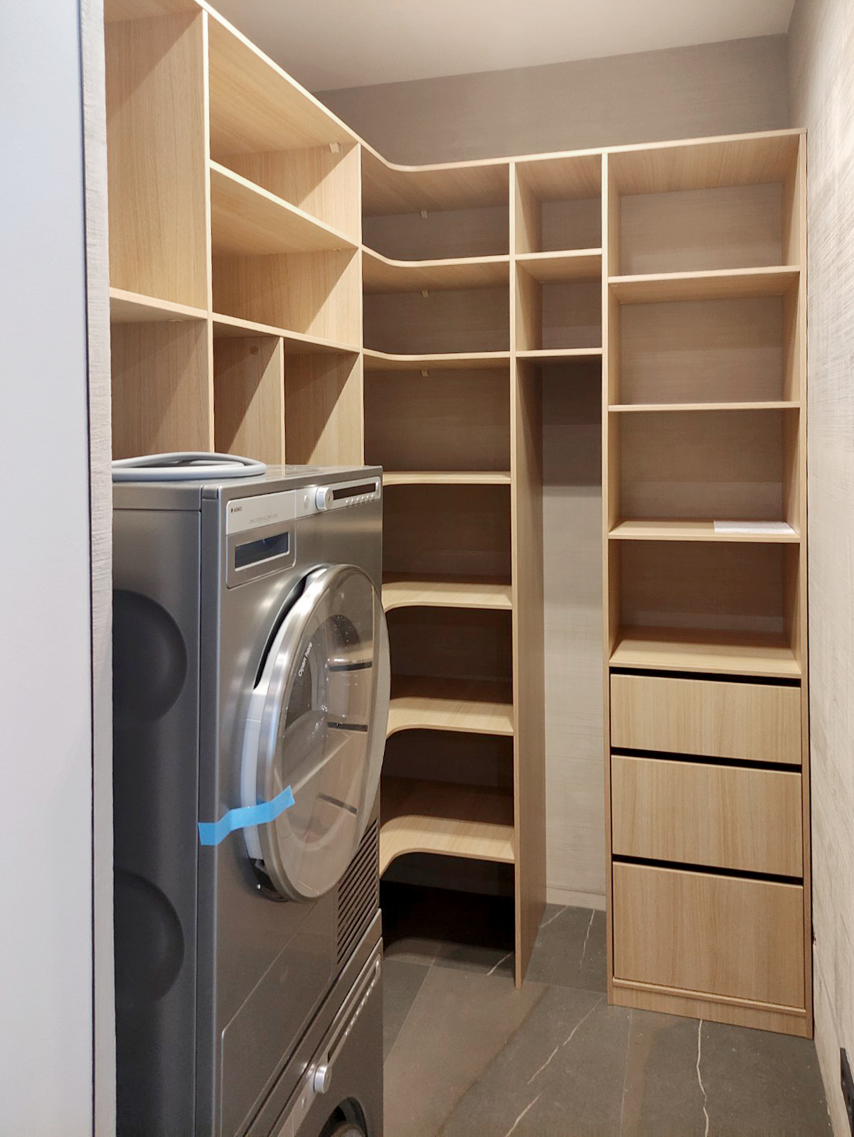 Постирочная представляет собой систему стеллажей с большим количеством мест для хранения.