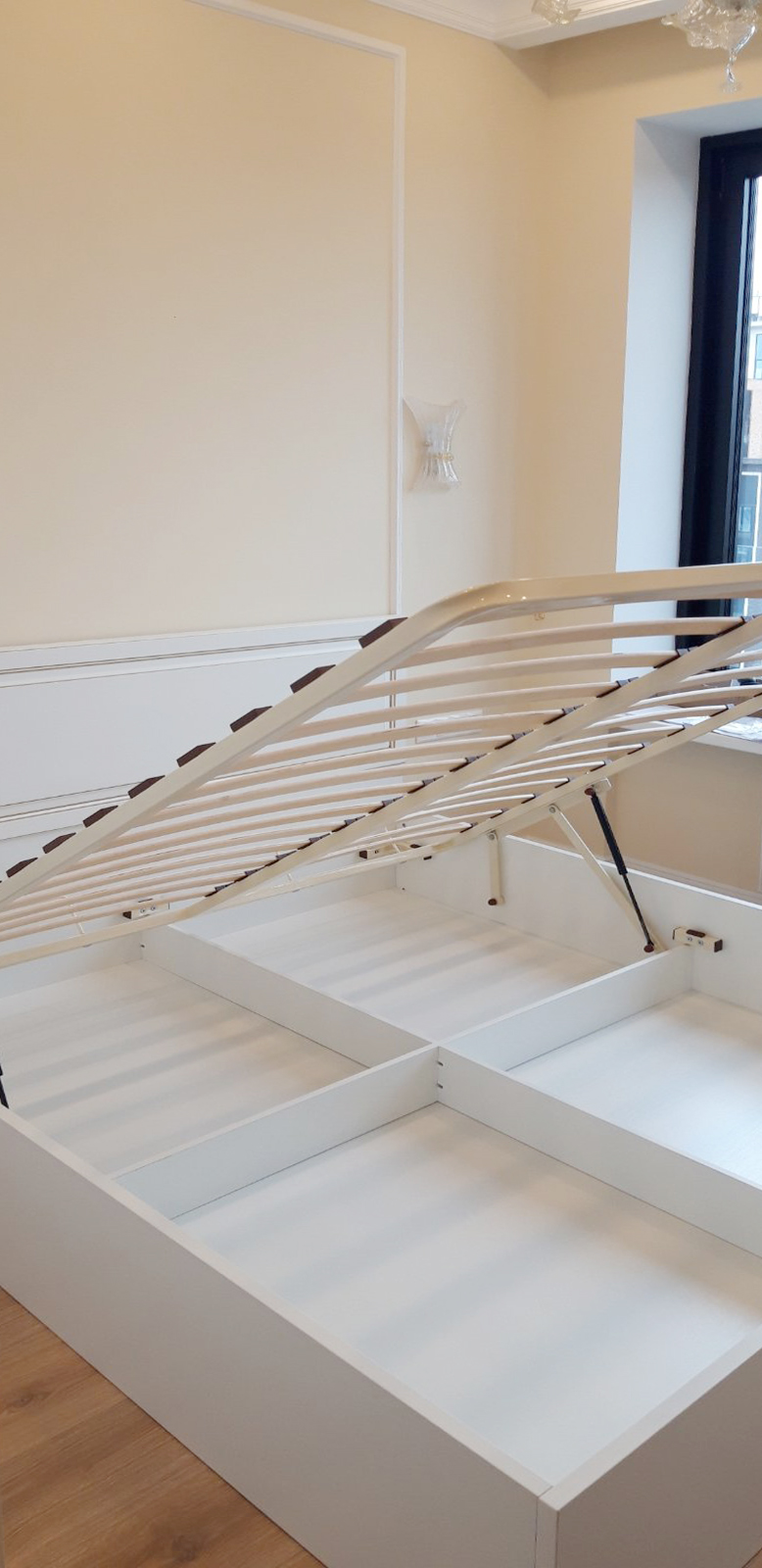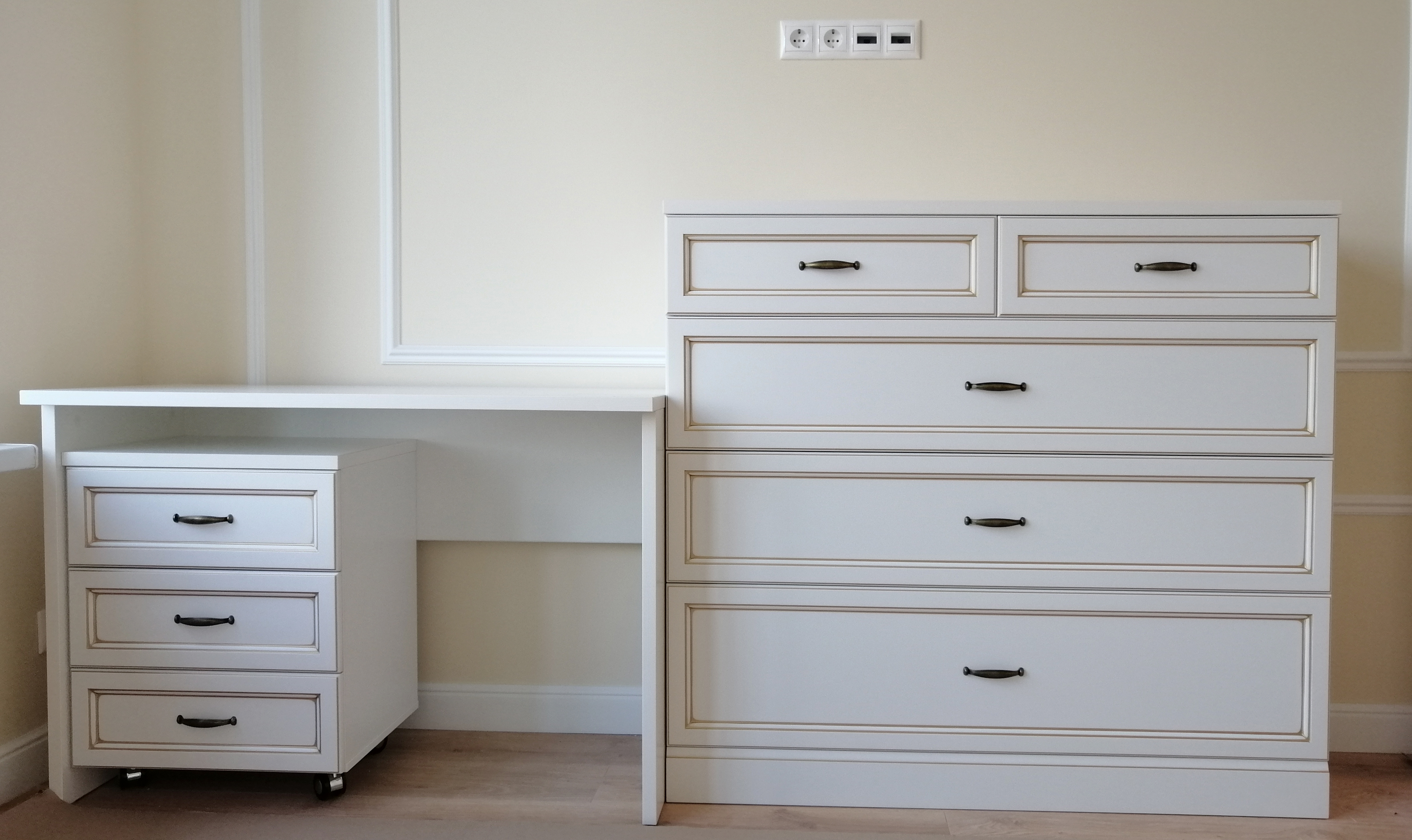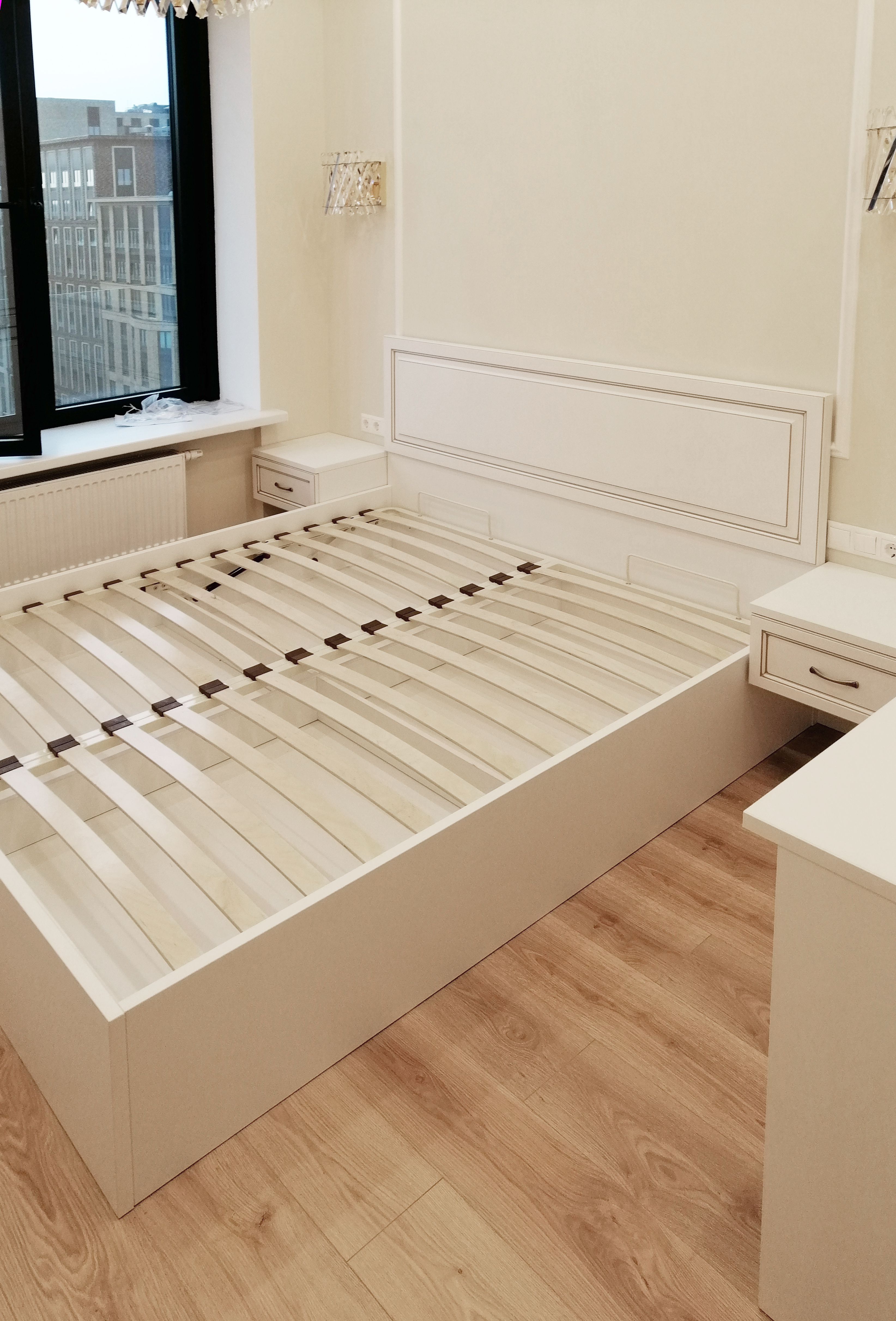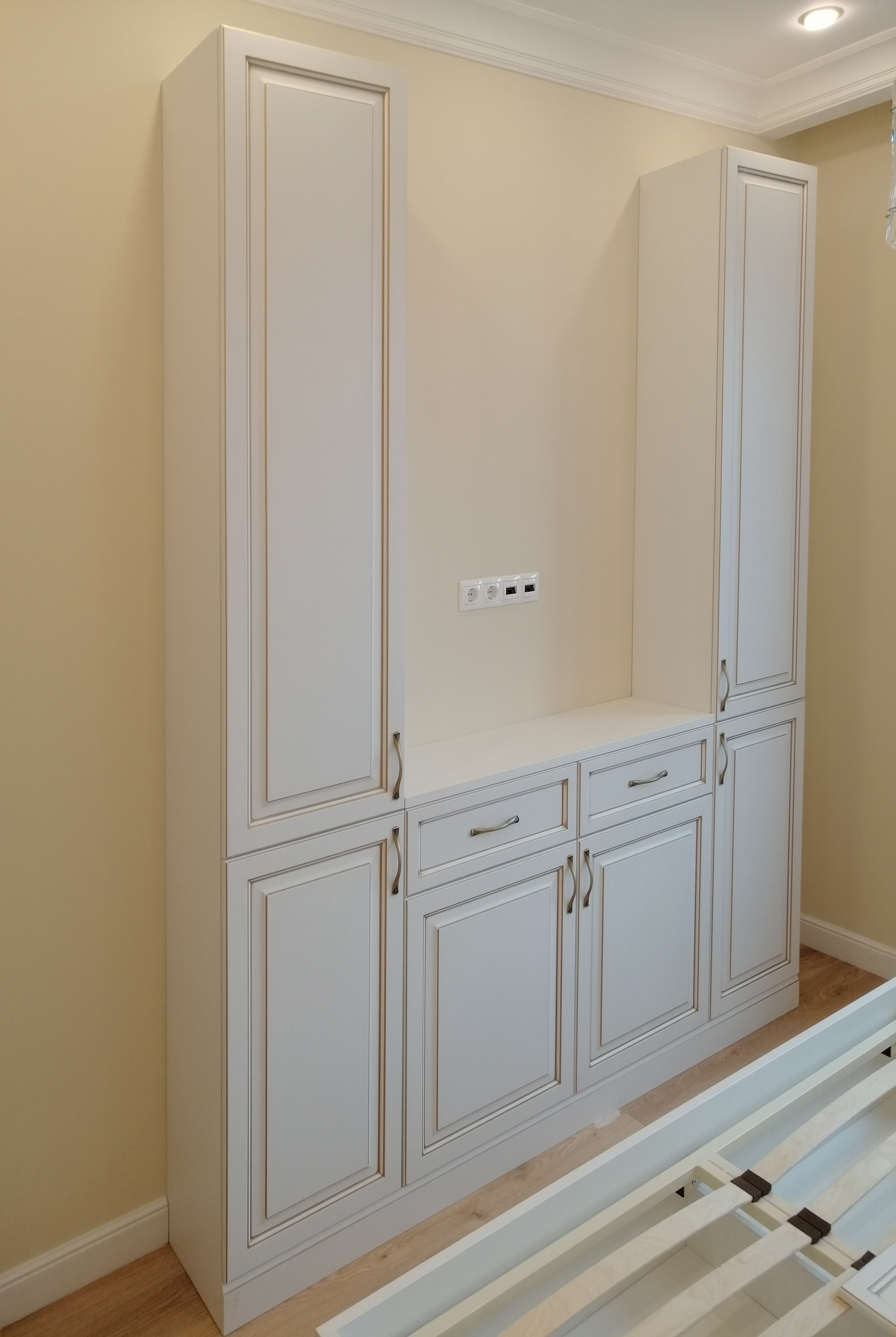 Индивидуальный проект мебели в классическом стиле в спальню. Проект включает в себя ТВ-зону, крвоать с подъемным мехнизмом и прикроватными тумбами, рабочую зону, комод и шкаф в эмале с интегрированными ручками во вторую комнату. Вся мебель выполнена с фасадми из МДФ эмали в белом цвете.