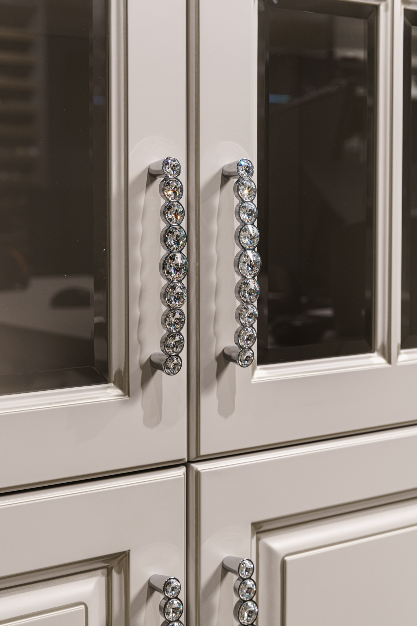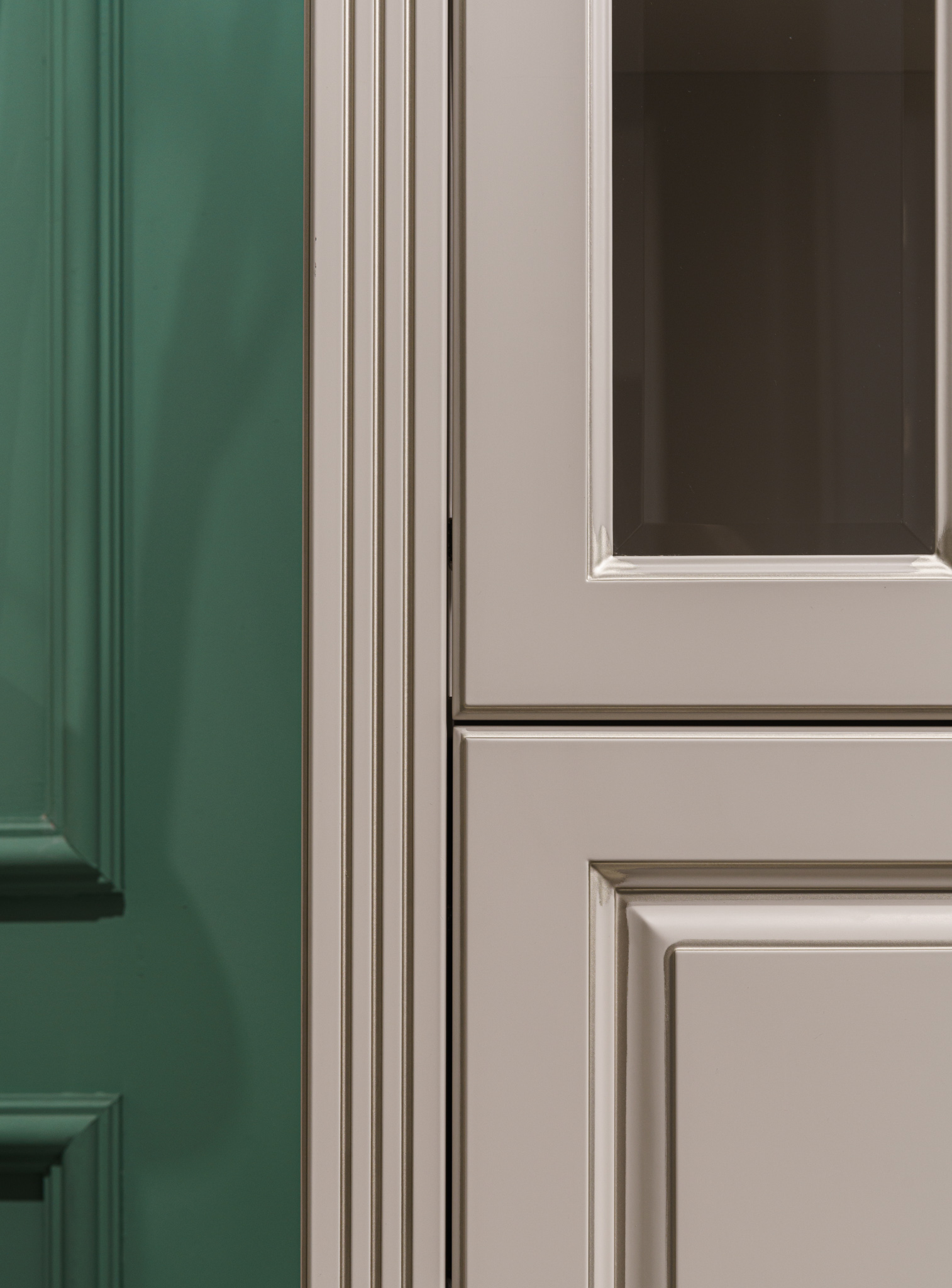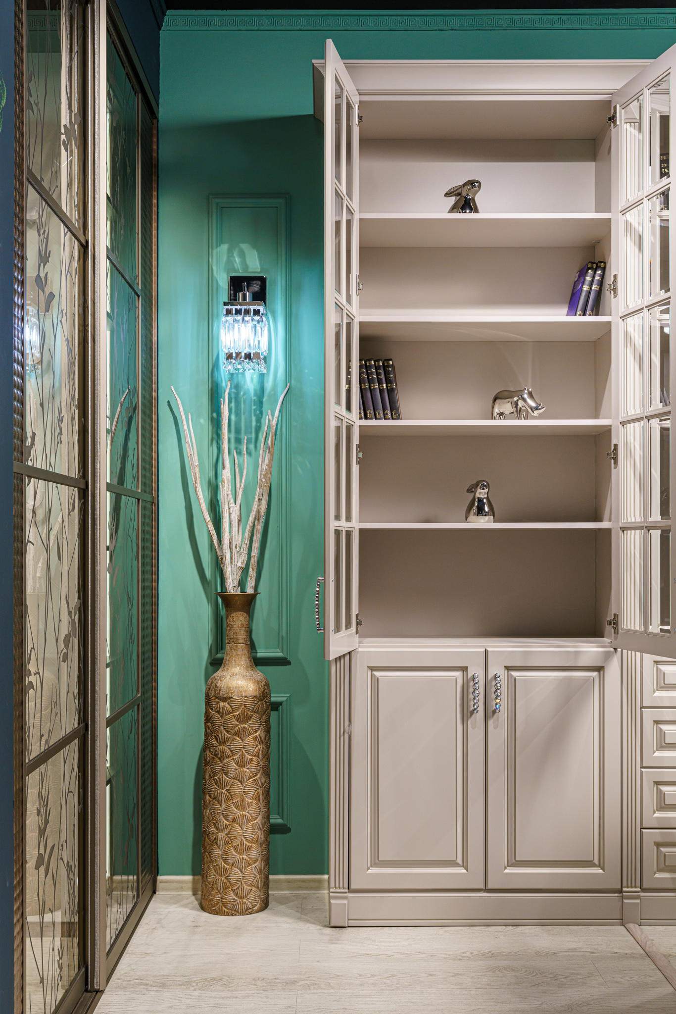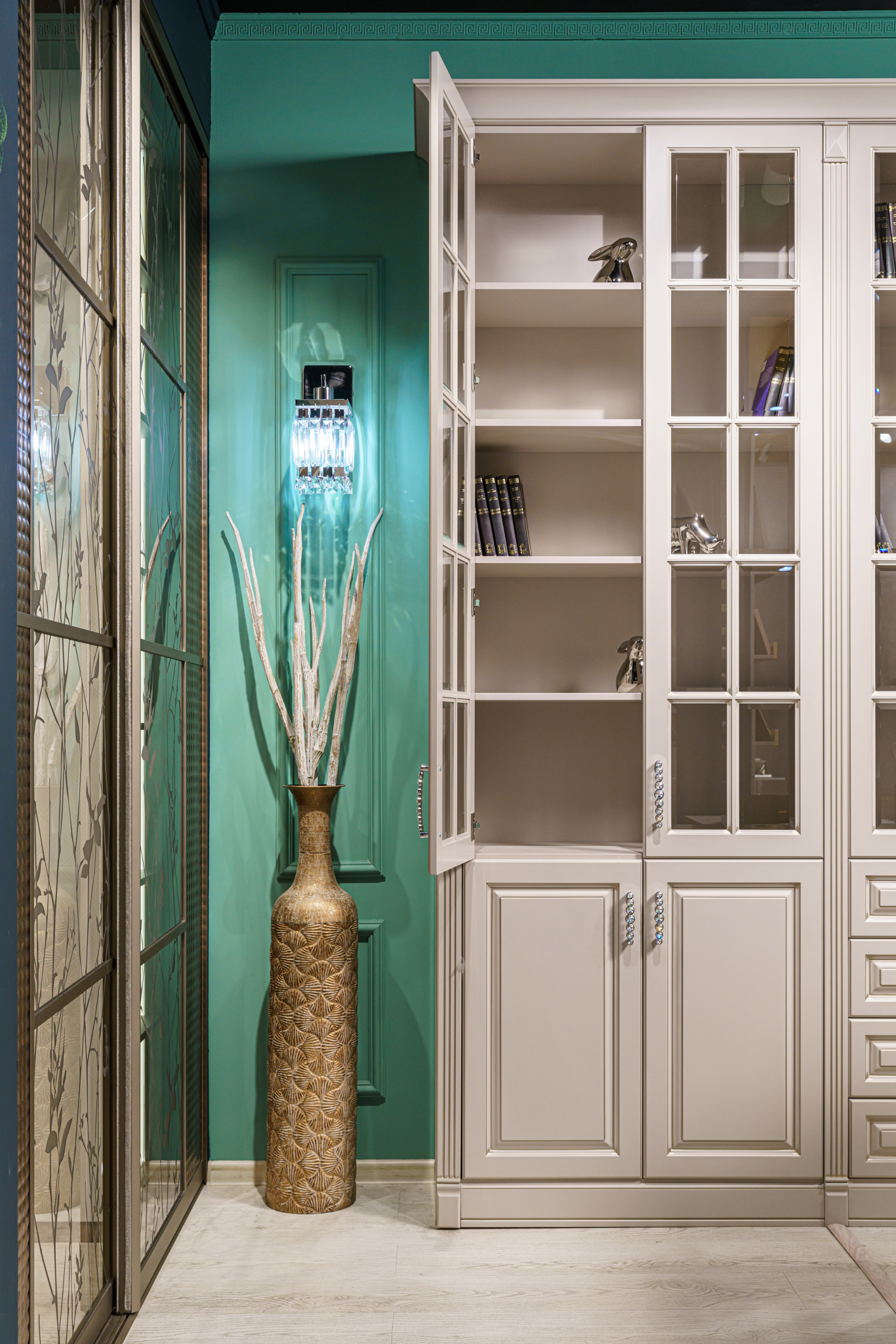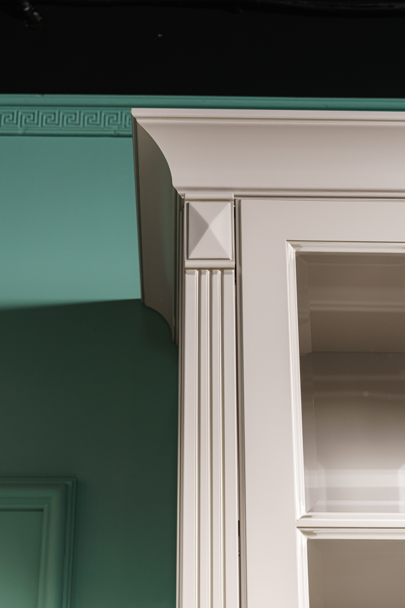 Шкаф для библиотеки классический из МДФ, окрашенного эмалью, с распашными дверями глухими, дверями со вставками из прозрачного стекла, ящиками полного выдвижения с доводчиками BLUM.