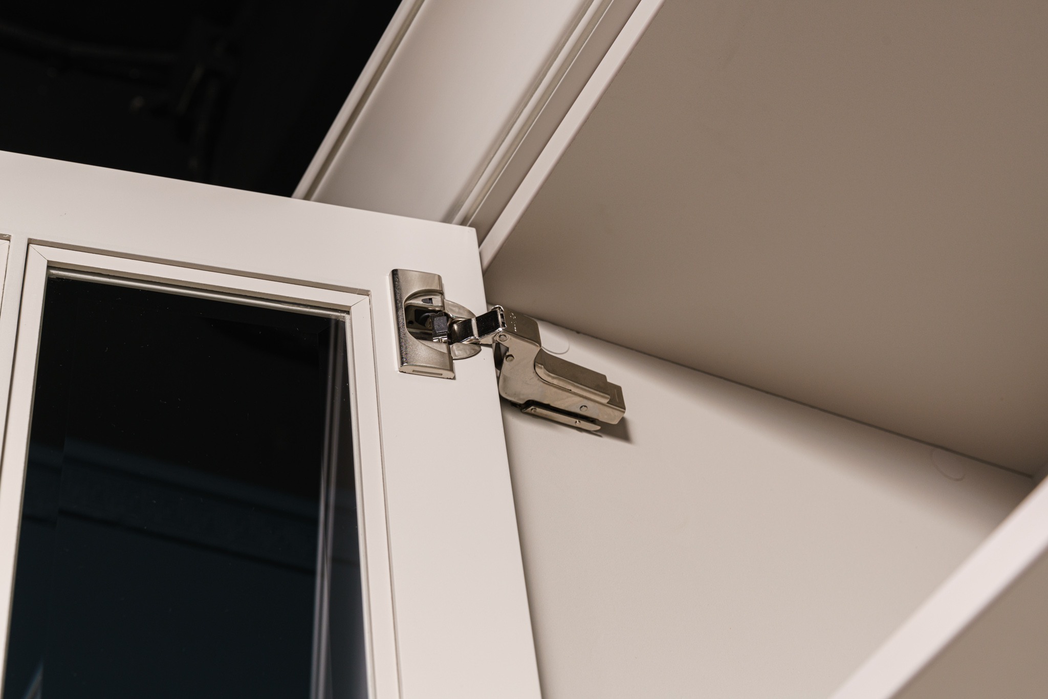Внутреннее наполнение - корпус, полки - ЛДСП EGGER 16мм, цвет U702 ST9 кашемир серый. Двери на петлях Blum плавного закрывания, ящики полного выдвижения с направляющими Blum -Tandem Plus Blumotion плавного закрывания.