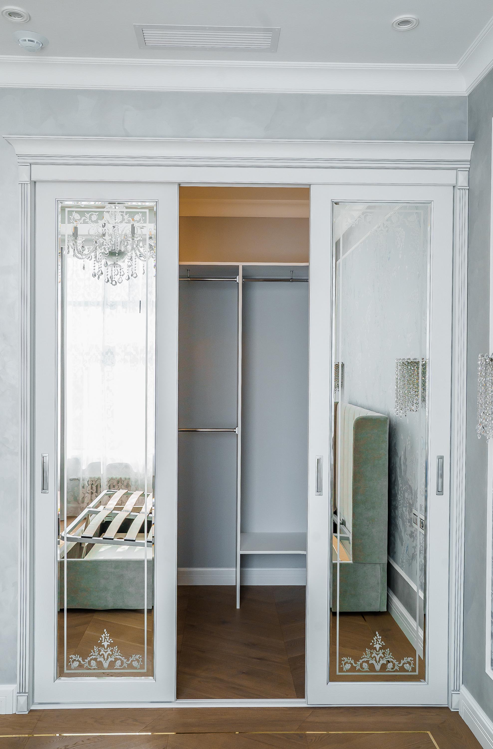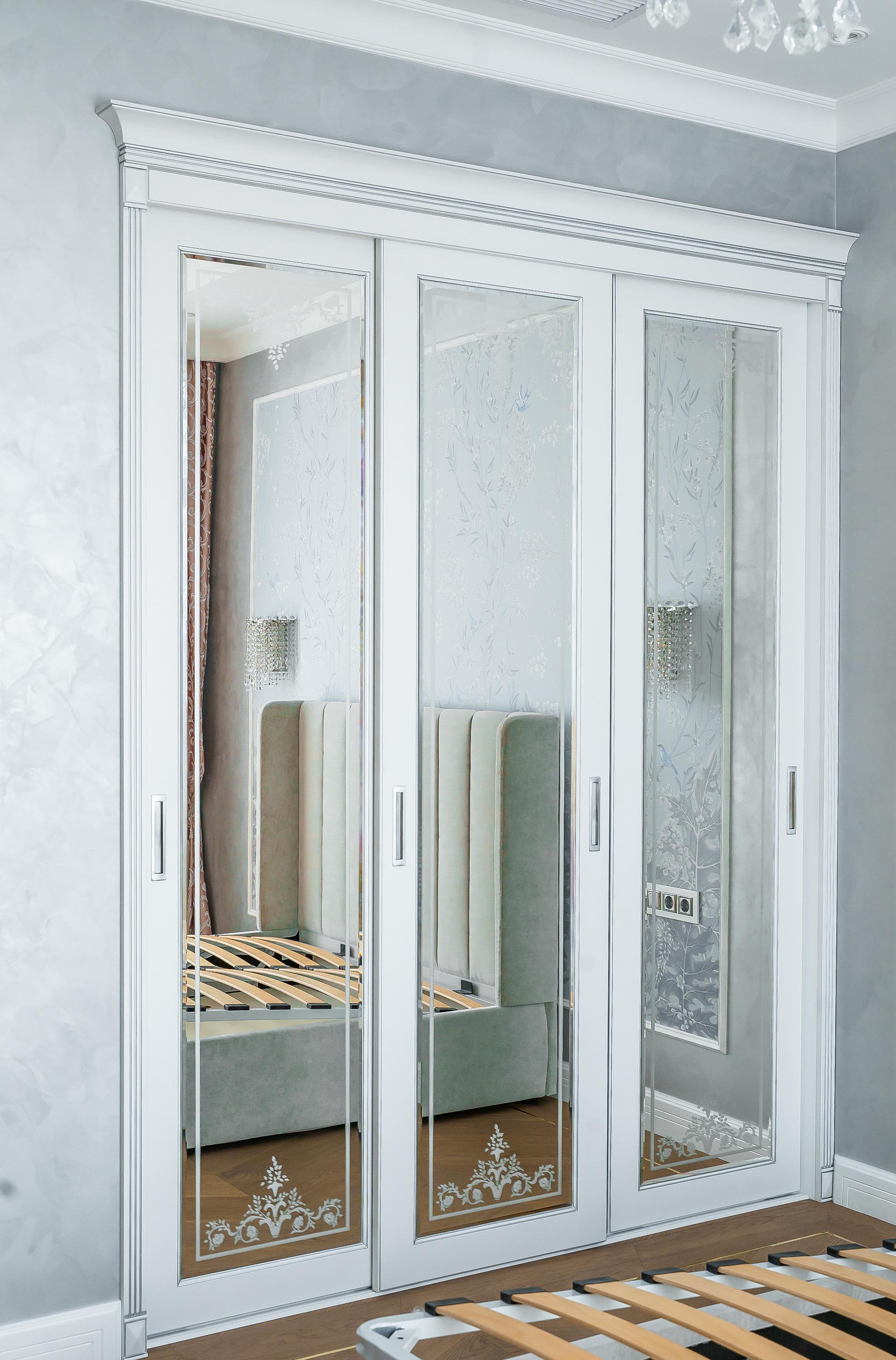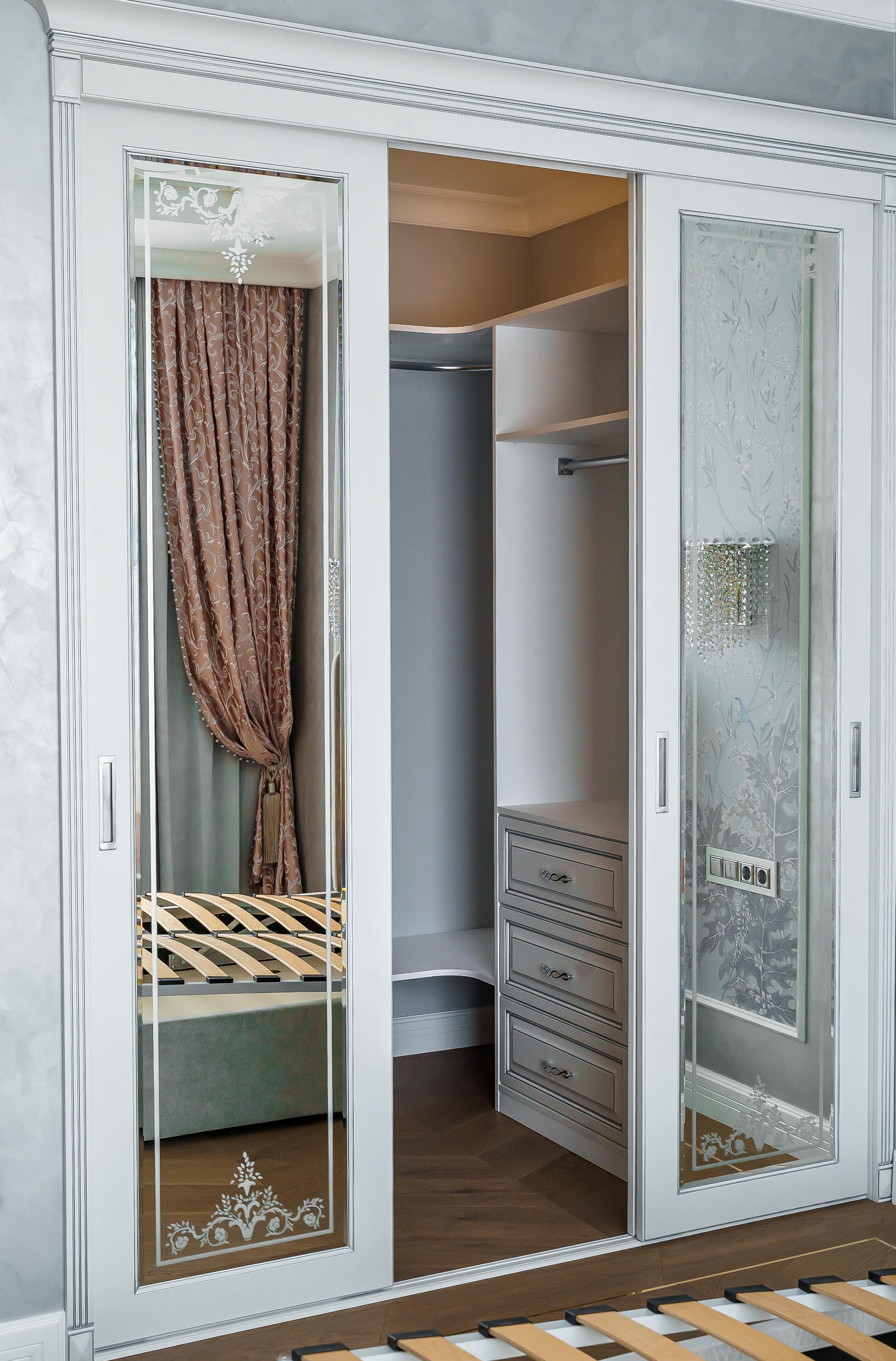Гардеробная с классическими фасадами из МДФ, которые декорированы патиной Серебро. Двери-купе из МДФ, а в качестве наполнения выбрано зеркало Серебро с пескоструйным рисунком и врезные ручки. Пескорстуйный рисунок придает изделию еще большей индивидуальности. С помощью пескоструйной обработки можно реализовать самые смелые идеи на зеркале или стекле.