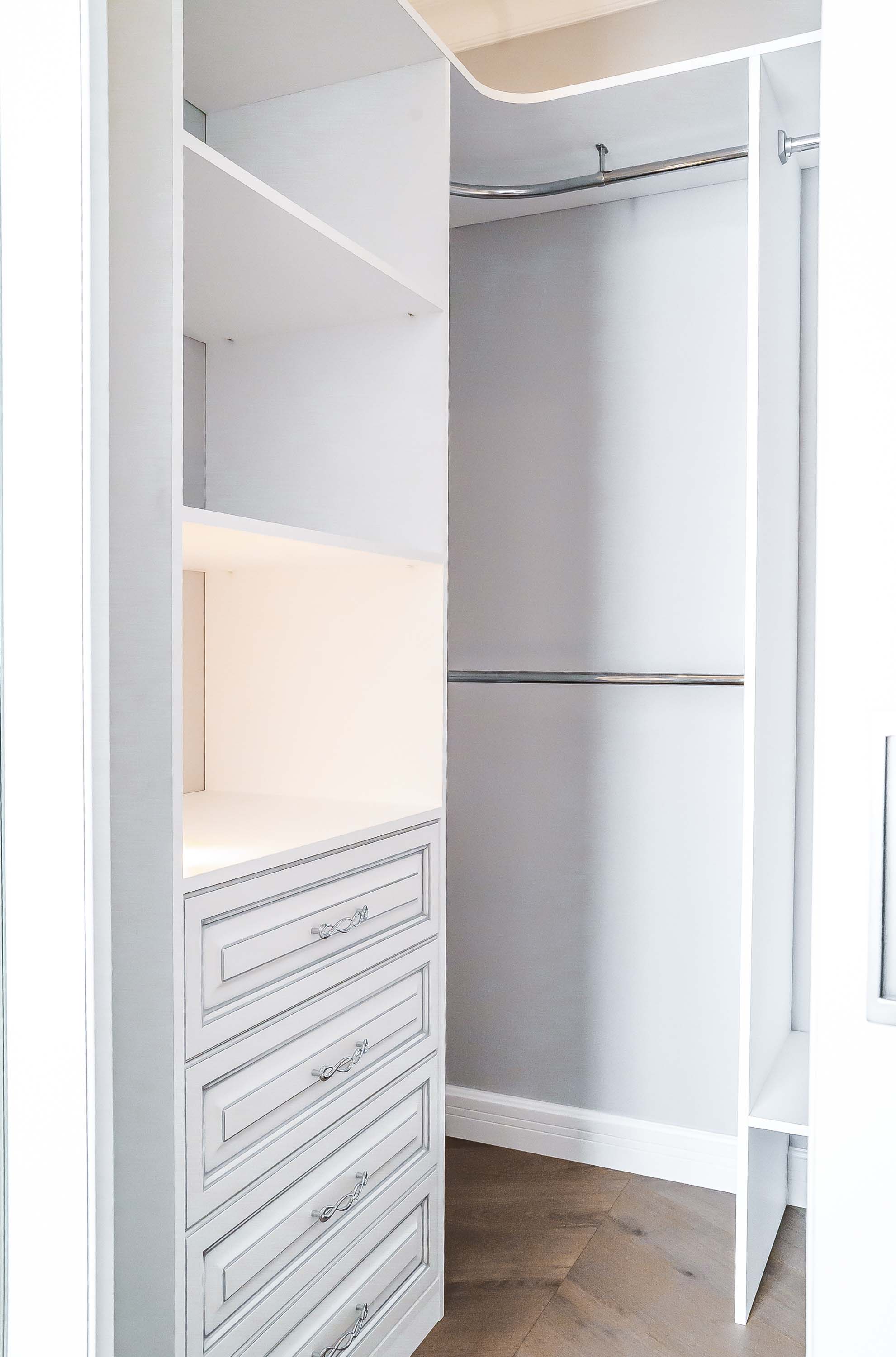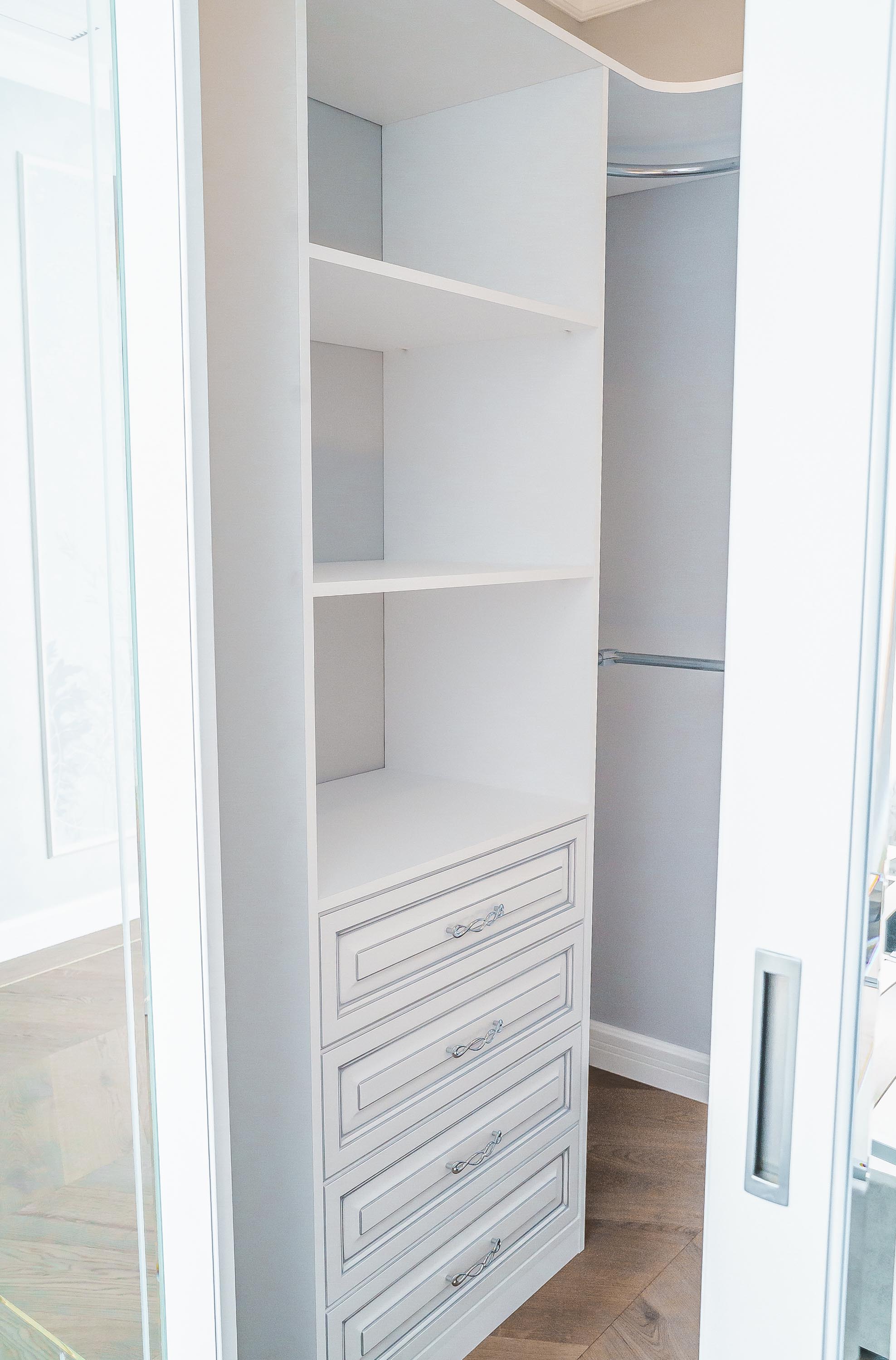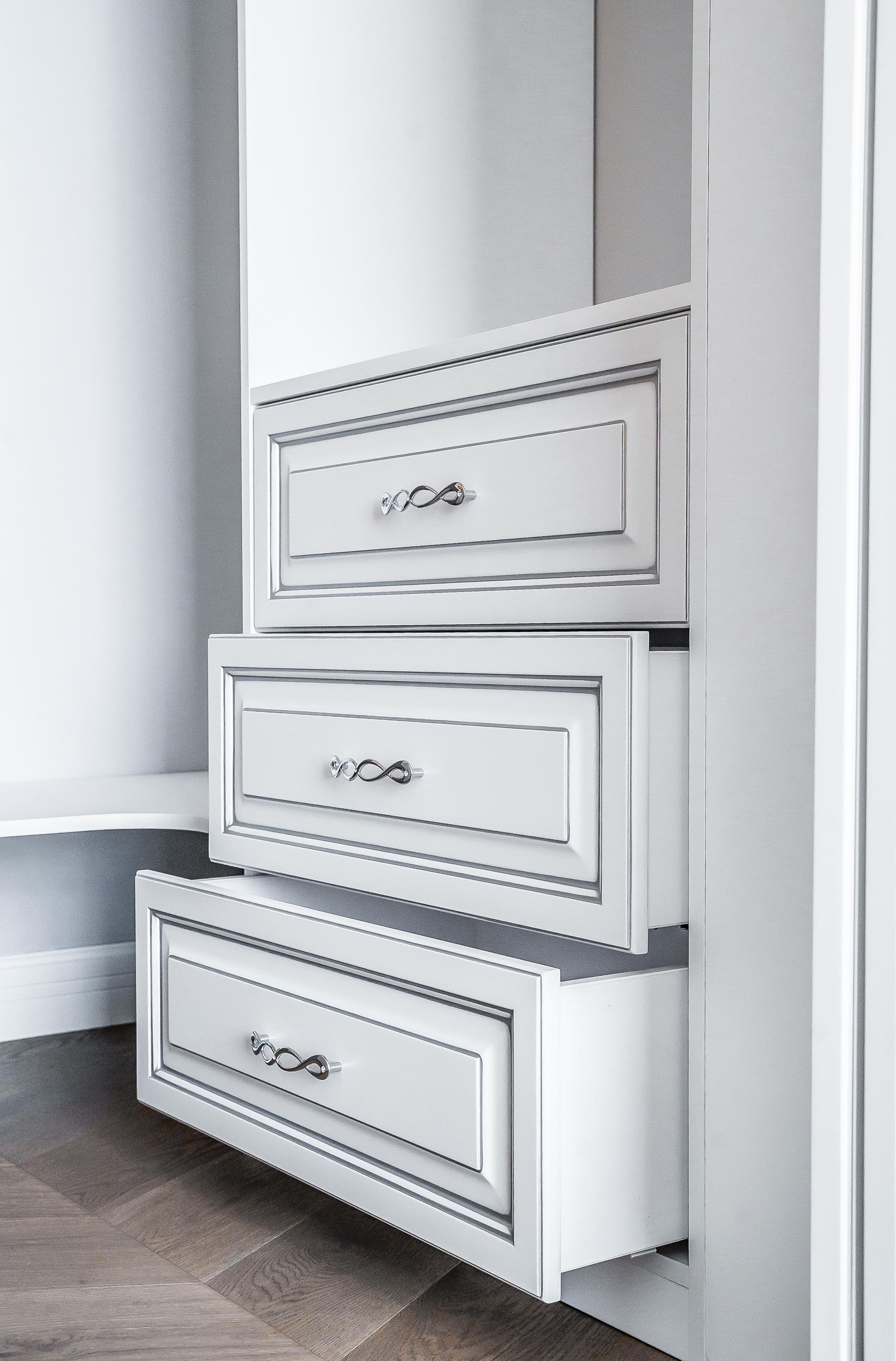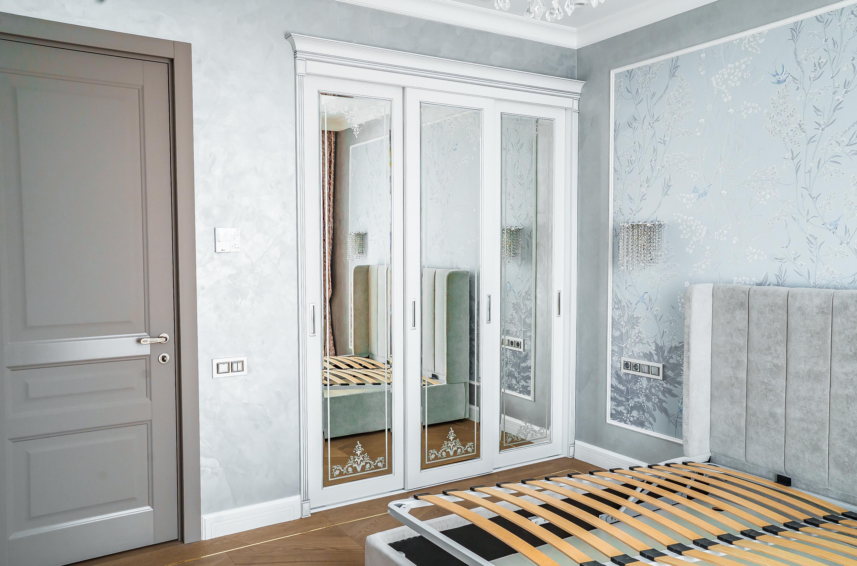Гардеробная с классическими фасадами из МДФ, которые декорированы патиной Серебро. Двери-купе из МДФ, а в качестве наполнения выбрано зеркало Серебро с пескоструйным рисунком и врезные ручки. Пескорстуйный рисунок придает изделию еще большей индивидуальности. С помощью пескоструйной обработки можно реализовать самые смелые идеи на зеркале или стекле.