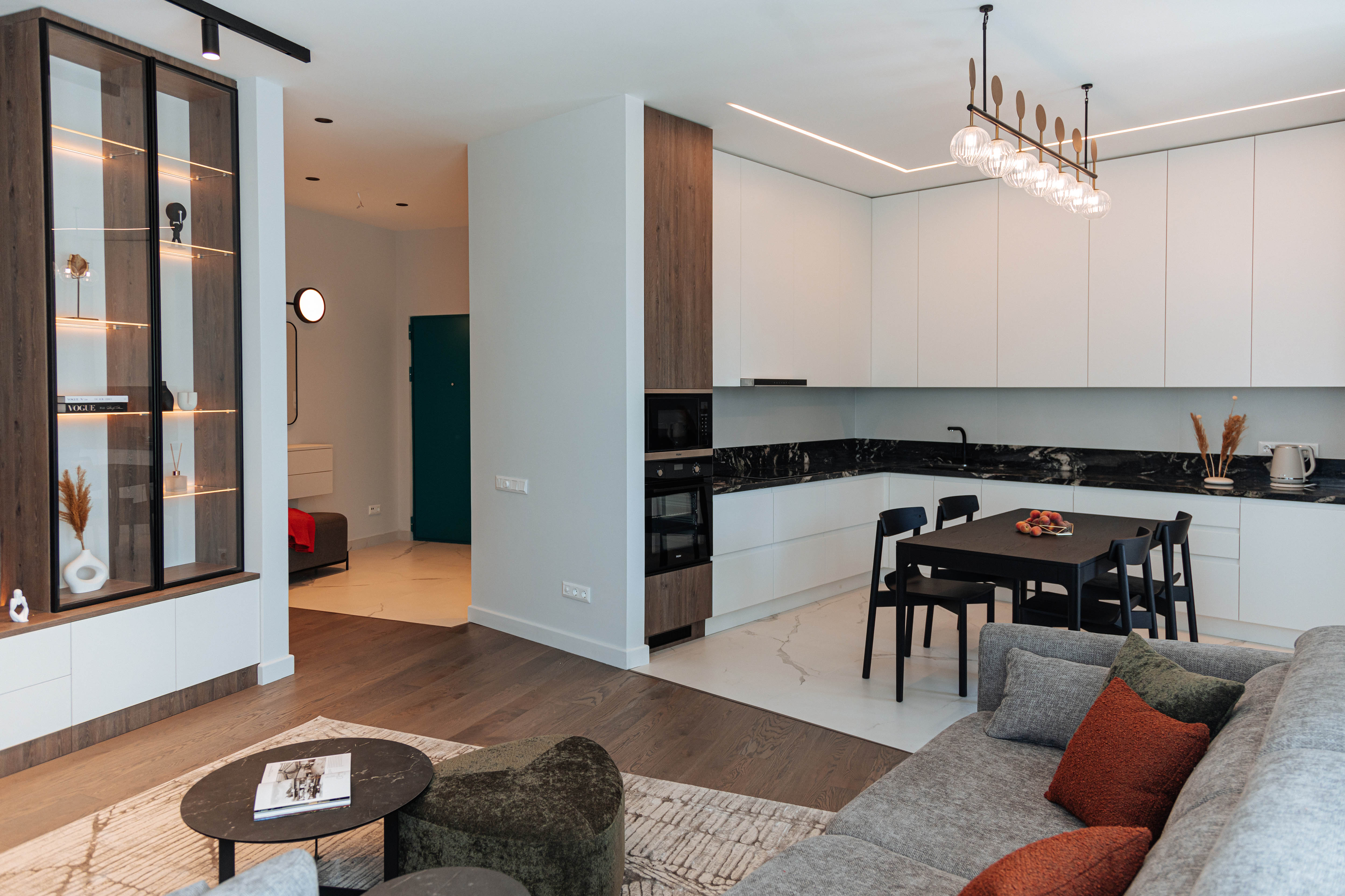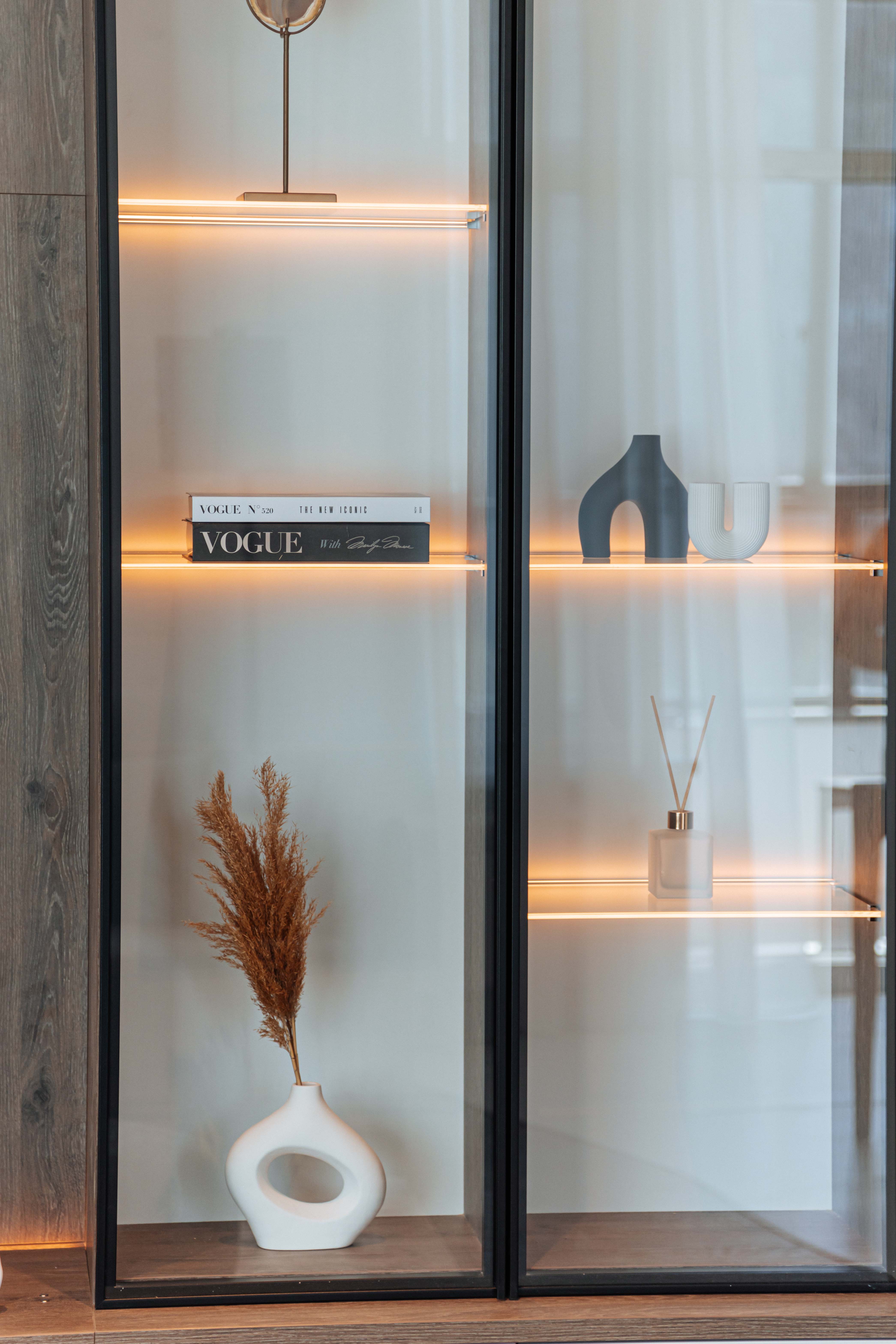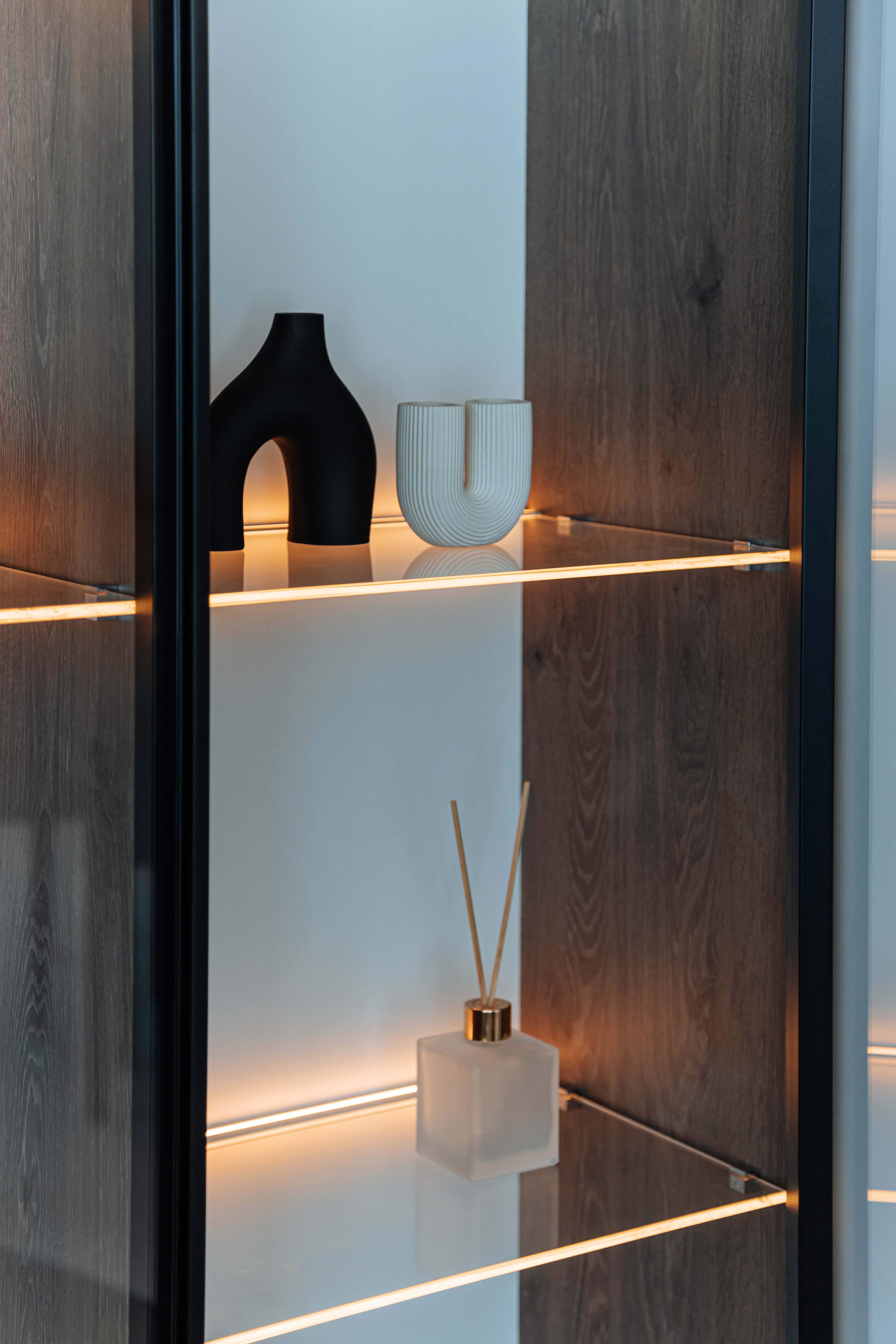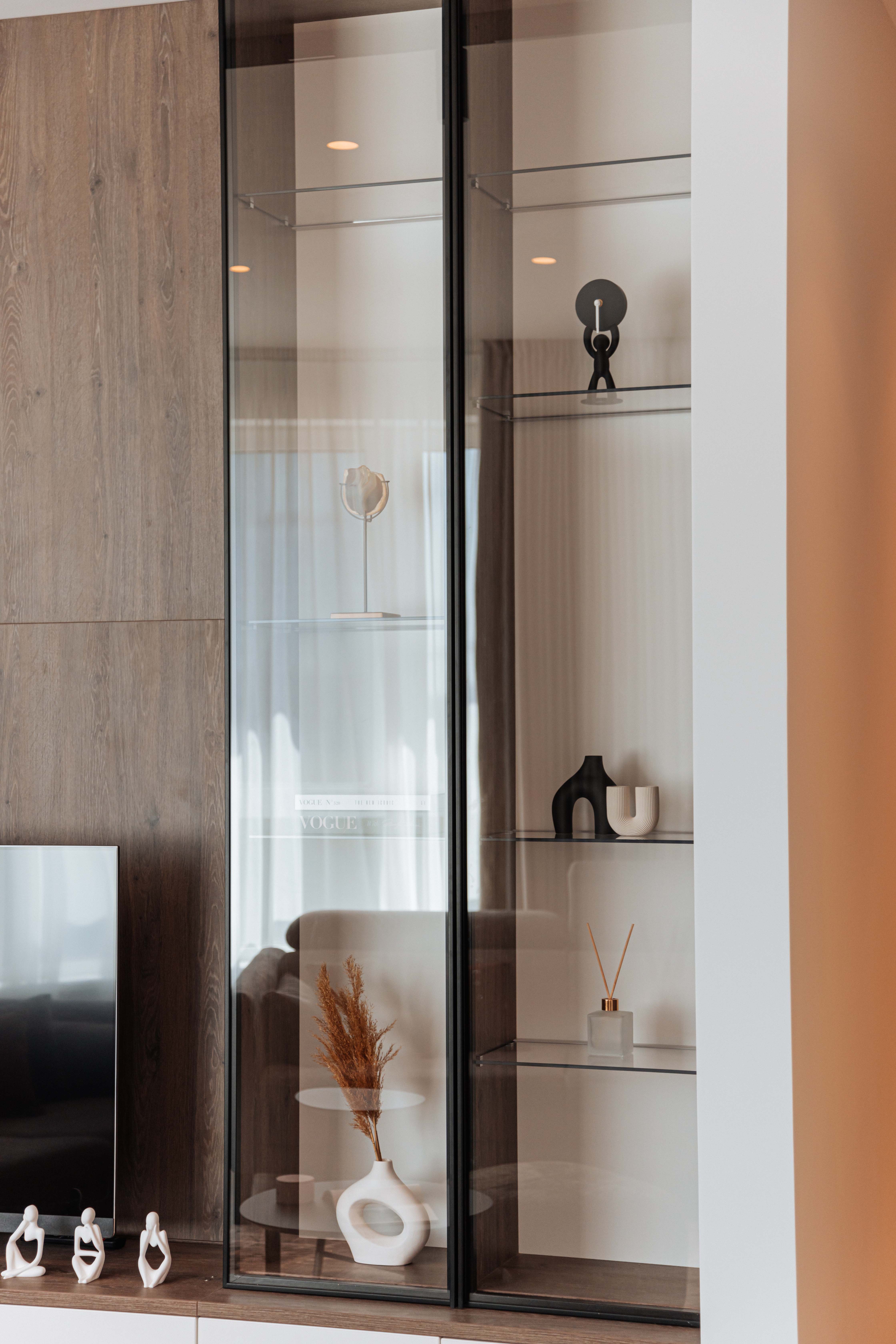 Прозрачные фасады из закаленного стекла в тонком рамочном профиле позволяют увидеть наполнение шкафа, а внутренняя подсветка изделия придает интерьеру уют.