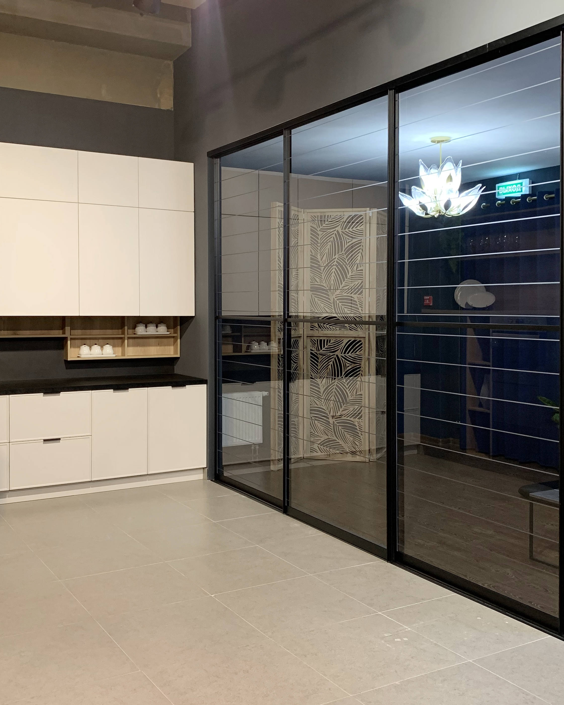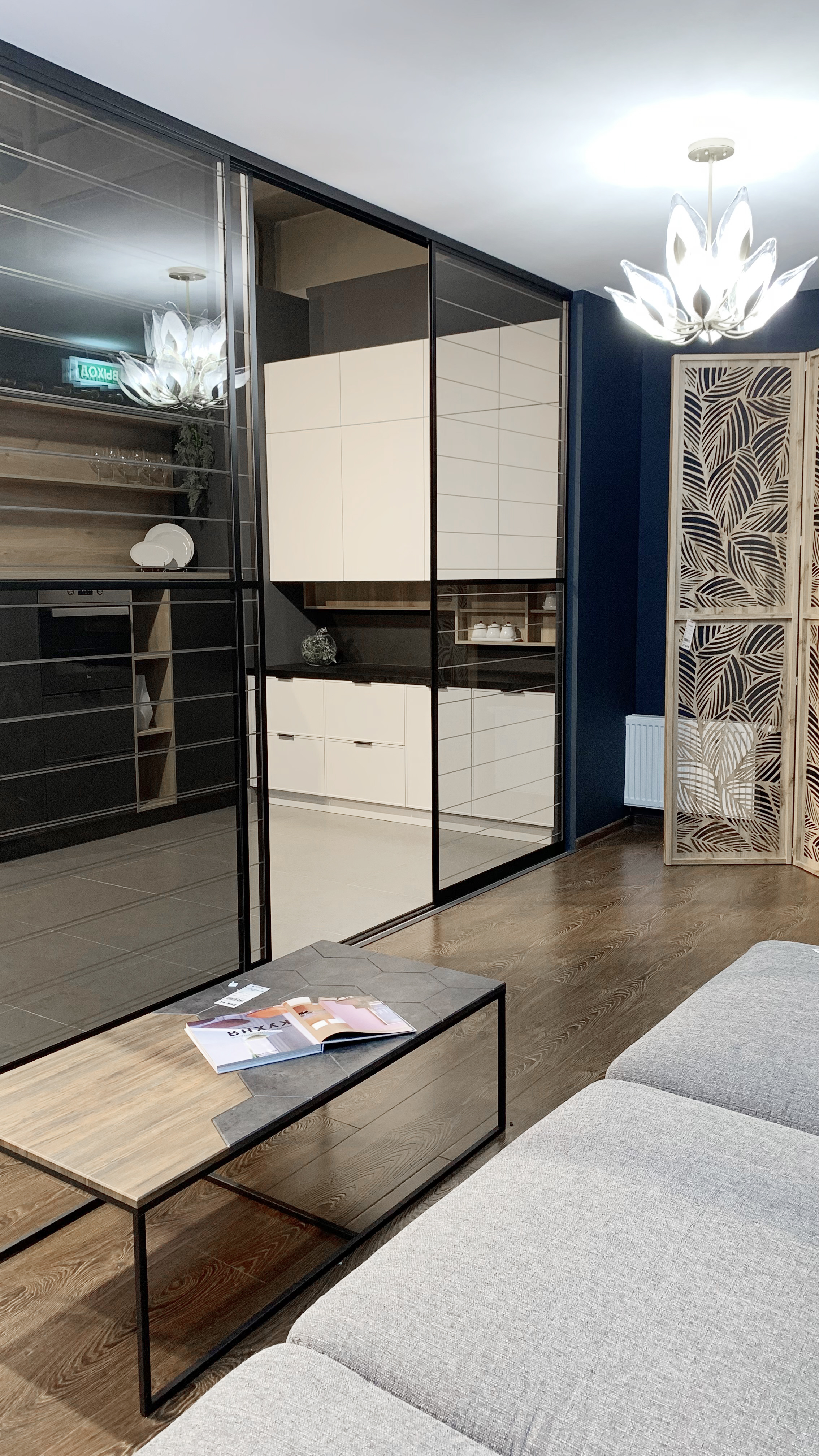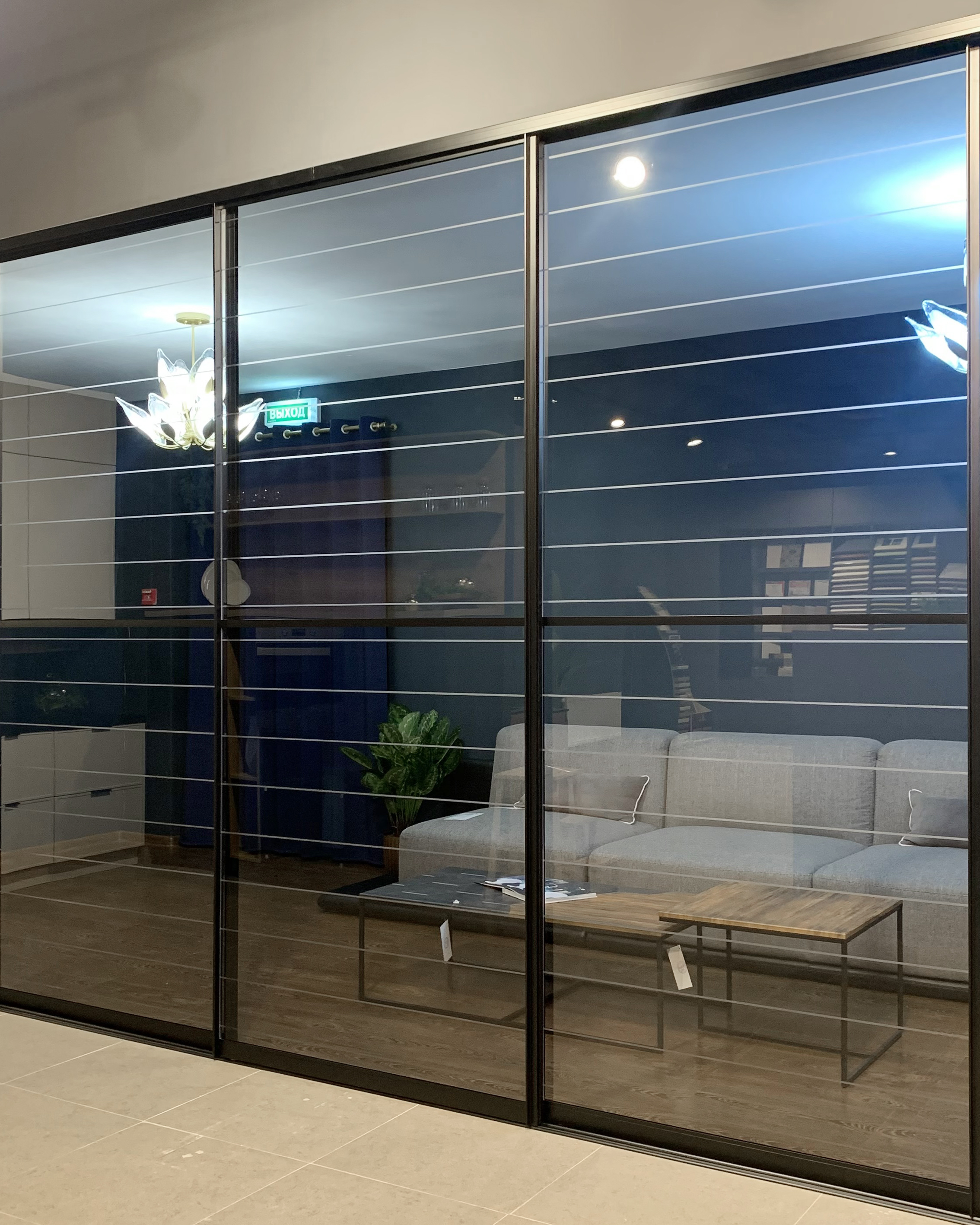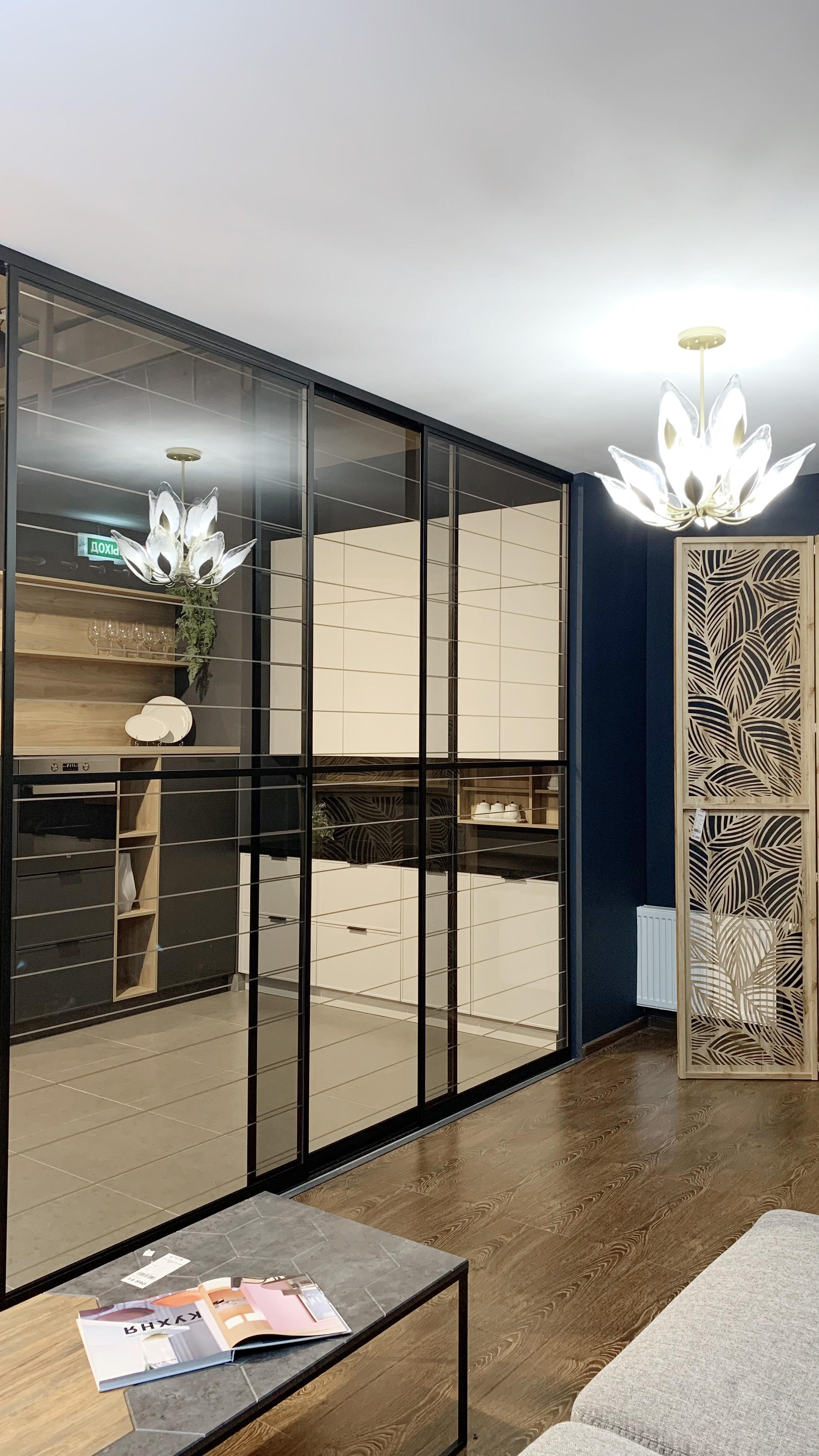 Фасад — прозрачное стекло с гравировкой + пленка ОRACAL, фацетное панно зеркало серебро + пленка ОRACAL