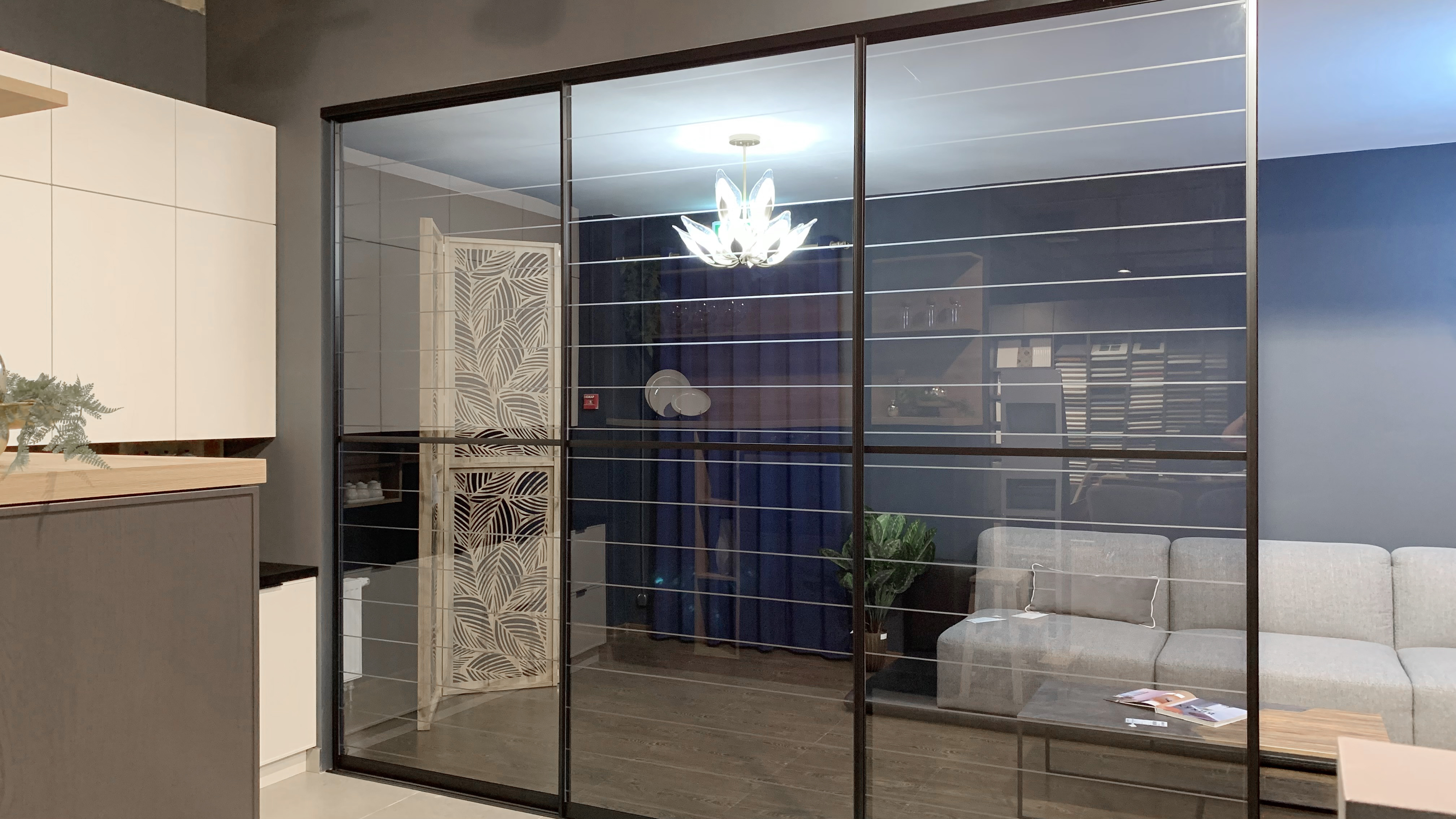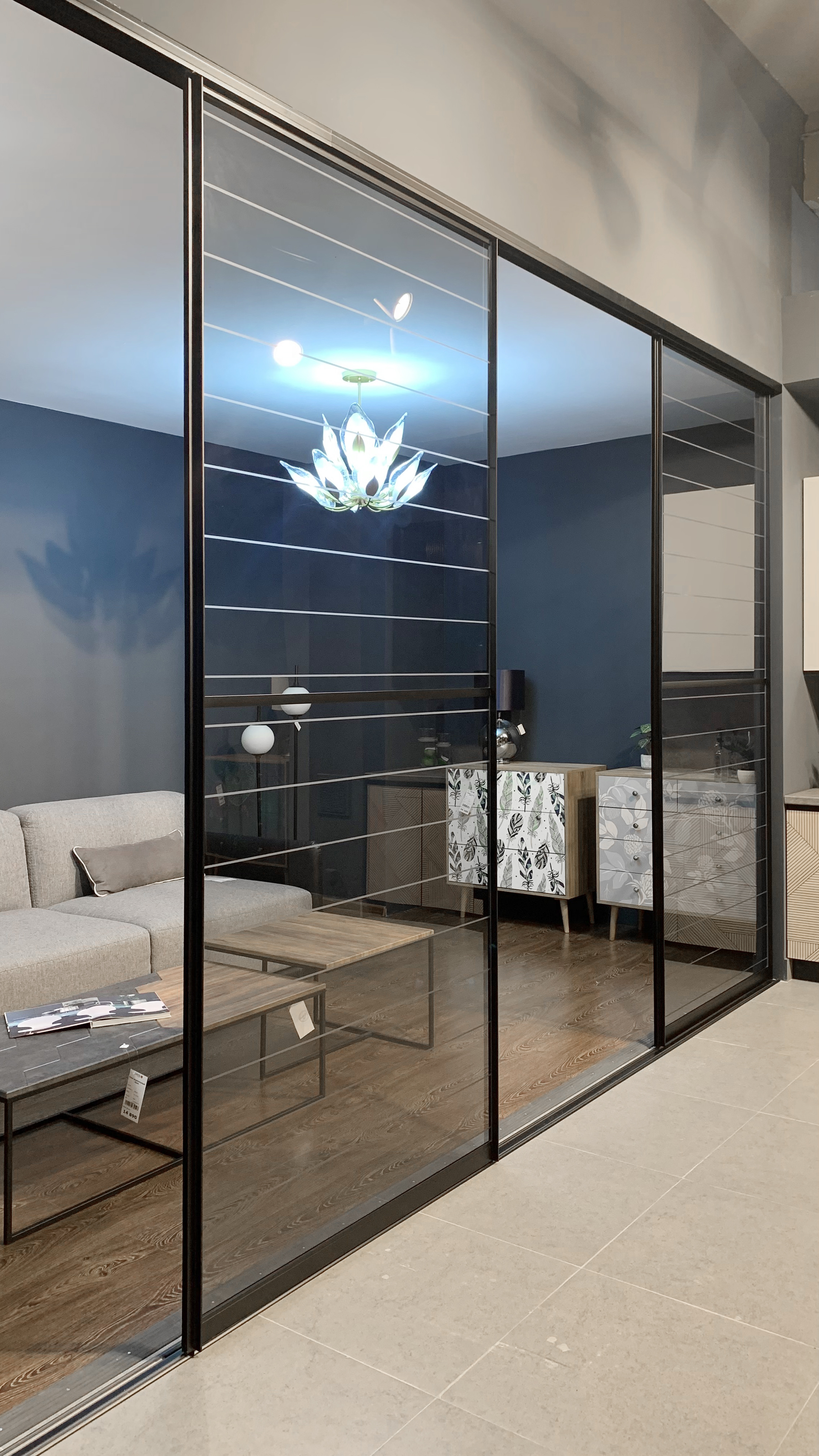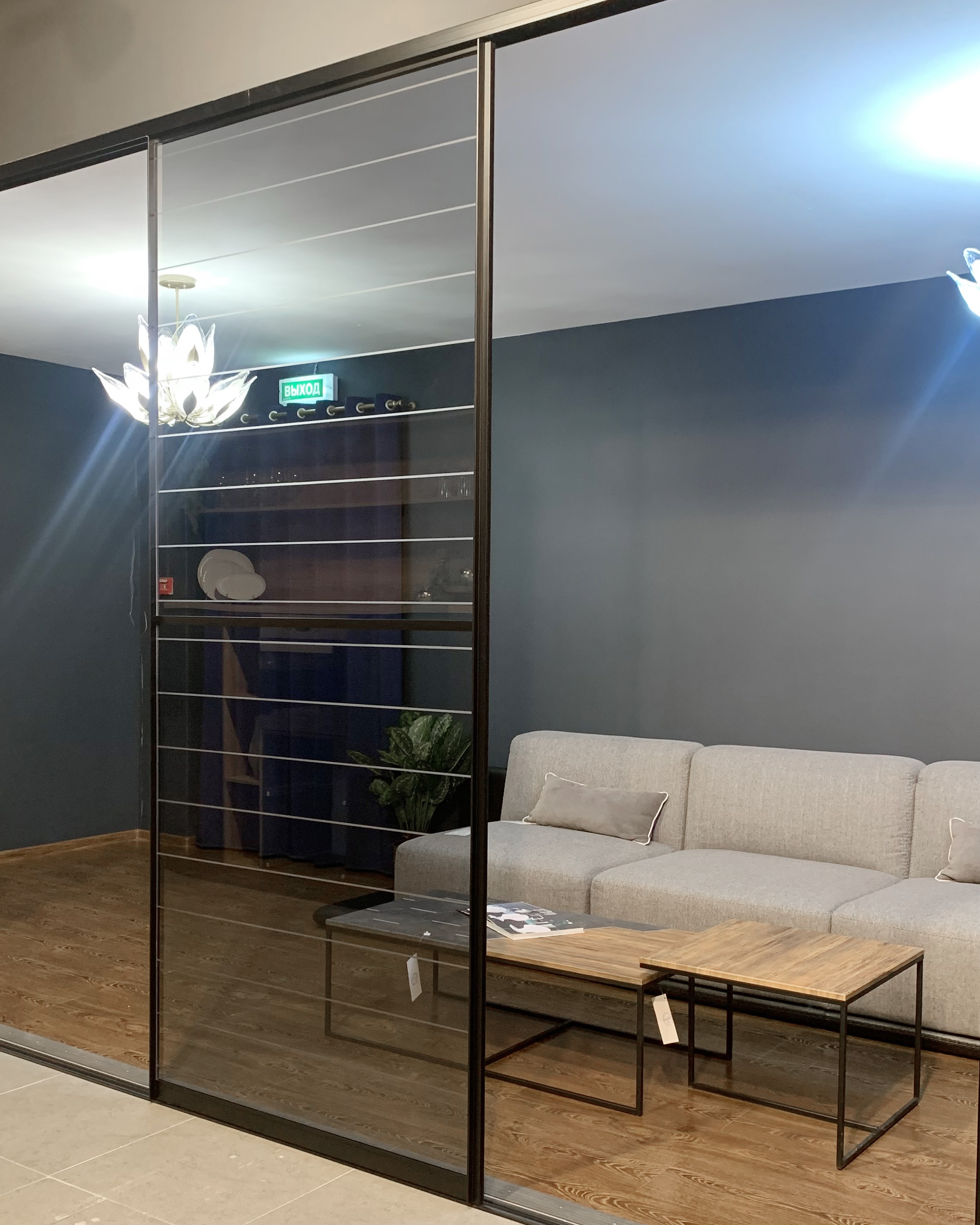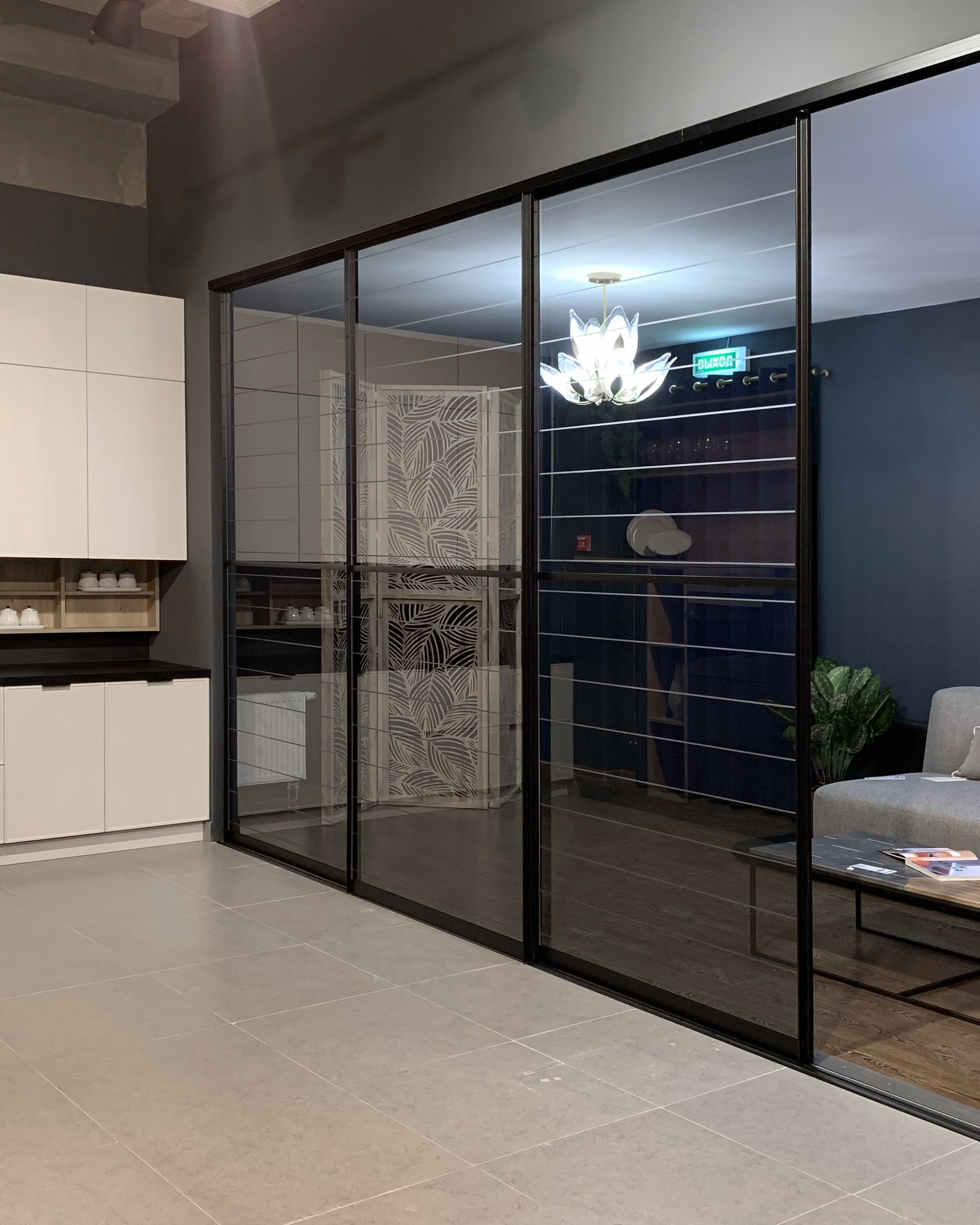 Фасад — прозрачное стекло с гравировкой + пленка ОRACAL, фацетное панно зеркало серебро + пленка ОRACAL