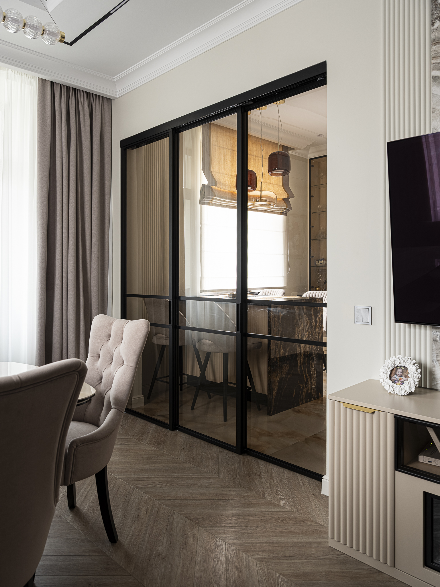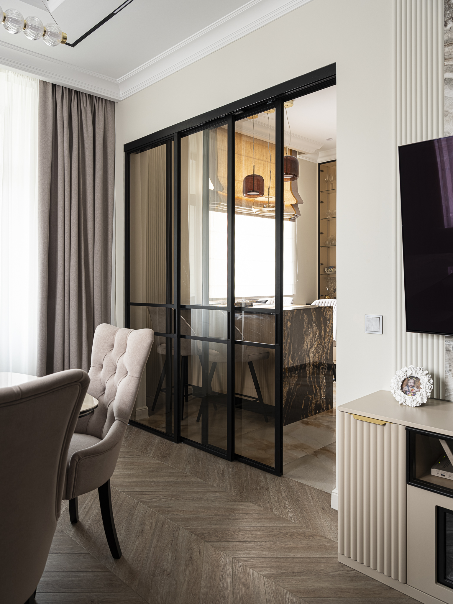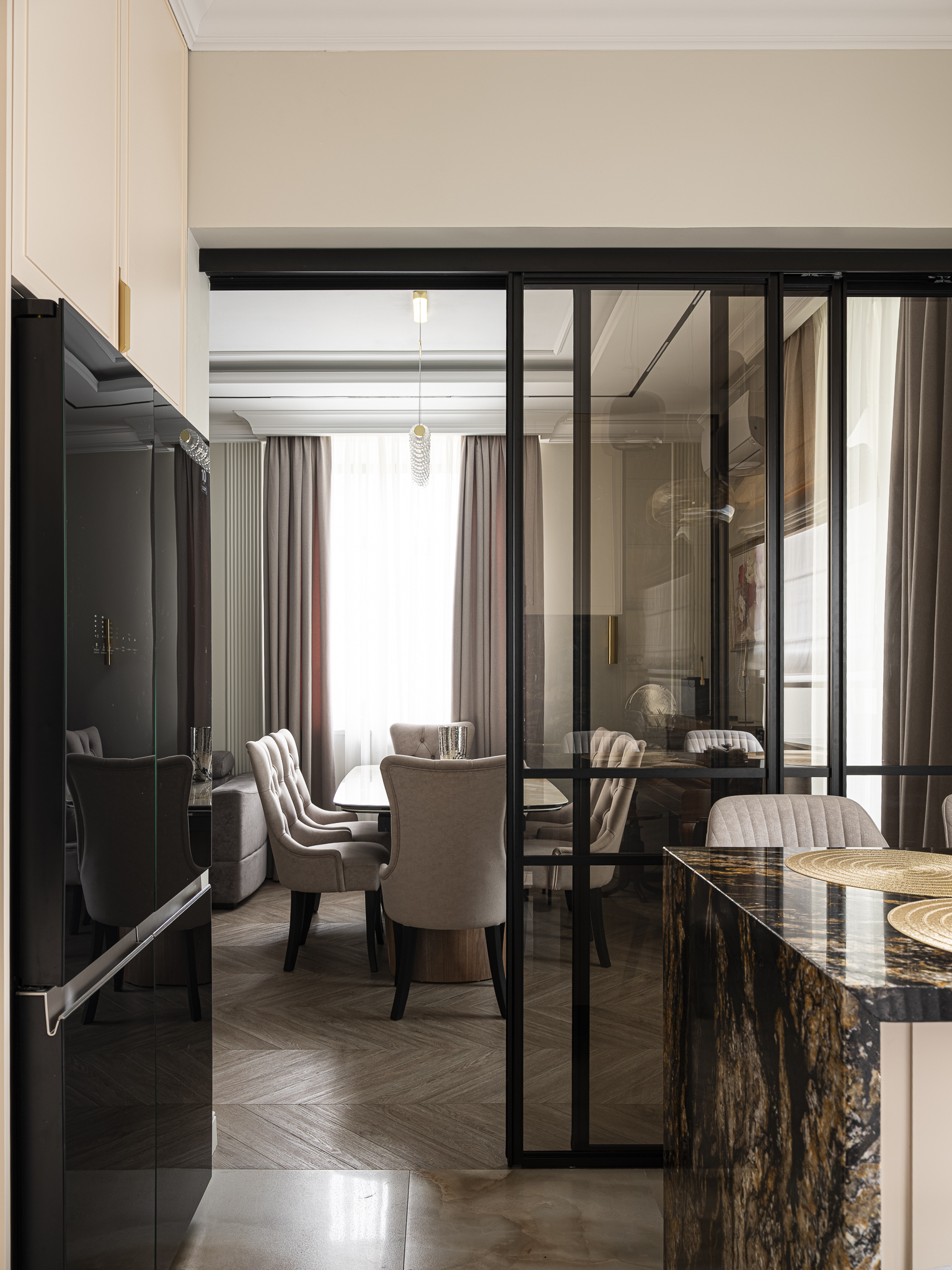Подвесной перегородки-купе, которая отделяет кухонную зону от столовой или гостиной, не перегружая интерьер.