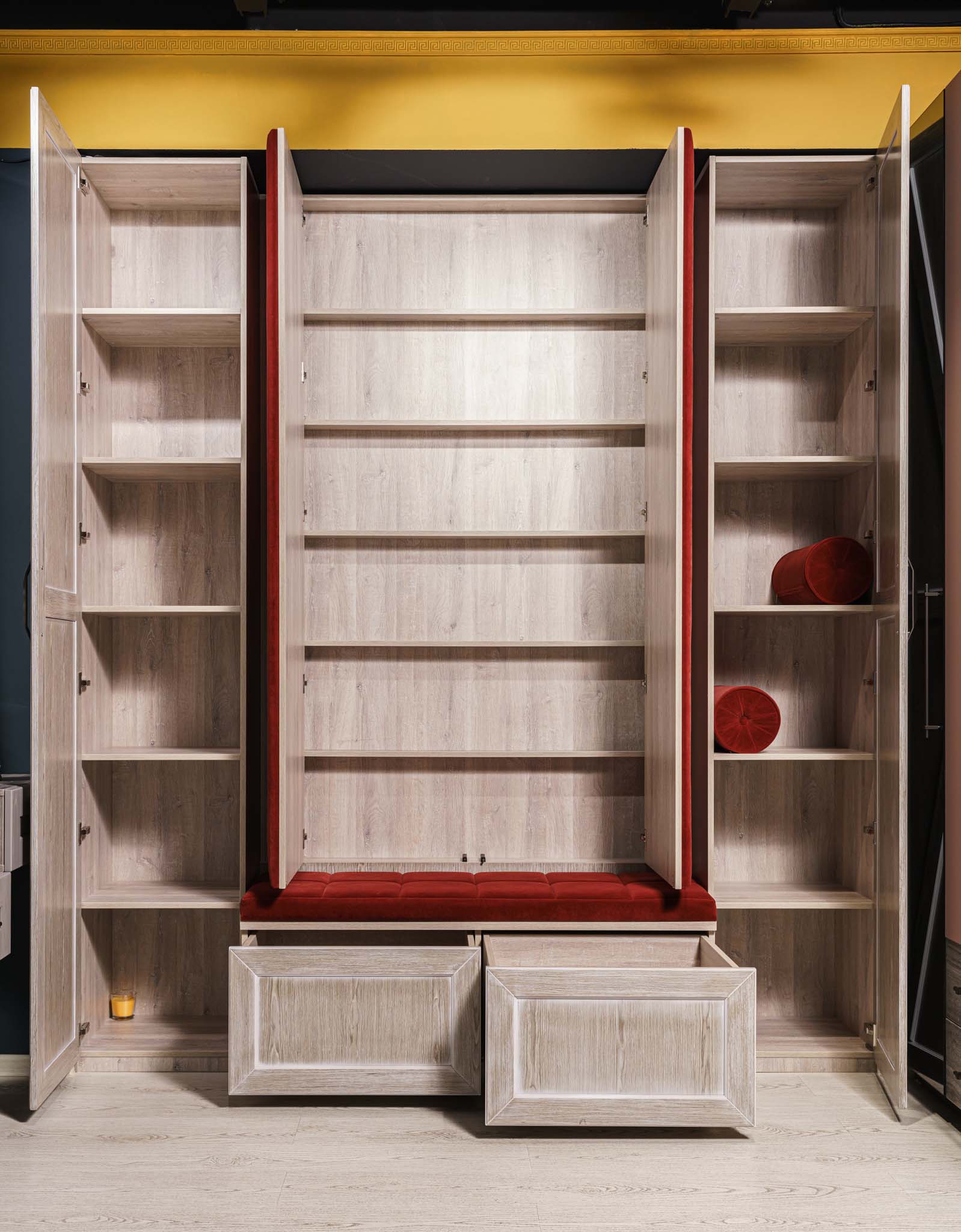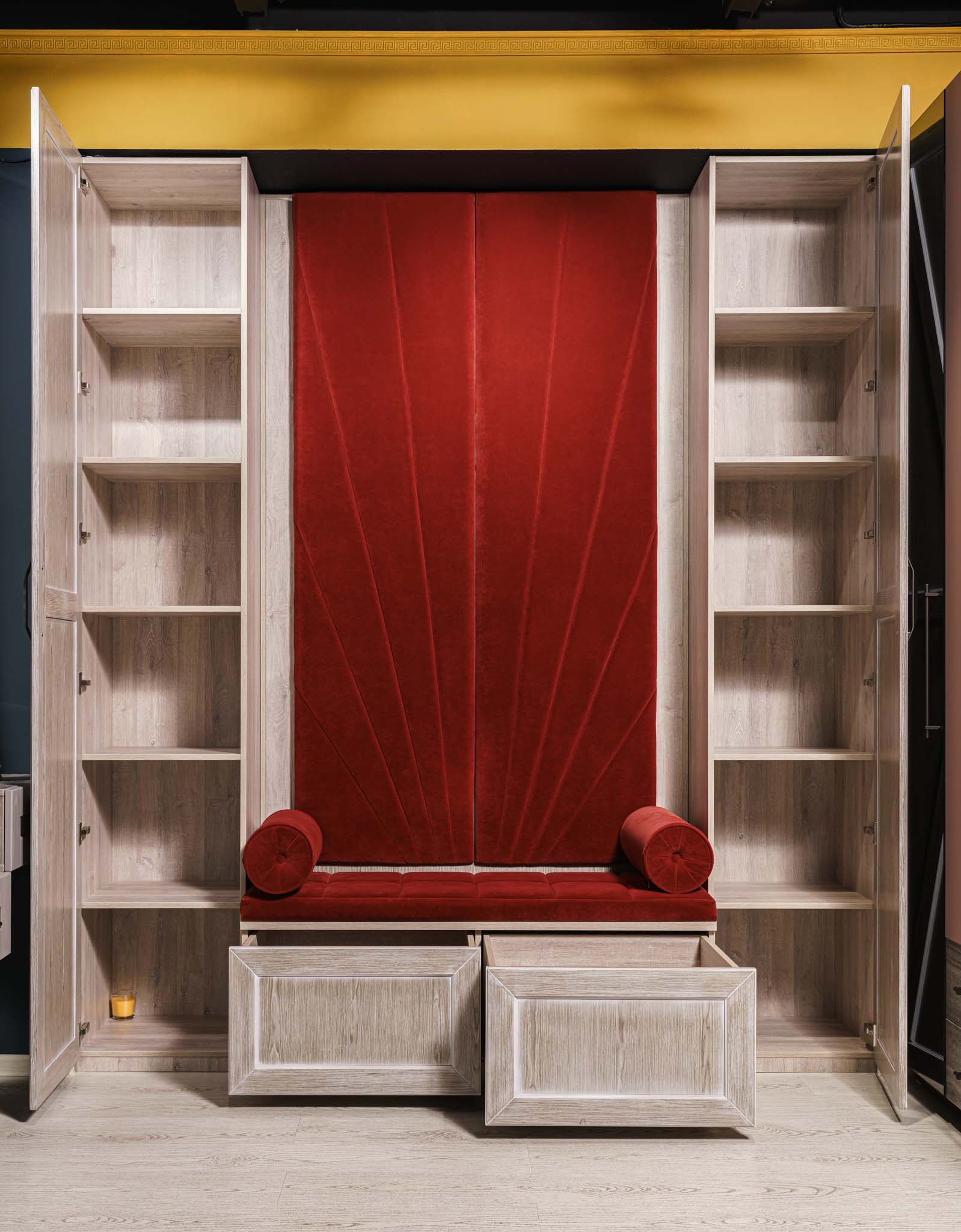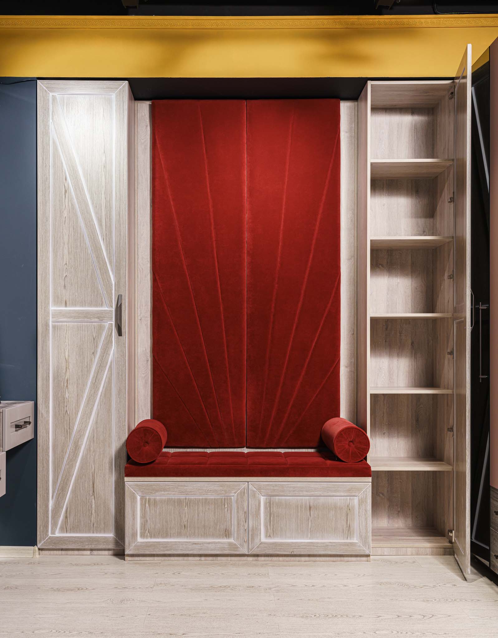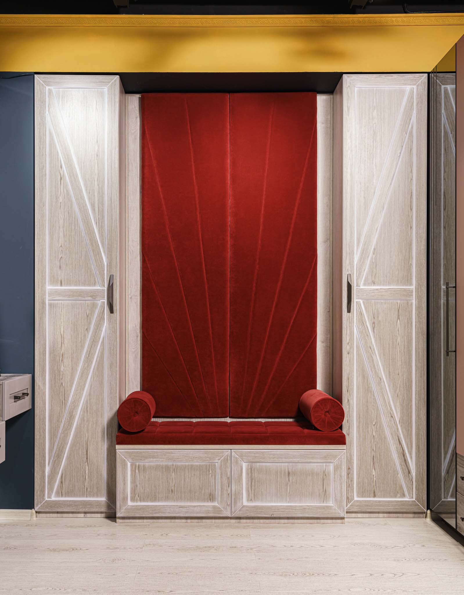 Прихожая с мягким элементом. Комбинированные фасады представлены шпоном и мягкой панелью яркого цвета с индивидуальным рисунком, внутри которой Вы можете расположить все самое необходимое, спрятать щитки и прочие детали. Размеры полок в боковых шкафах позволят разместить в шкафу как аксессуары, так и коробки с обувью. Дополнительным местом для хранения выступают вместительные ящики. Благодаря использованию механизмов Мовенто, ящики легко открываются и закрываются без использования ручек.