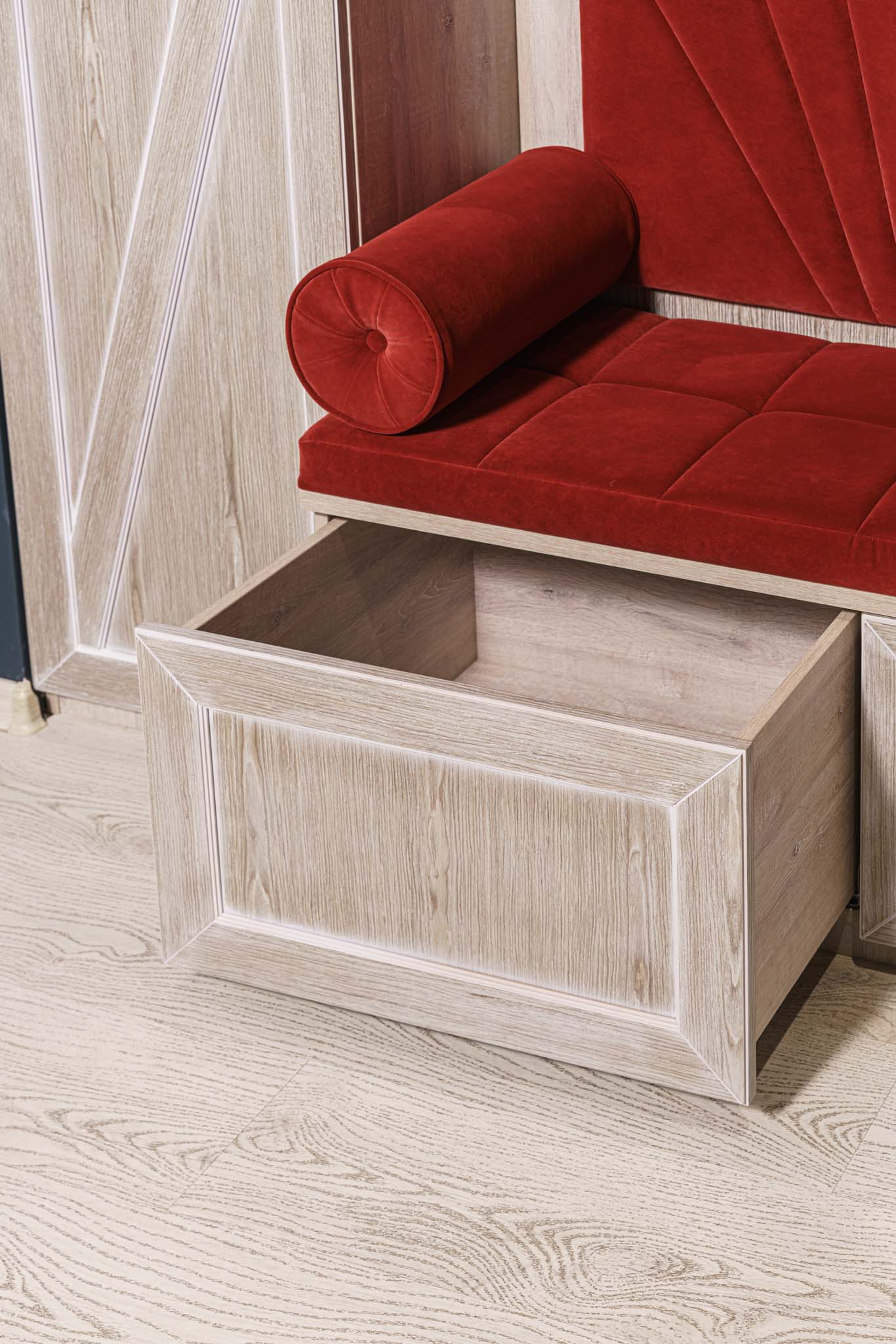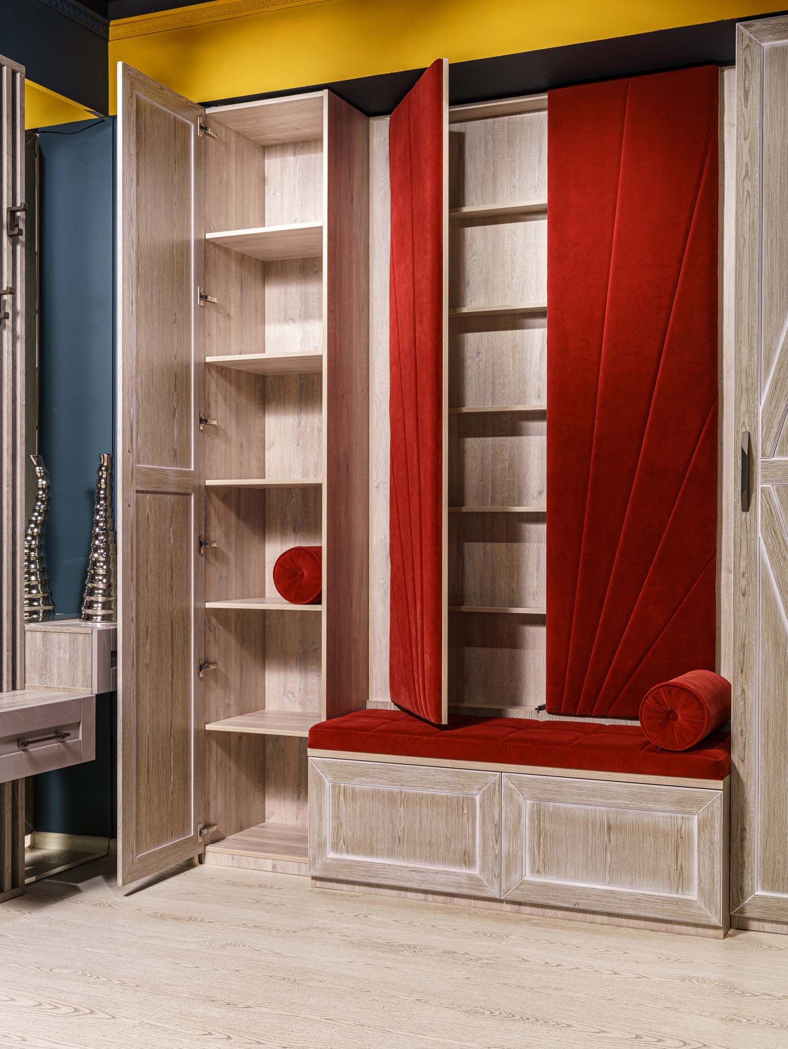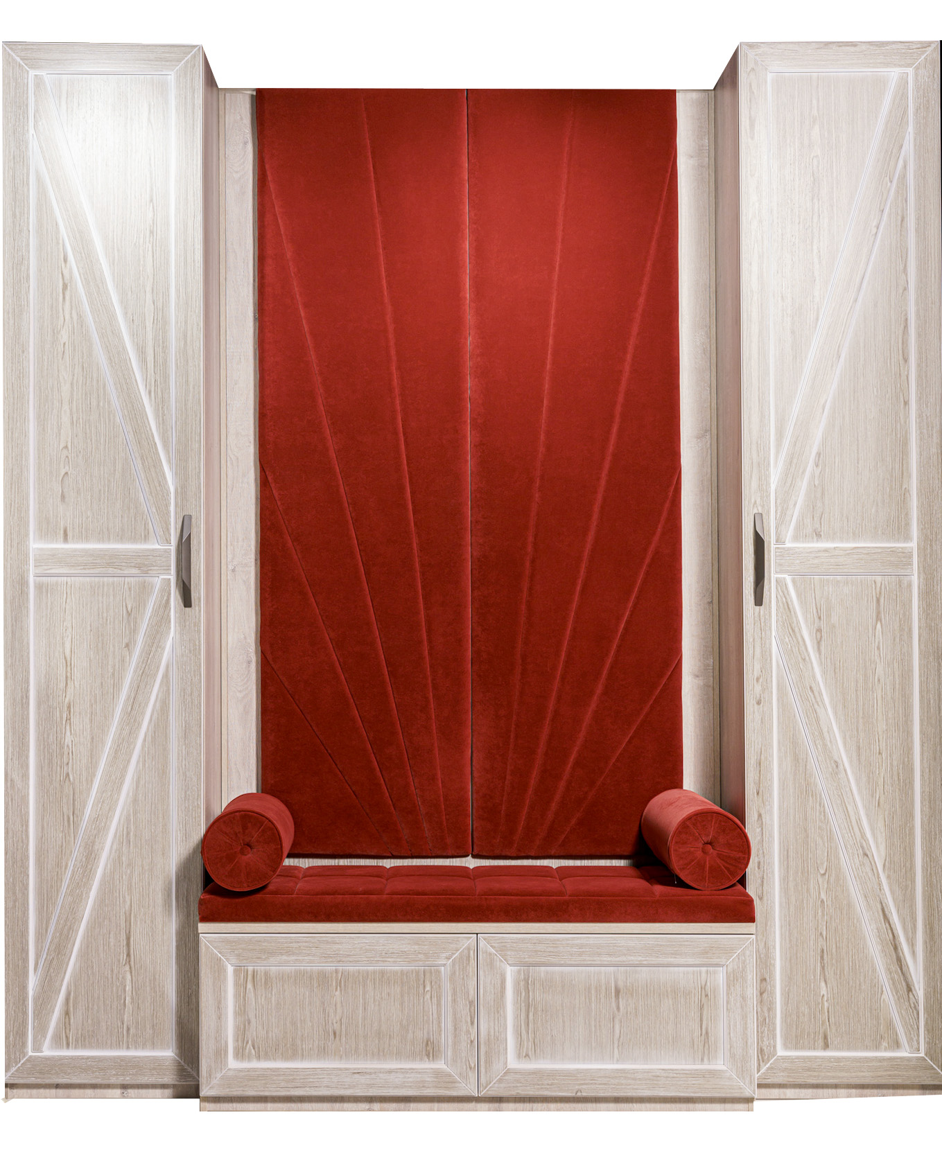 Прихожая с мягким элементом. Комбинированные фасады представлены шпоном и мягкой панелью яркого цвета с индивидуальным рисунком, внутри которой Вы можете расположить все самое необходимое, спрятать щитки и прочие детали. Размеры полок в боковых шкафах позволят разместить в шкафу как аксессуары, так и коробки с обувью. Дополнительным местом для хранения выступают вместительные ящики. Благодаря использованию механизмов Мовенто, ящики легко открываются и закрываются без использования ручек.