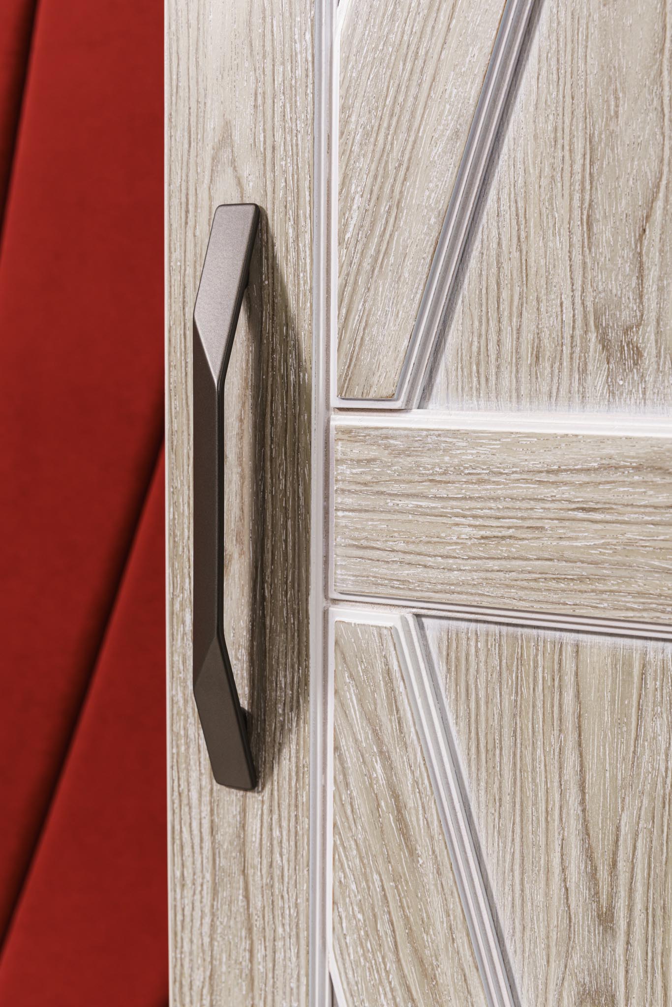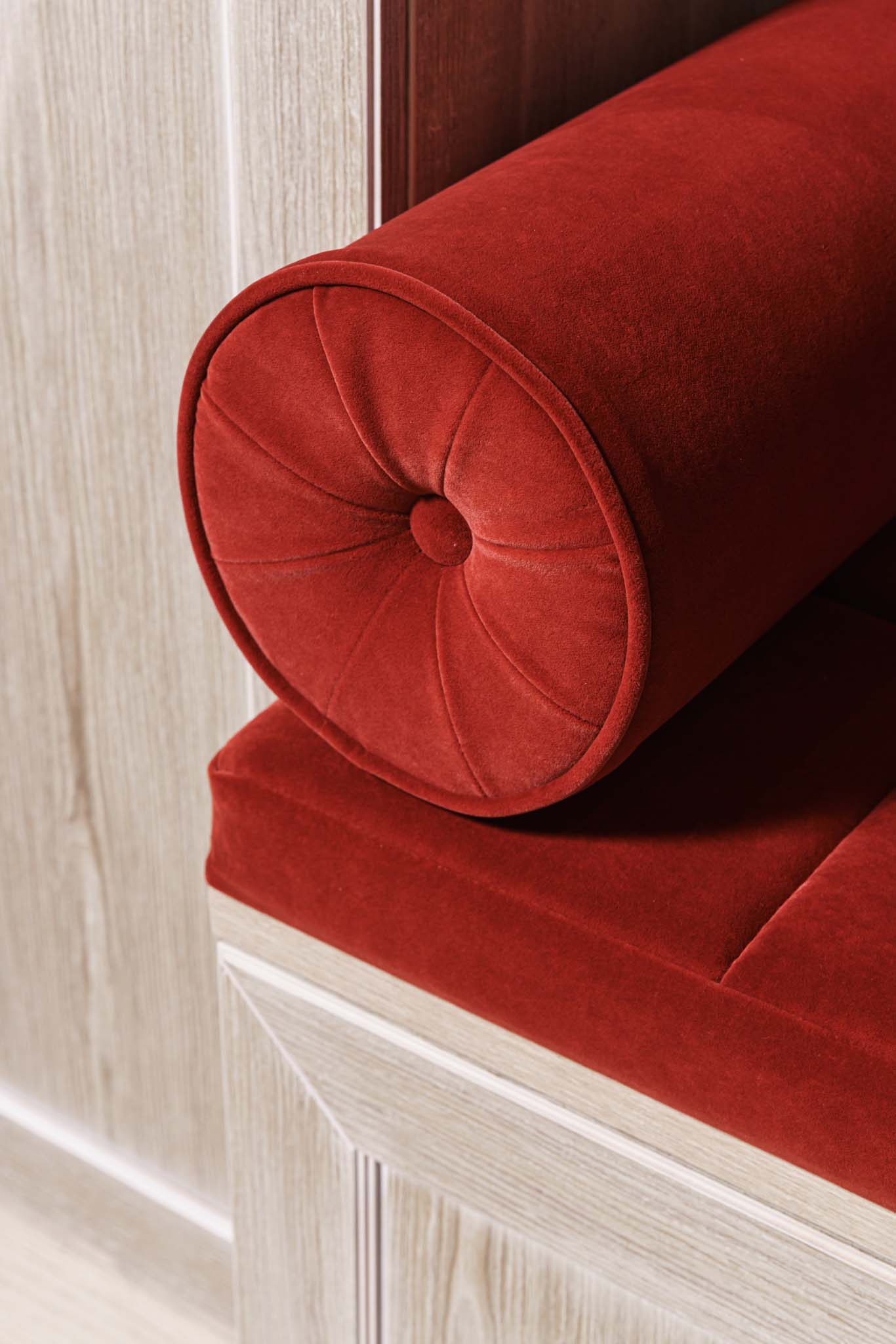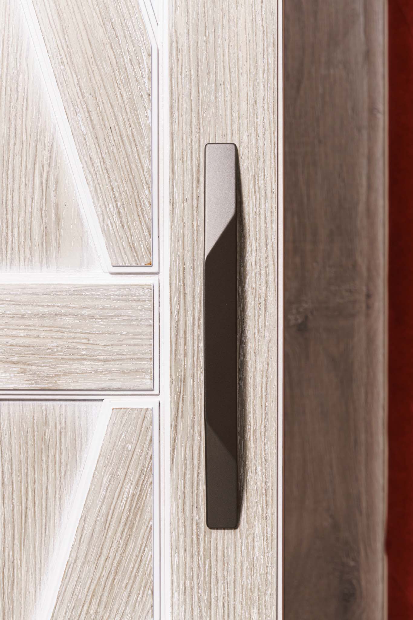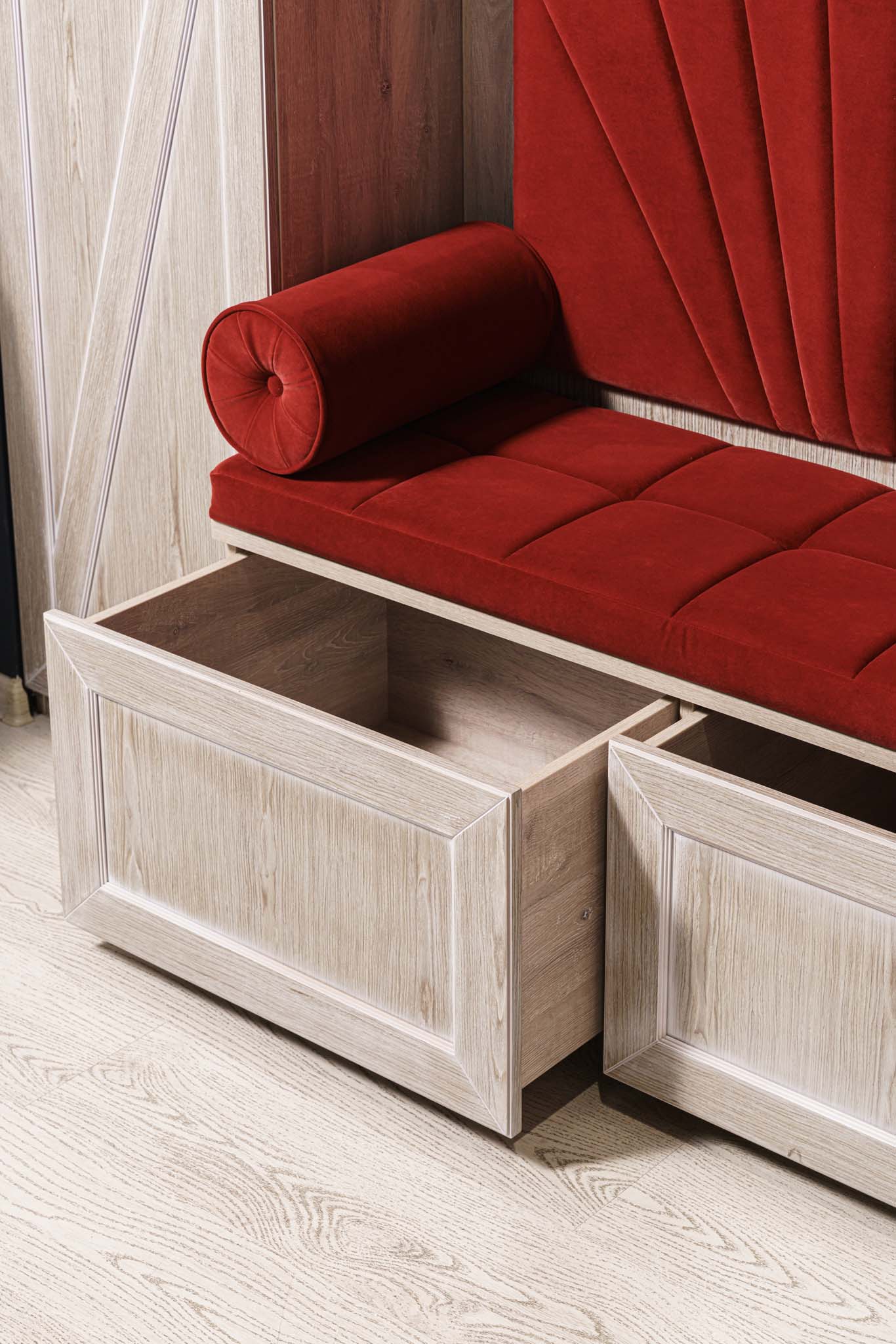 Прихожая с мягким элементом. Комбинированные фасады представлены шпоном и мягкой панелью яркого цвета с индивидуальным рисунком, внутри которой Вы можете расположить все самое необходимое, спрятать щитки и прочие детали. Размеры полок в боковых шкафах позволят разместить в шкафу как аксессуары, так и коробки с обувью. Дополнительным местом для хранения выступают вместительные ящики. Благодаря использованию механизмов Мовенто, ящики легко открываются и закрываются без использования ручек.