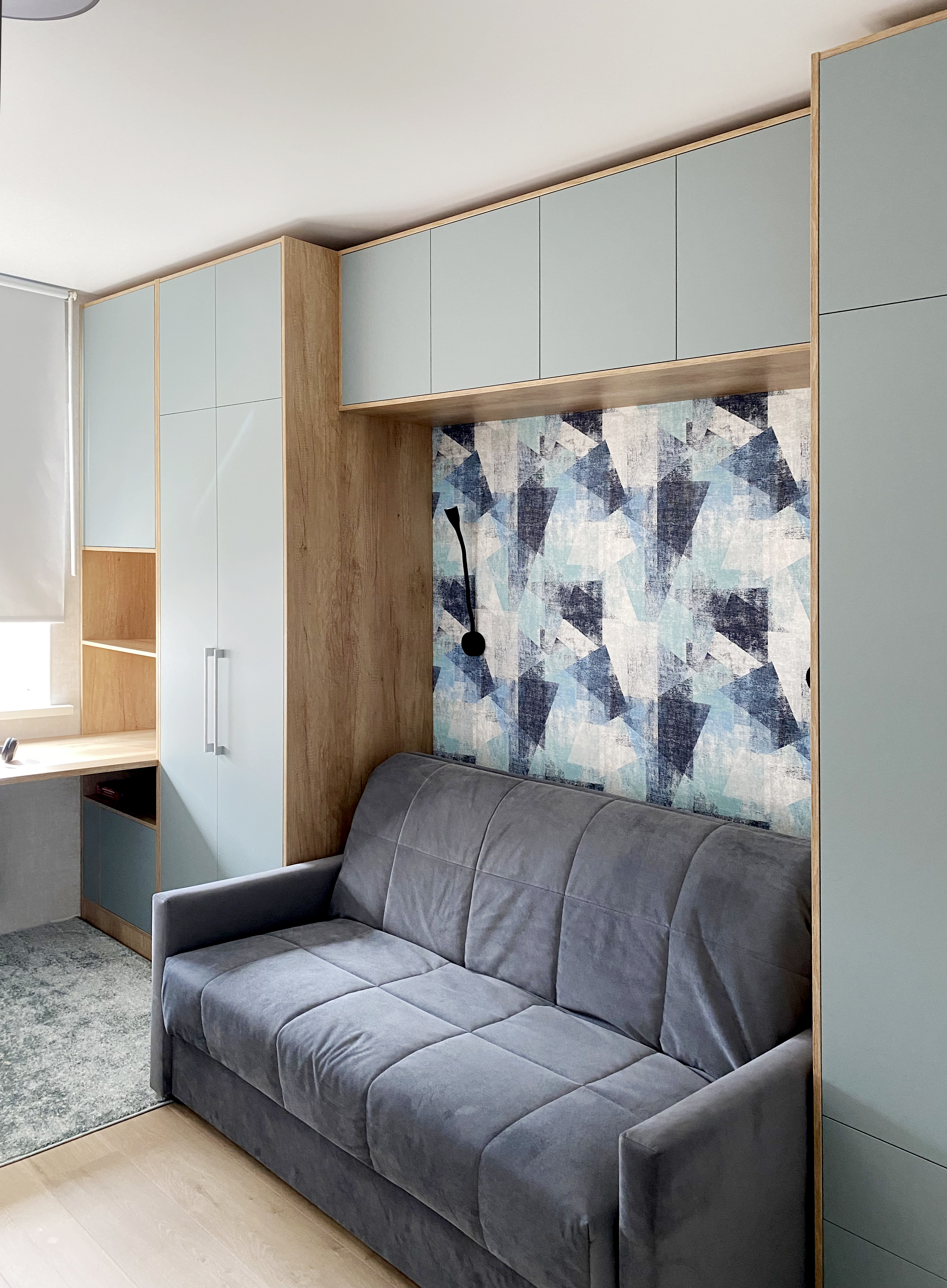 Мебель с фасадами из МДФ AGT суперматовой коллекции, поверхность которых обладает самовосстанавливающими свойствами. Декор фасада - Макарон Грин