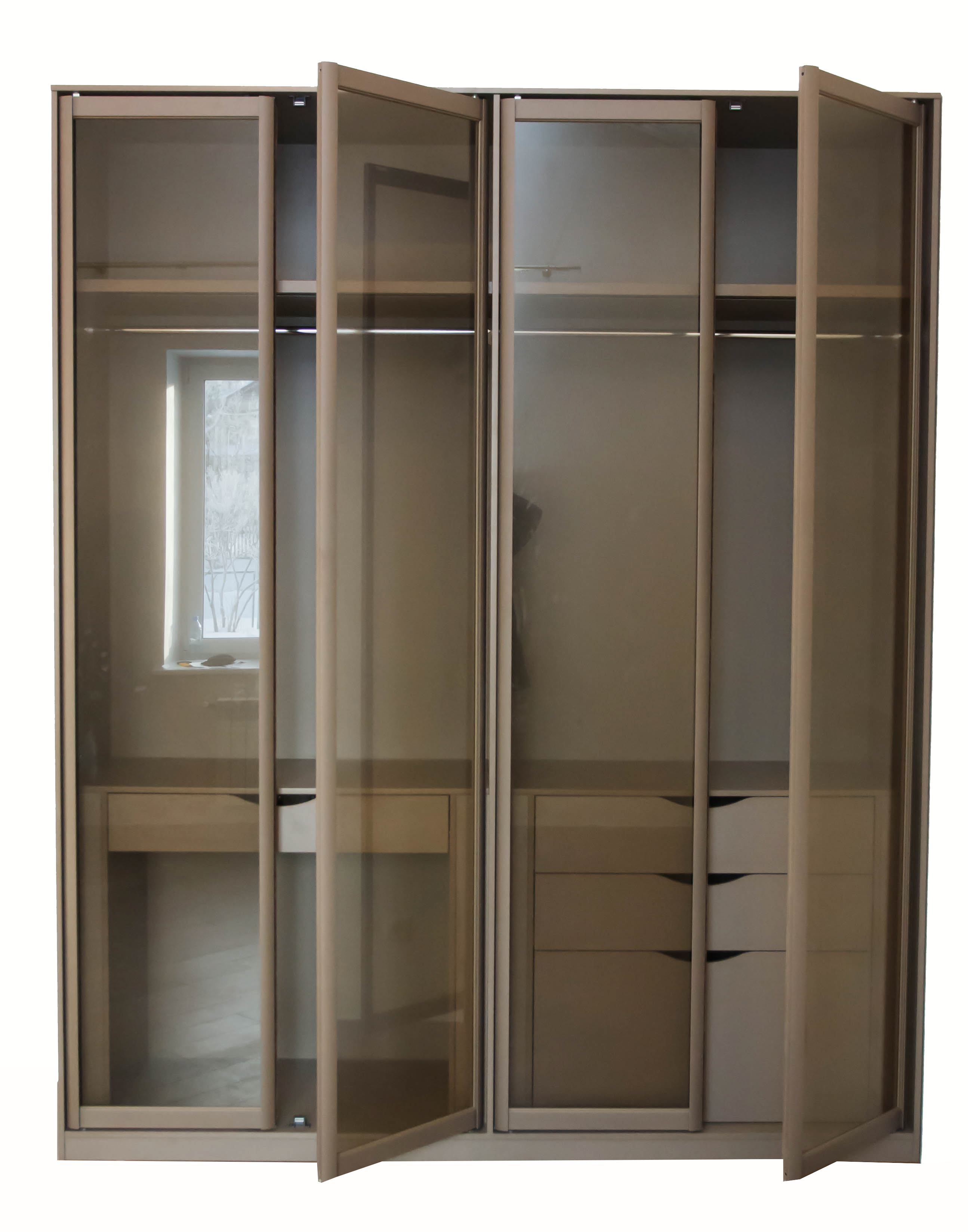 - Модерн — шкаф-купе светлого цвета. Дверь с отделкой цвета дерева. Возможно выполнение из пластика. Основные линии и углы плавные. Главное украшение — шикарные узоры из пескоструя или других техник.