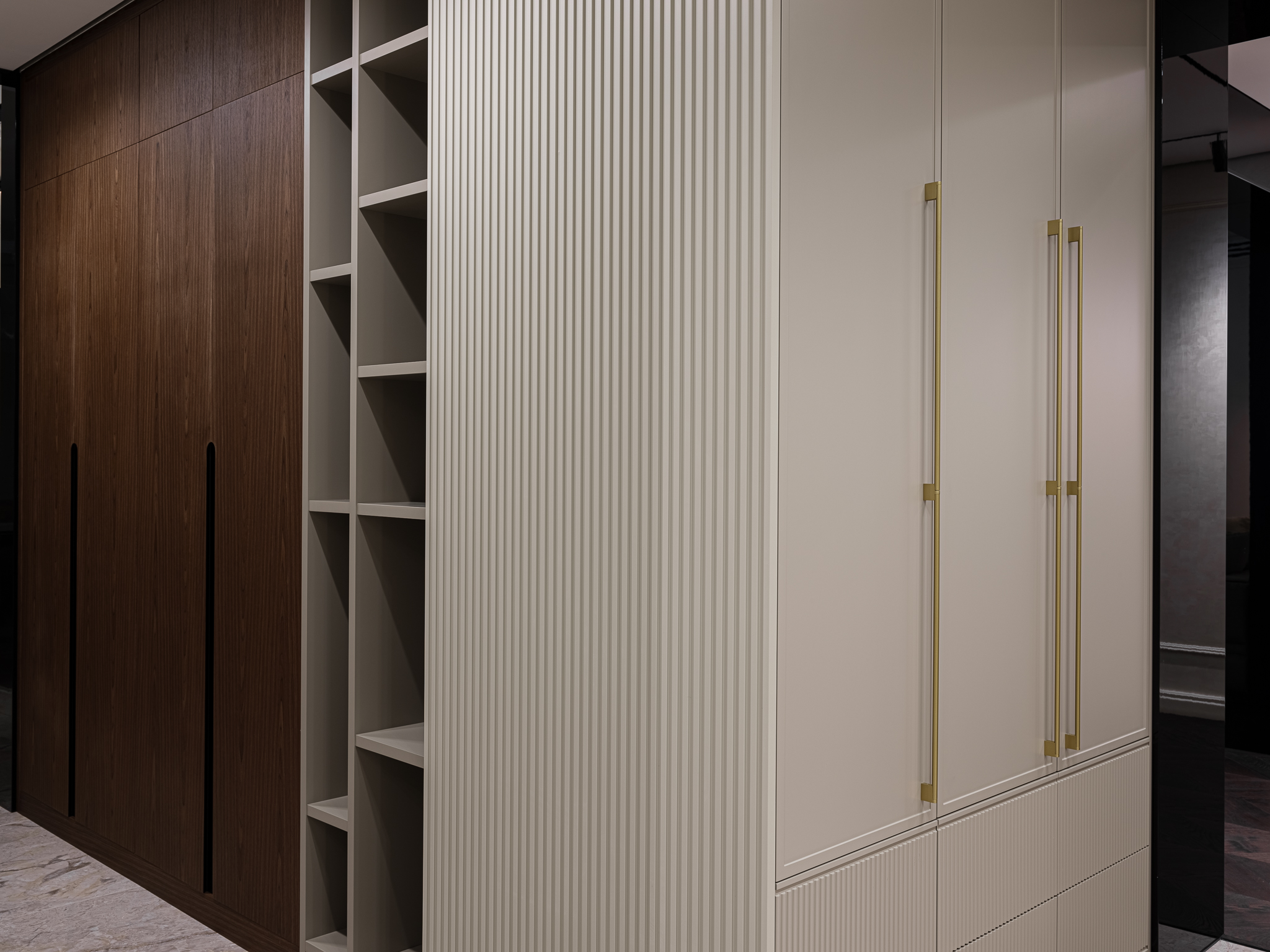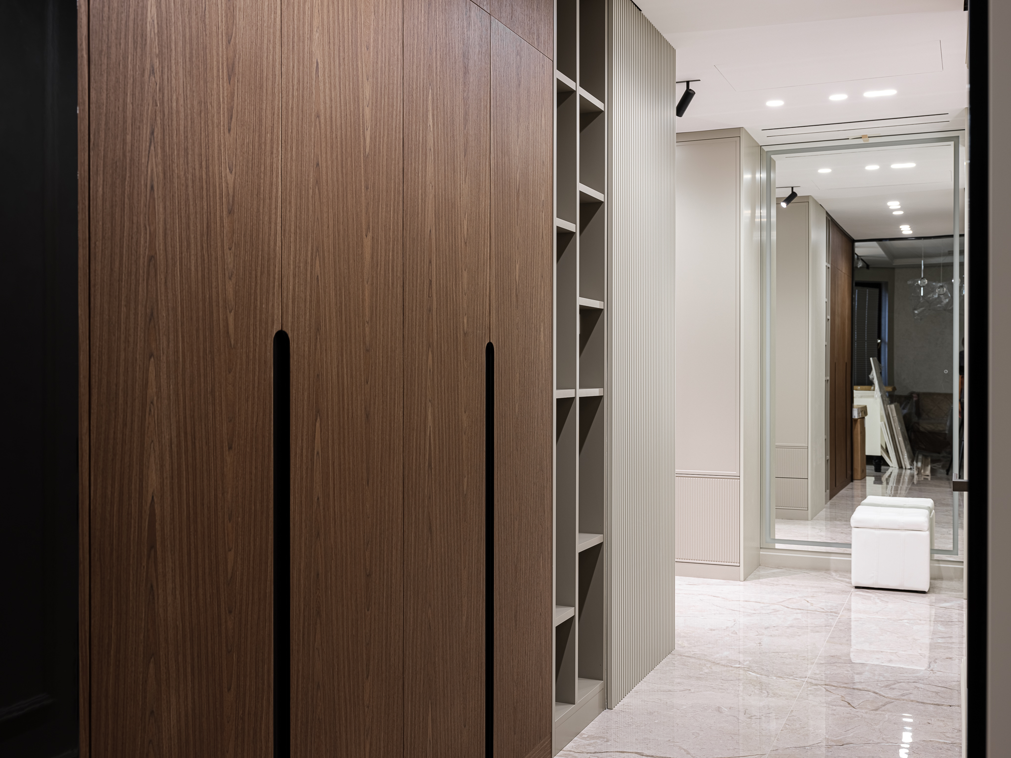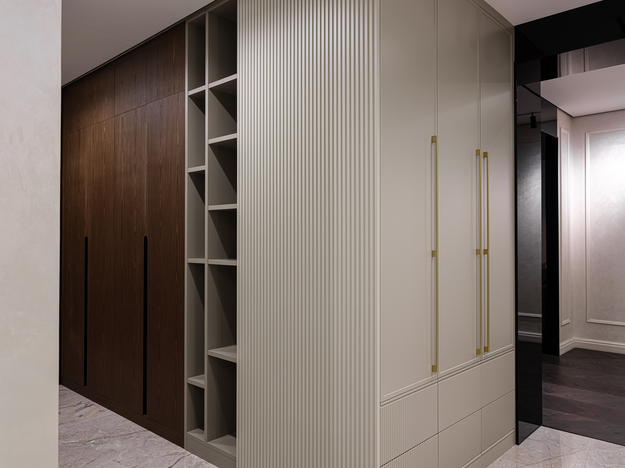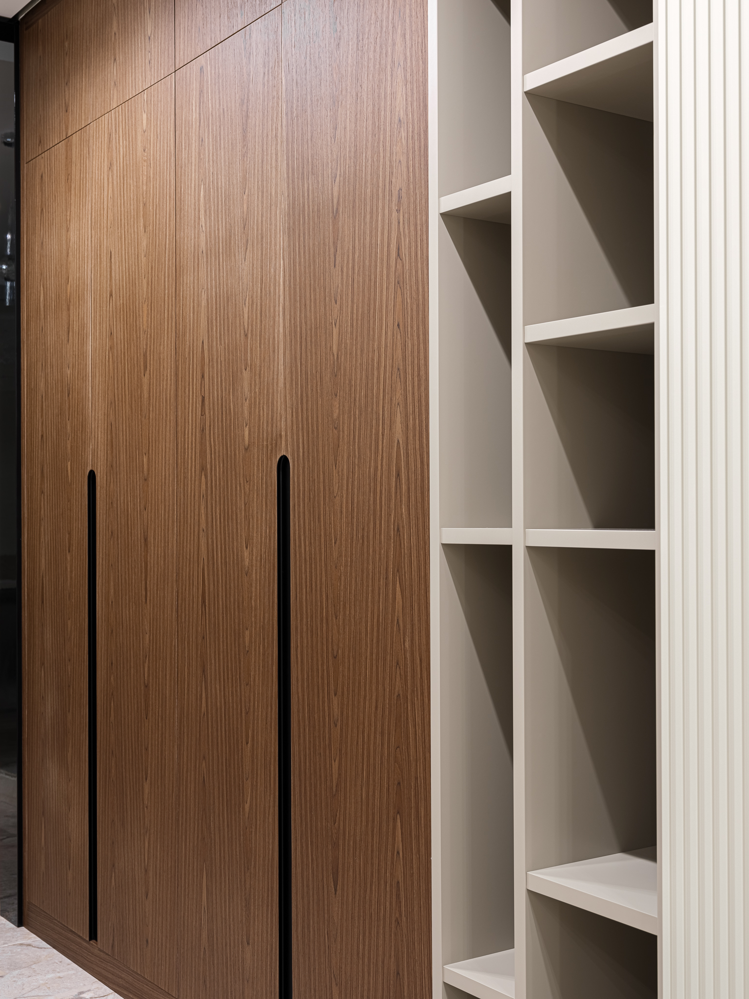 Распашной шкаф из шпона, который сочетает в себе элегантность и функциональность, обеспечивая удобное хранение вещей. Интегрированные ручки гармонично вписываются в дизайн шкафа, делая его внешний вид более современным и стильным.