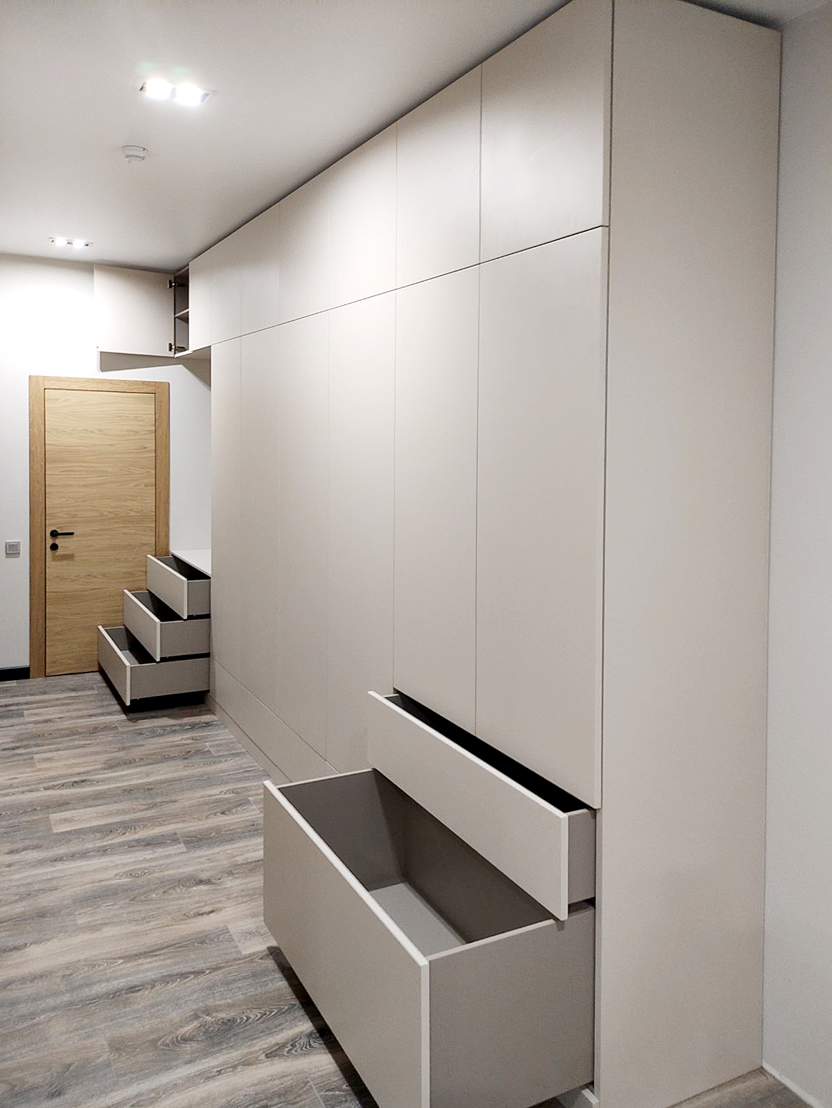 Прихожая с распашными фасадами из МДФ эмаль (покрас по Ral) , которые обладают плотной структурой, аналогичной структуре натурального дерева. Прочные и высокоустойчивые плиты МДФ позволяют реализовать любую дизайнерскую идею.