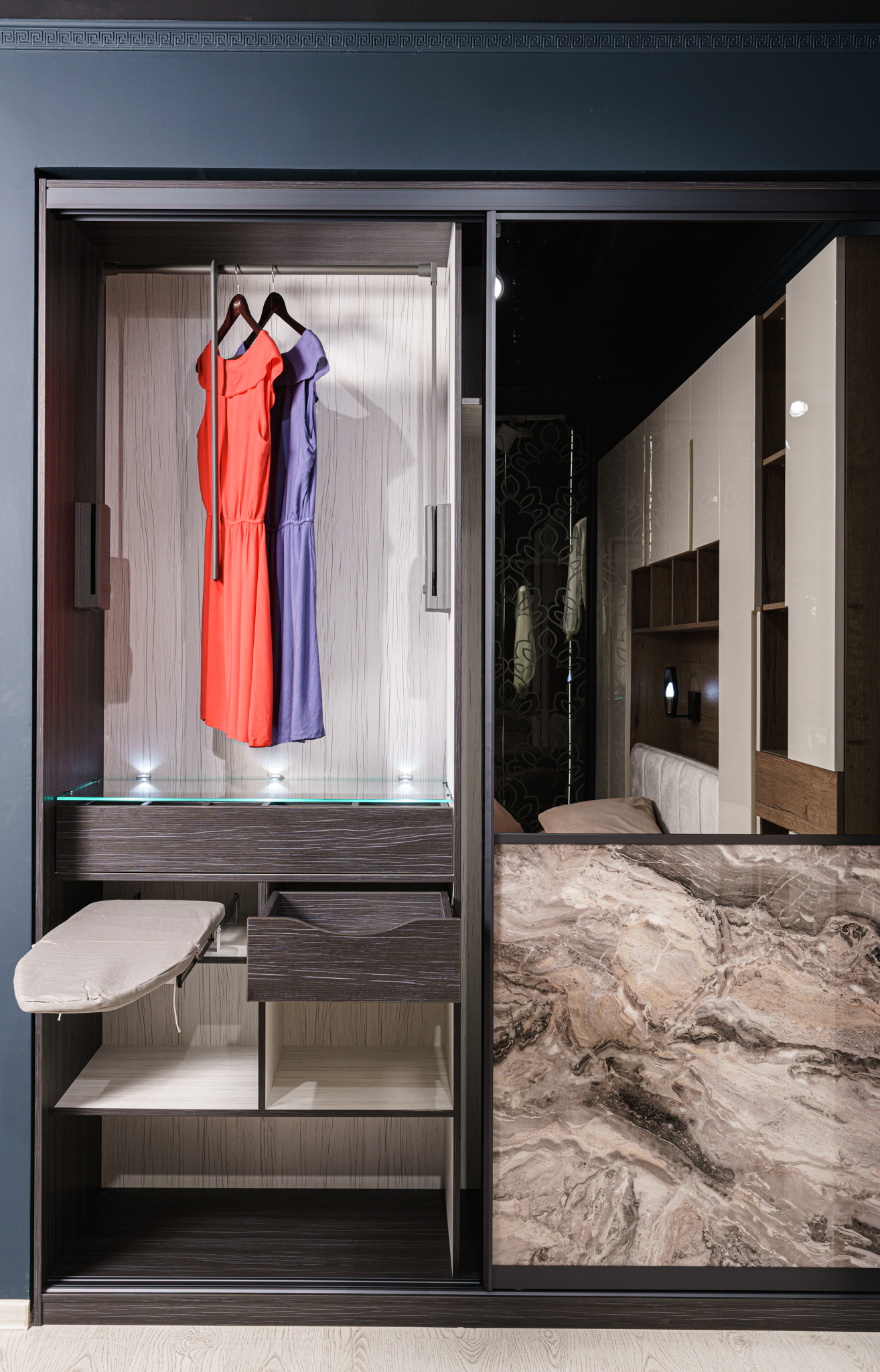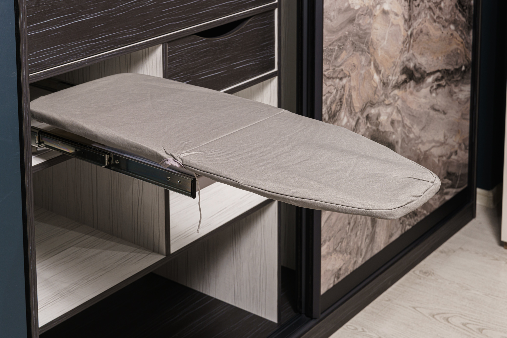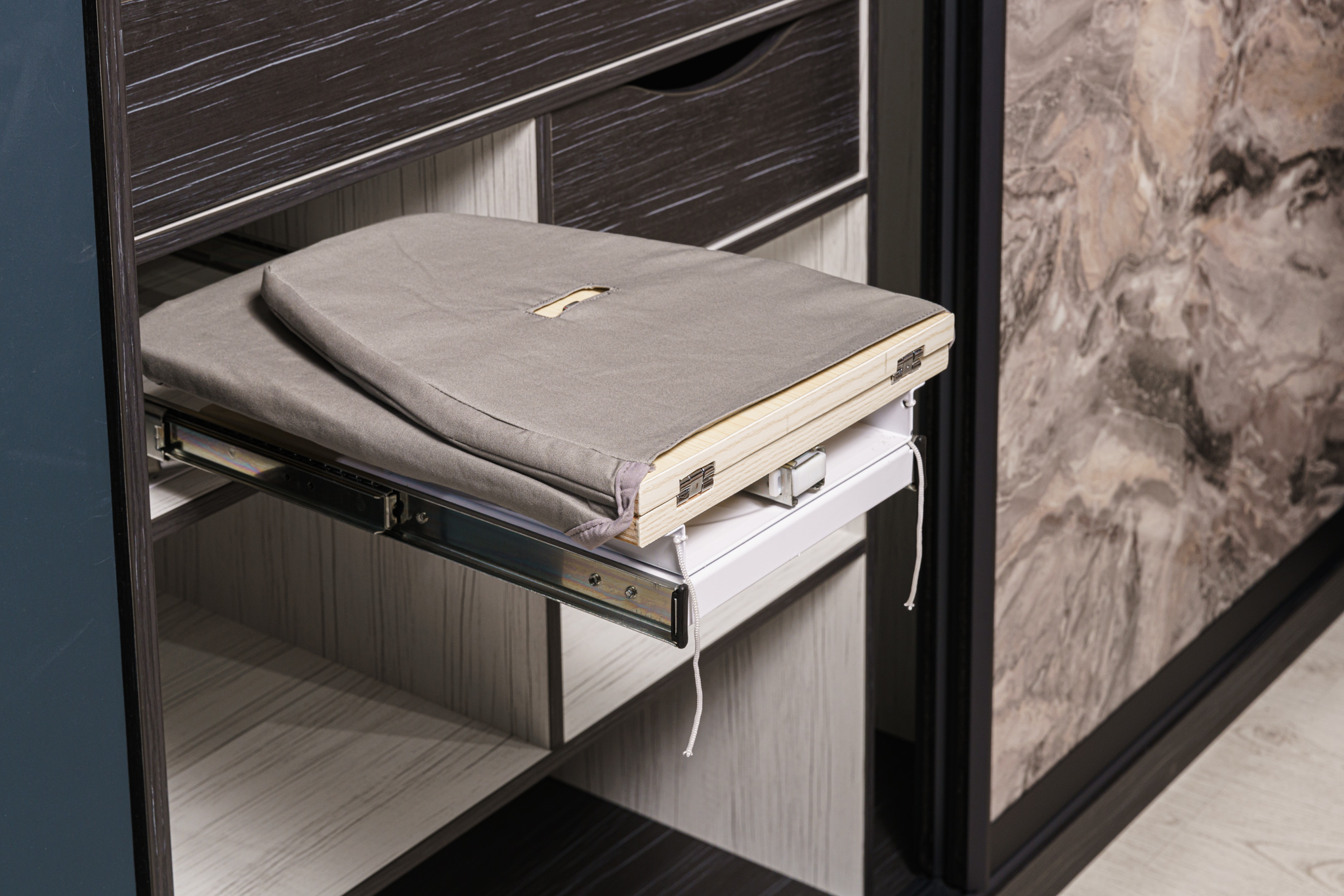 Наполнение: ящики на направляющих Movento+шариковые; пантограф SERVETTO для одежды телескопический; светодиодный светильник-полкодержатель; держатель для утюга; держатель аксессуаров для пылесоса; вешало для брюк, потолочного крепления; гладильная доска встраиваемая поворотная с креплением к полке.
