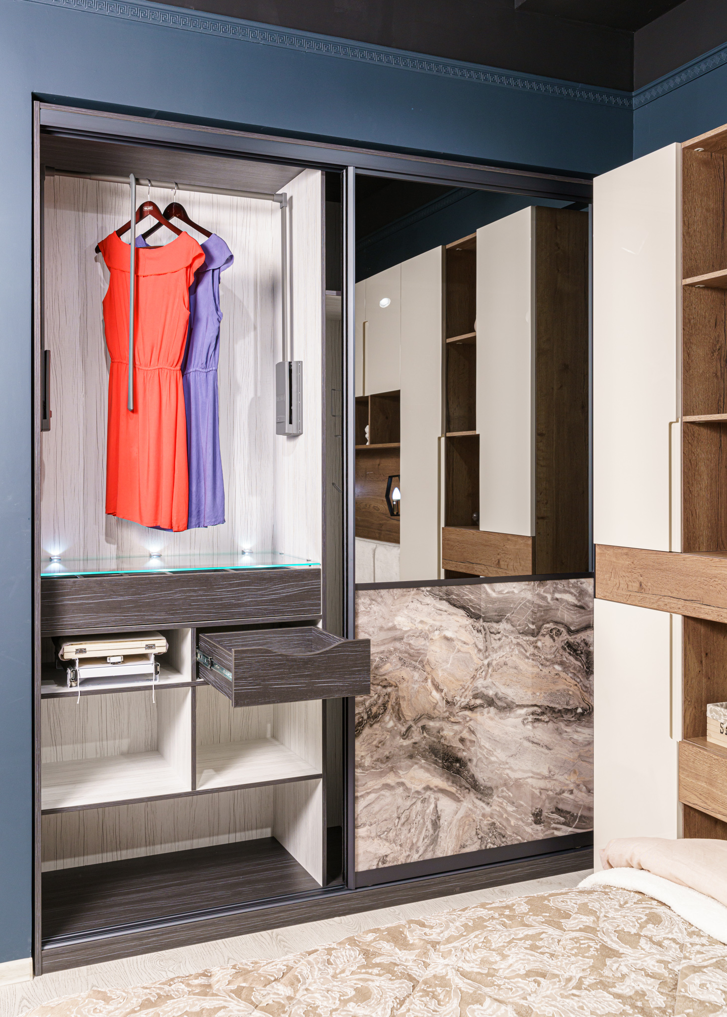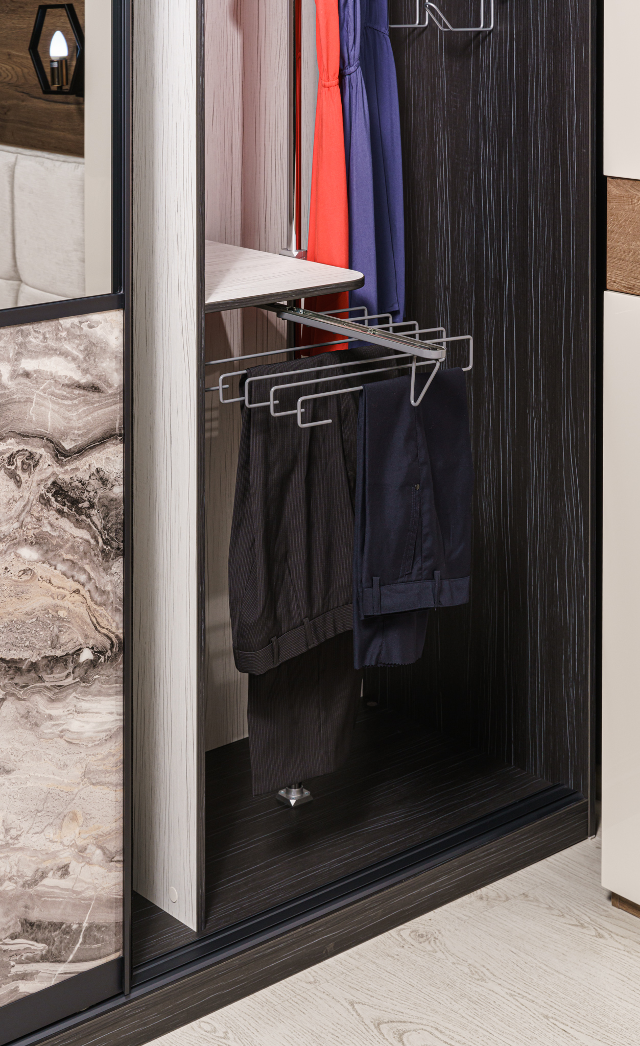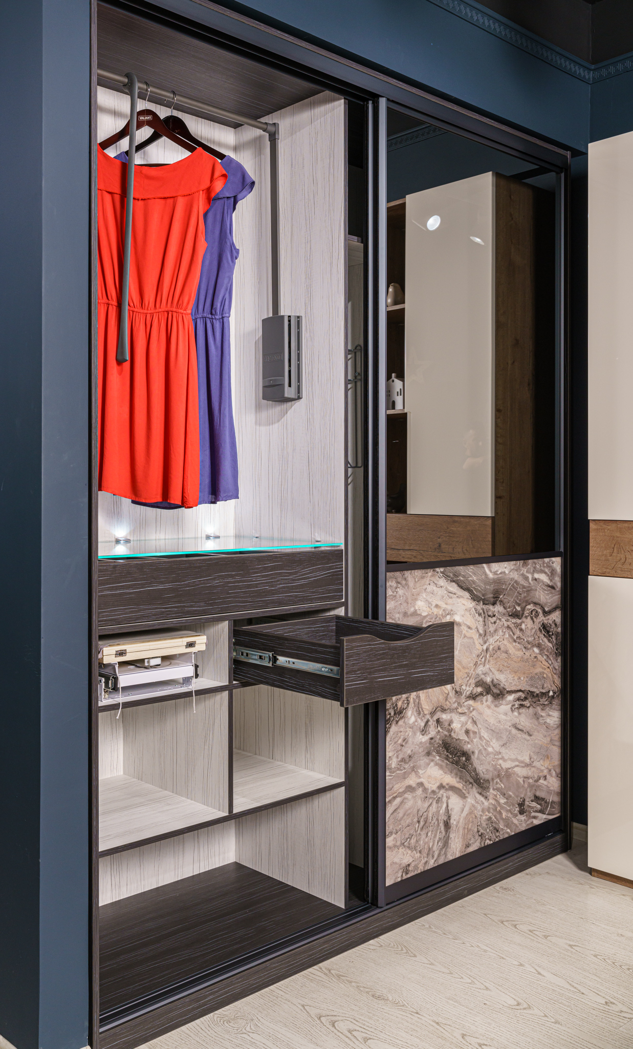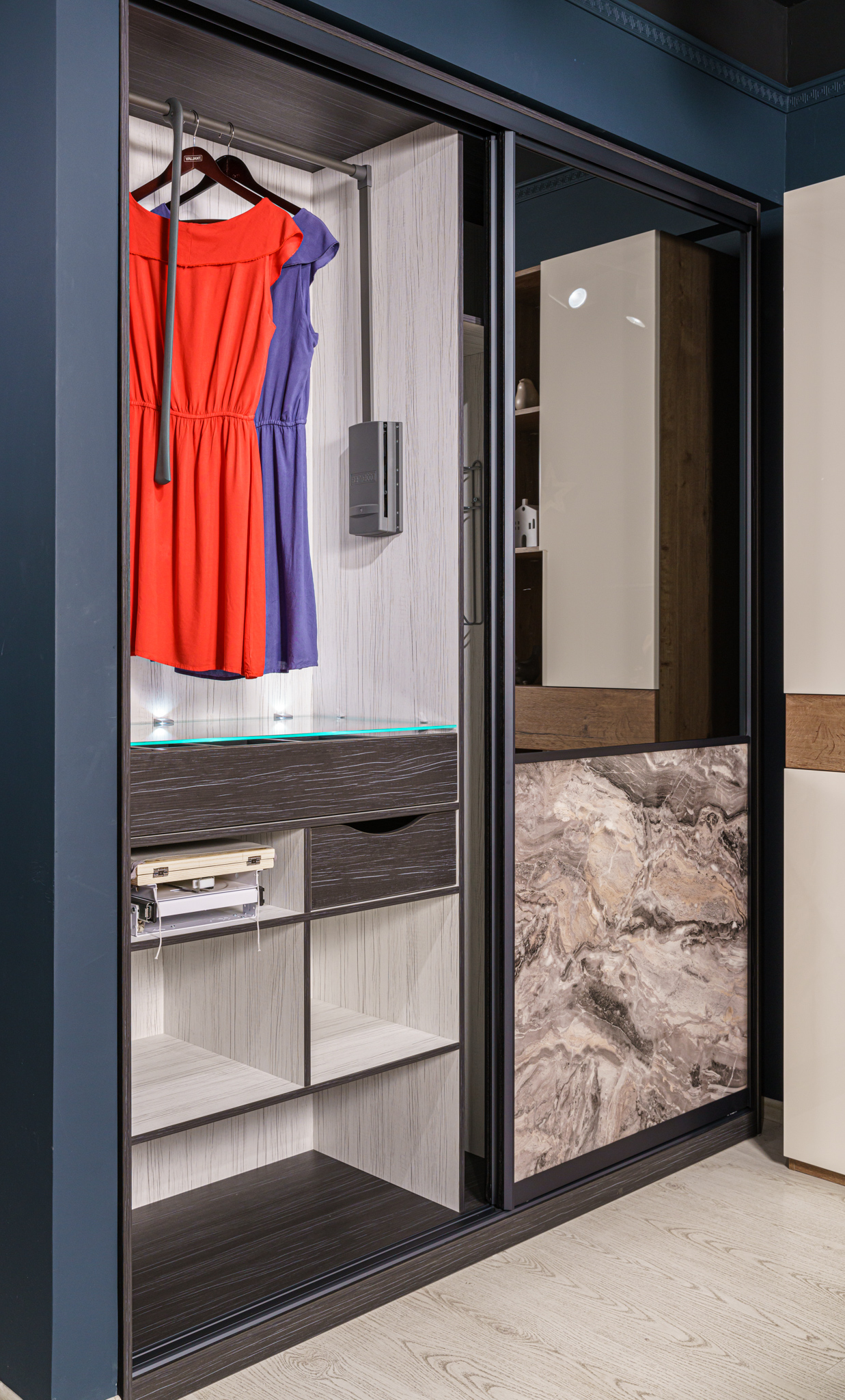 Наполнение: ящики на направляющих Movento+шариковые; пантограф SERVETTO для одежды телескопический; светодиодный светильник-полкодержатель; держатель для утюга; держатель аксессуаров для пылесоса; вешало для брюк, потолочного крепления; гладильная доска встраиваемая поворотная с креплением к полке.
