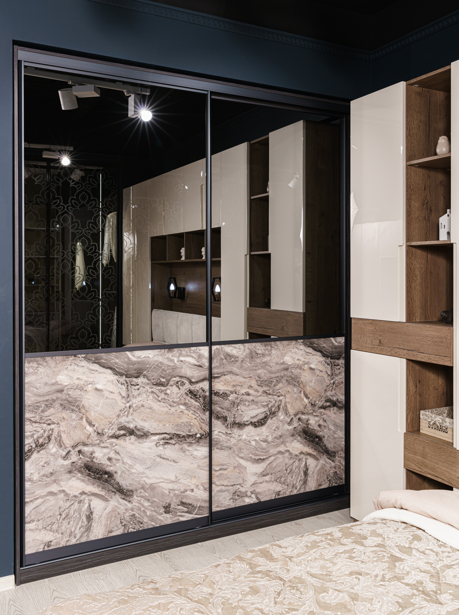 Фасад изделия - профиль SZAFIR графит с наполнением в виде зеркала графит + SIBU