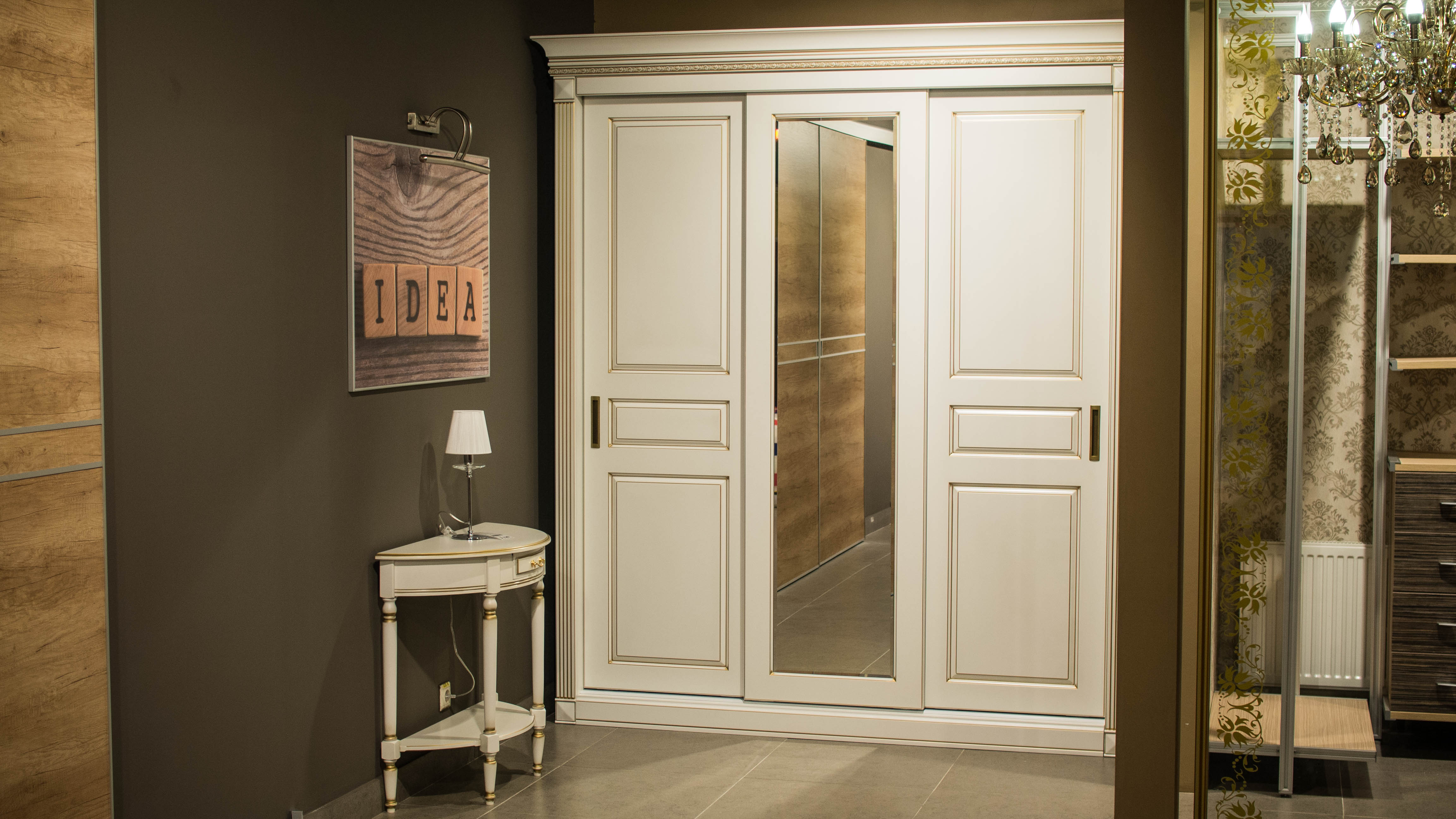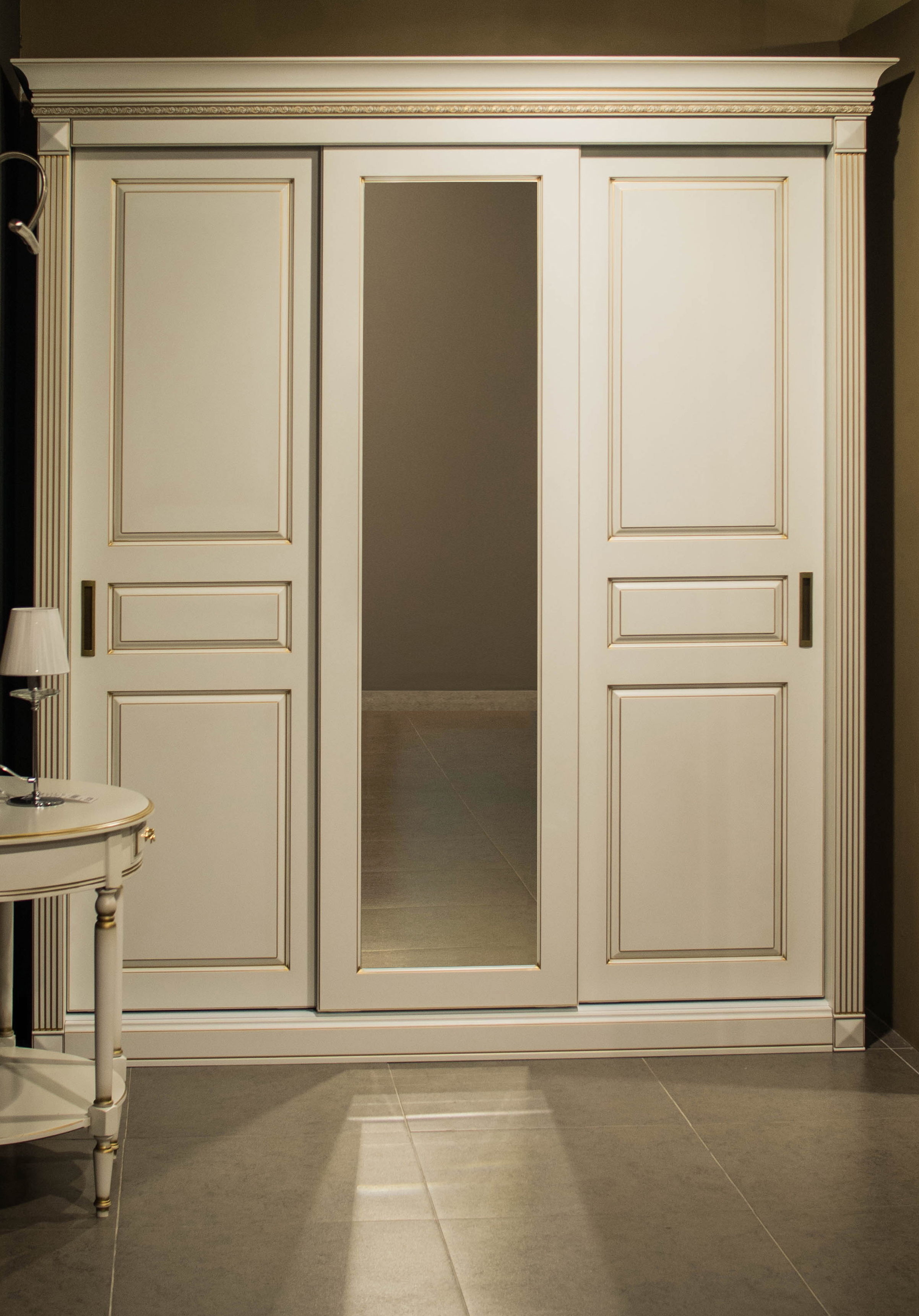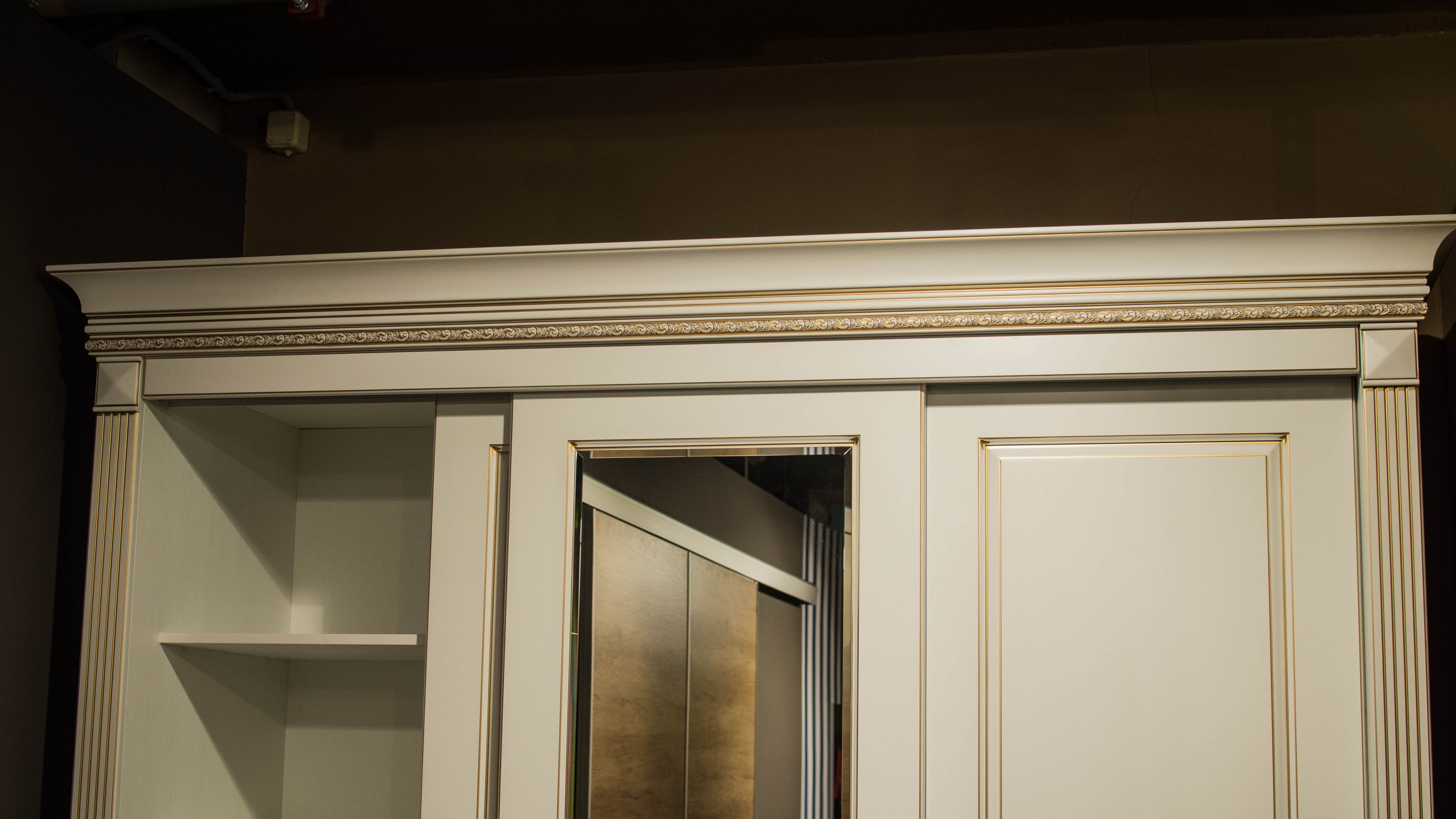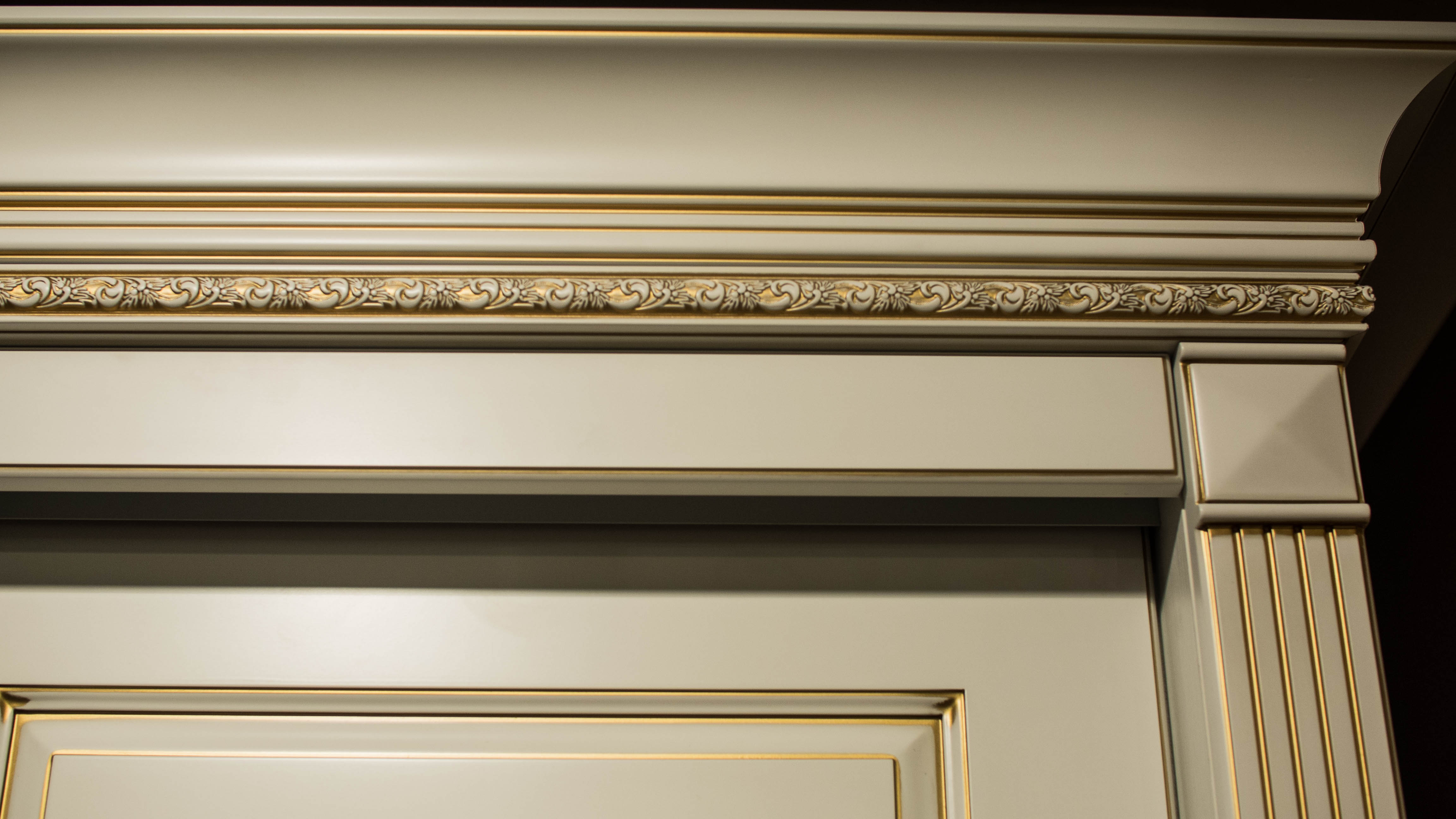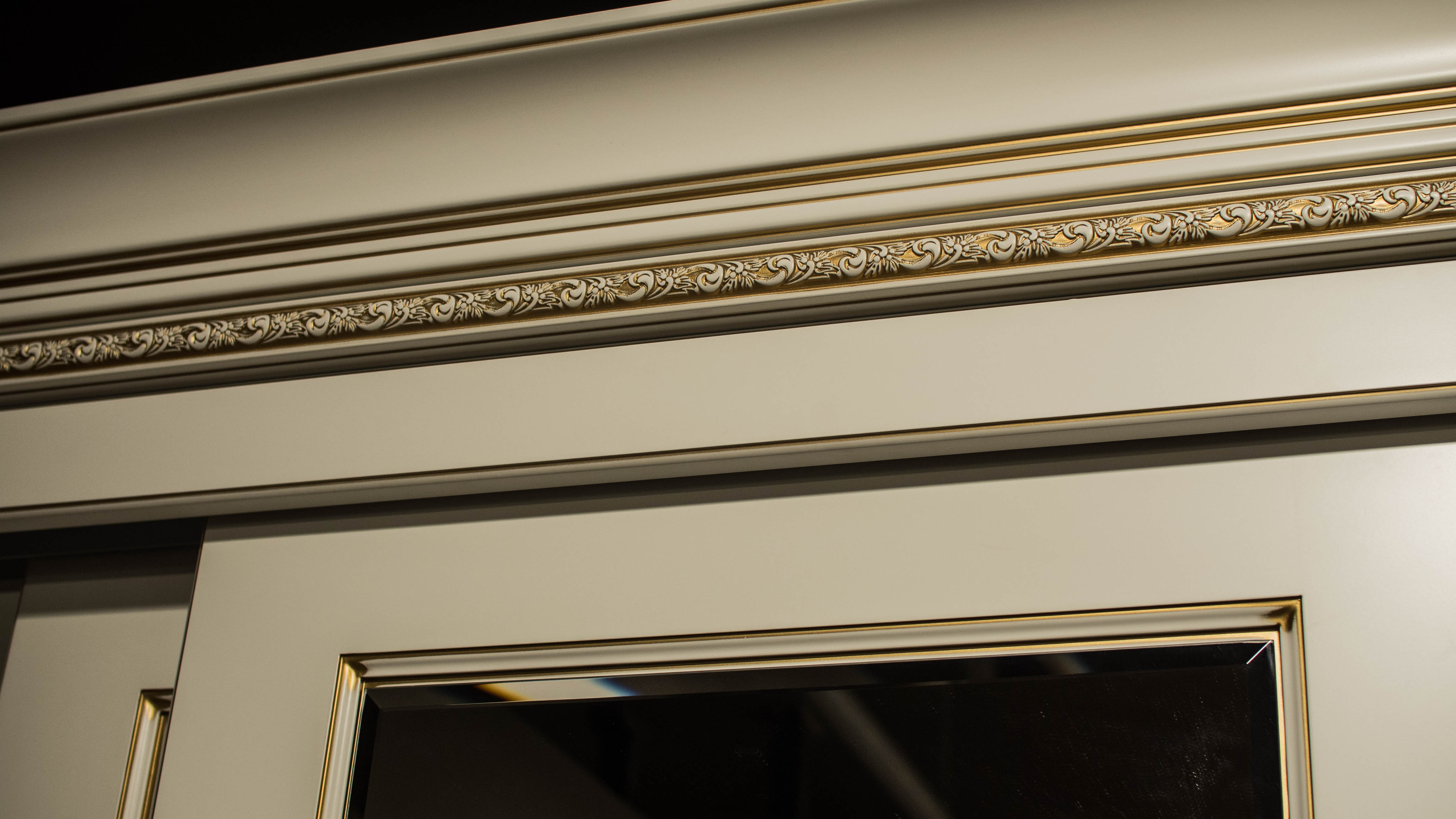 Фасад изделия выполнен из МДФ с матовой эмалью и золотой патиной + зеркало серебро с фацетом.