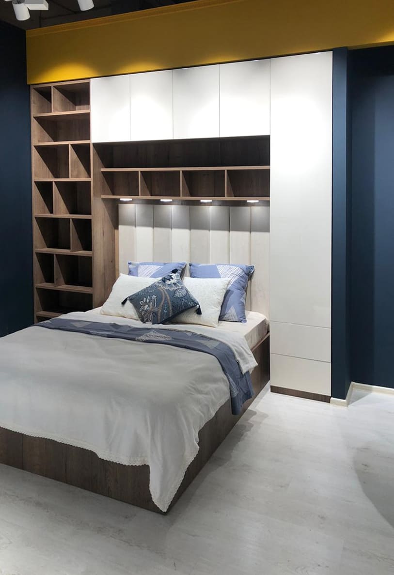 Функциональный стеллаж вокруг изголовья кровати с выдвижными ящиками станет прекрасной альтернативой традиционным прикроватным тумбам.