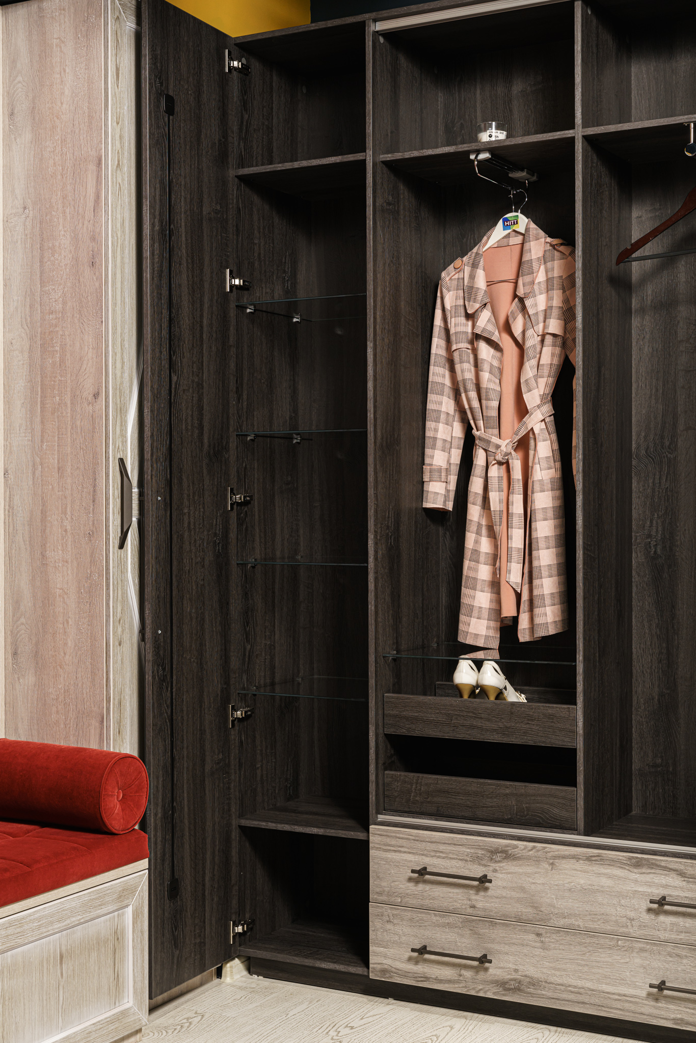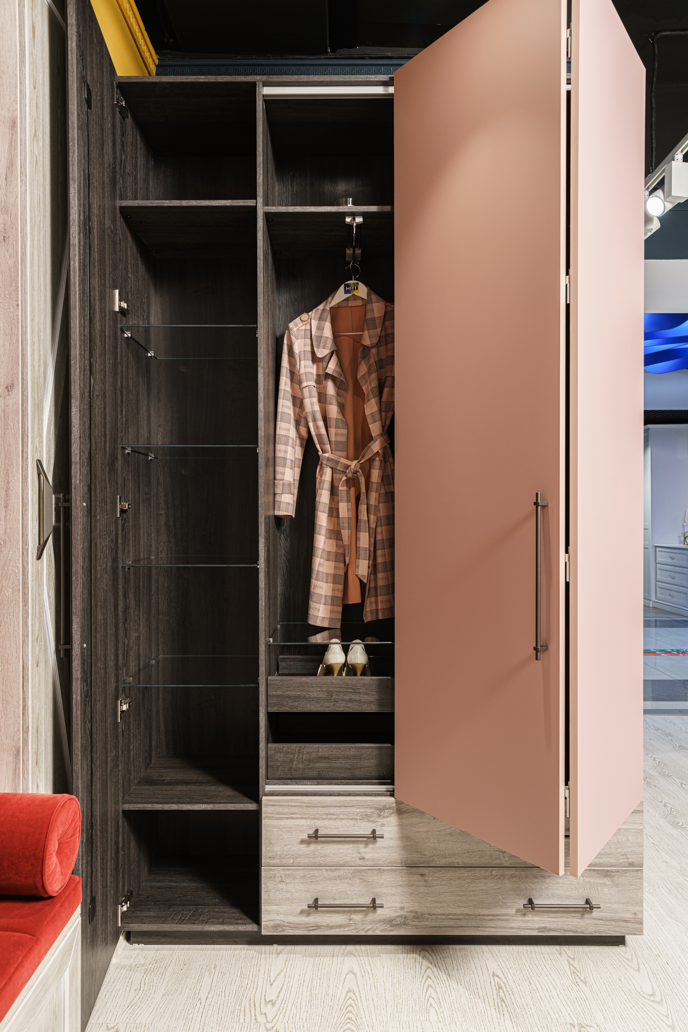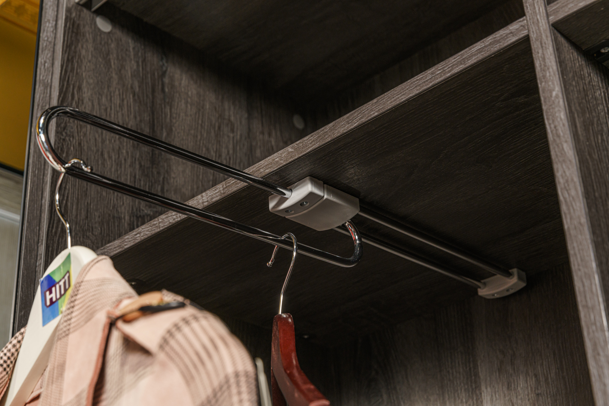 Шкаф со складными дверями оснащен немецкой системой Wing line L, которая обеспечивает плавное скольжение дверей по направляющему профилю, благодаря чему удается достичь удивительного панорамного эффекта. Механизм Wing line L выдерживает створки до 25 кг и высотой 2400 мм. Данный механизм можно использовать как в шкафах, так и гардеробных.