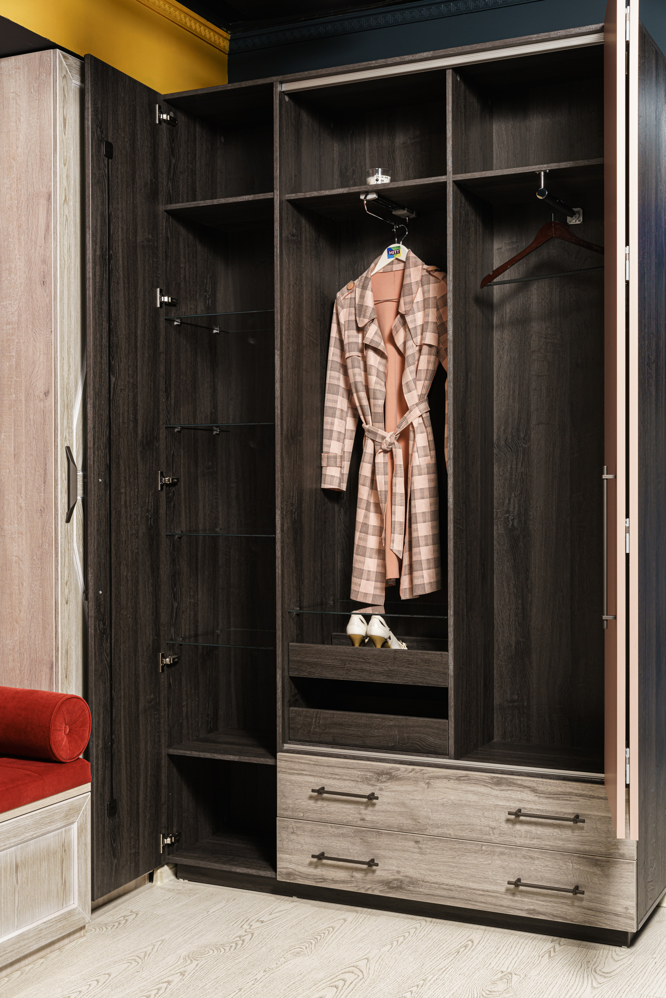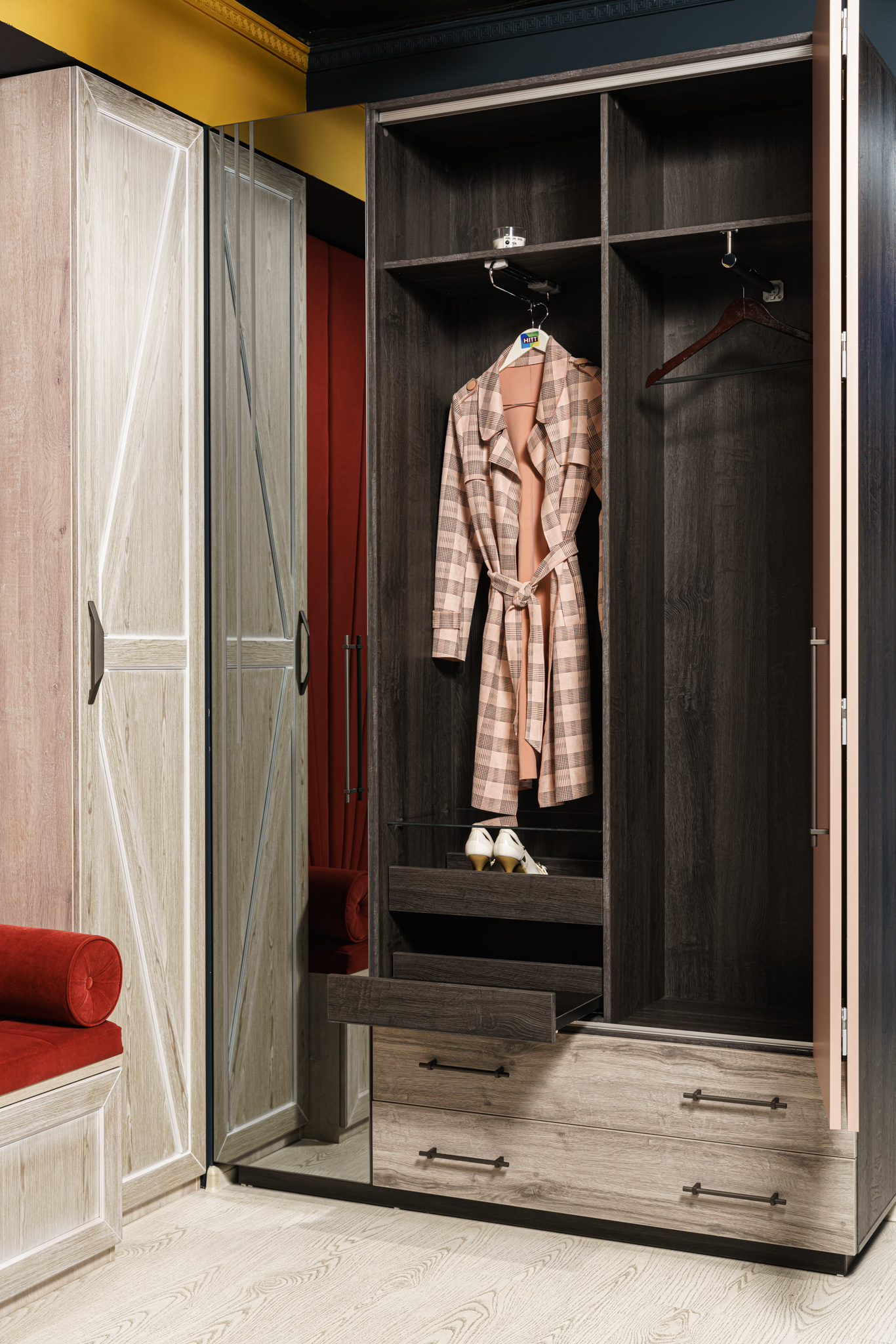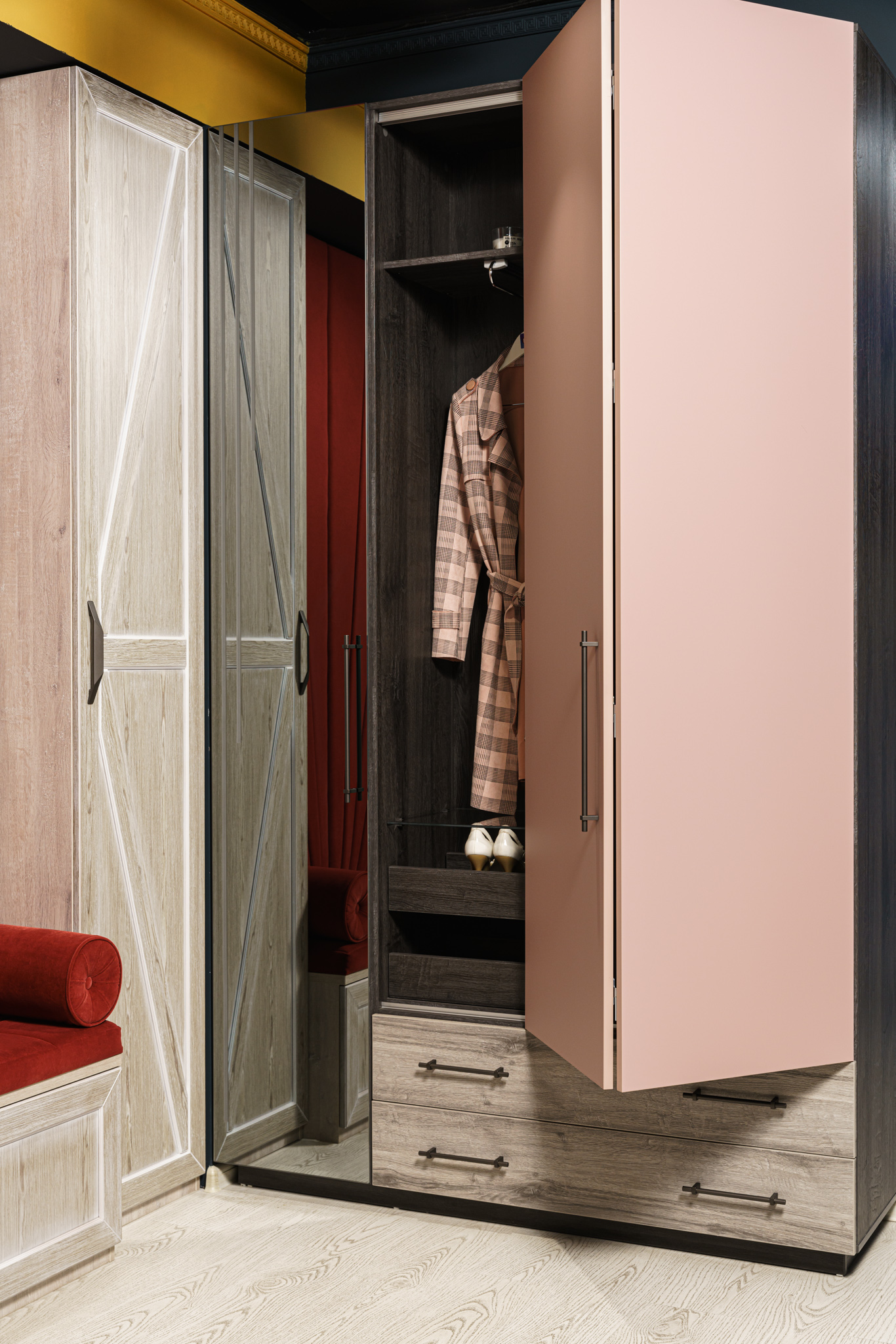 Шкаф со складными дверями оснащен немецкой системой Wing line L, которая обеспечивает плавное скольжение дверей по направляющему профилю, благодаря чему удается достичь удивительного панорамного эффекта. Механизм Wing line L выдерживает створки до 25 кг и высотой 2400 мм. Данный механизм можно использовать как в шкафах, так и гардеробных.
