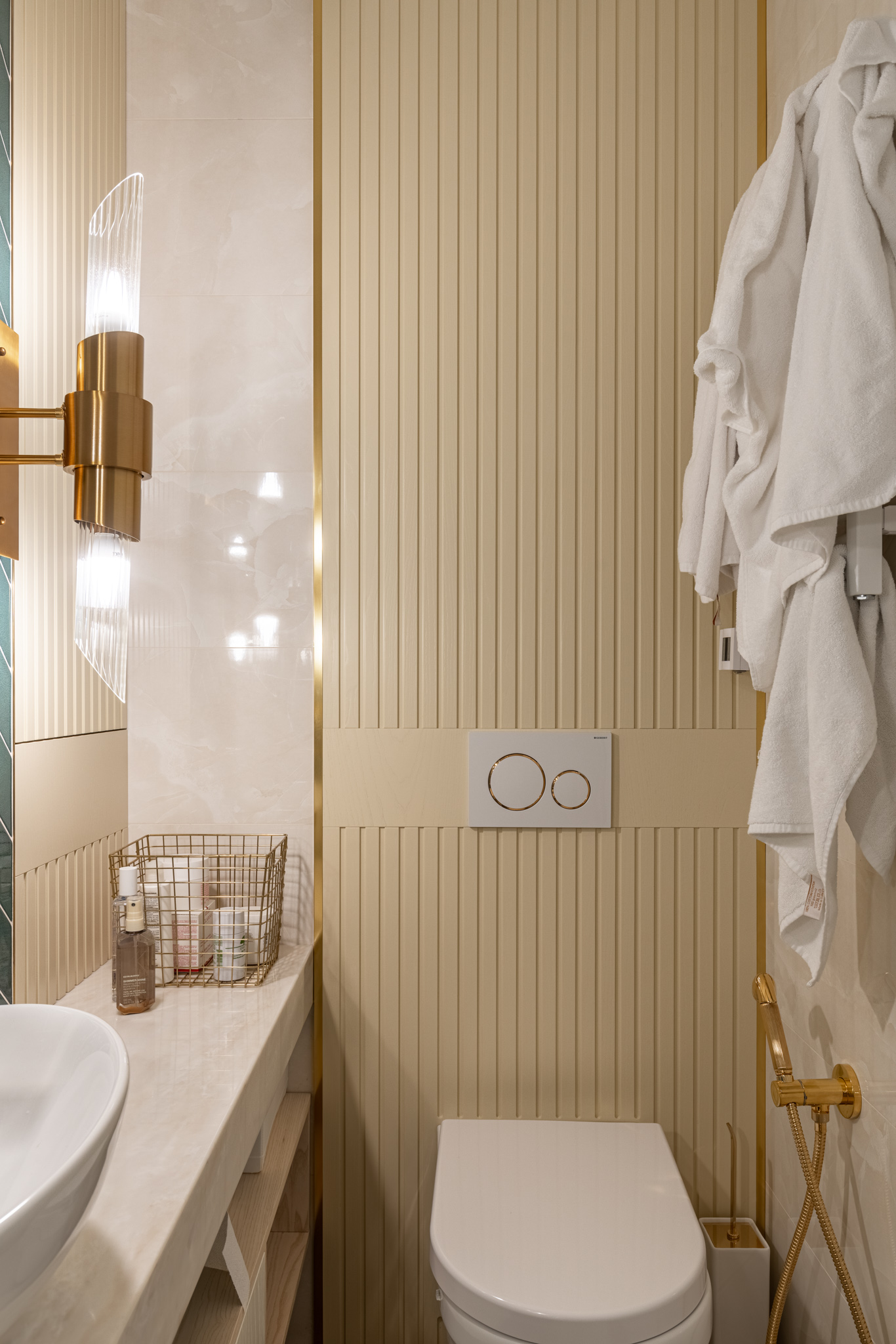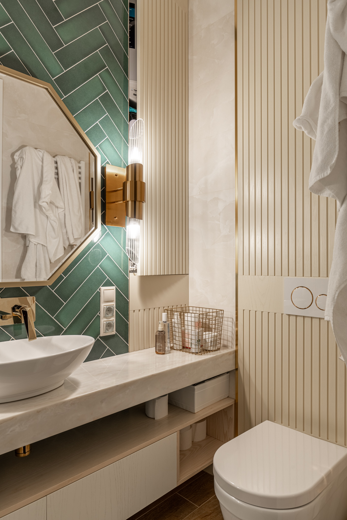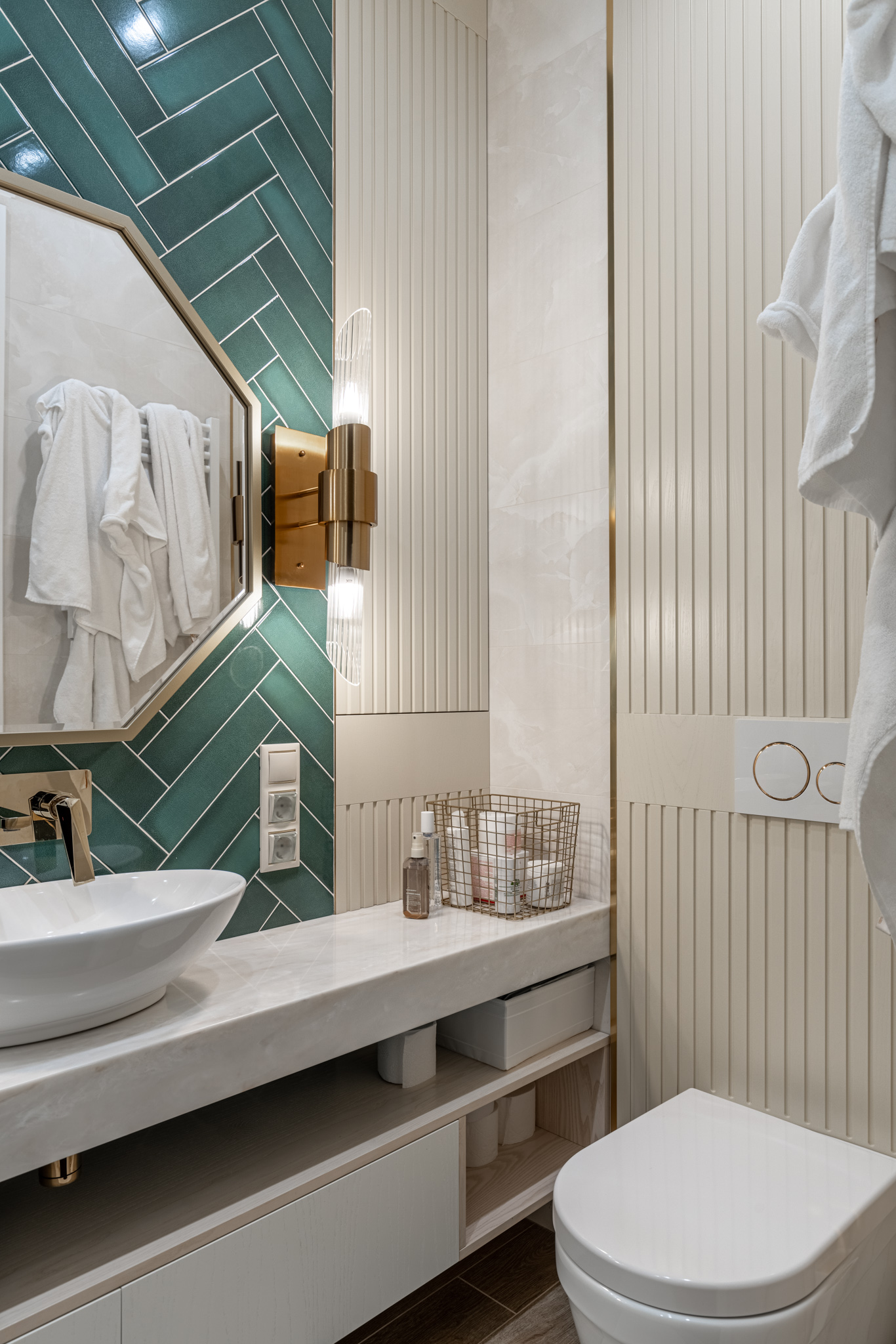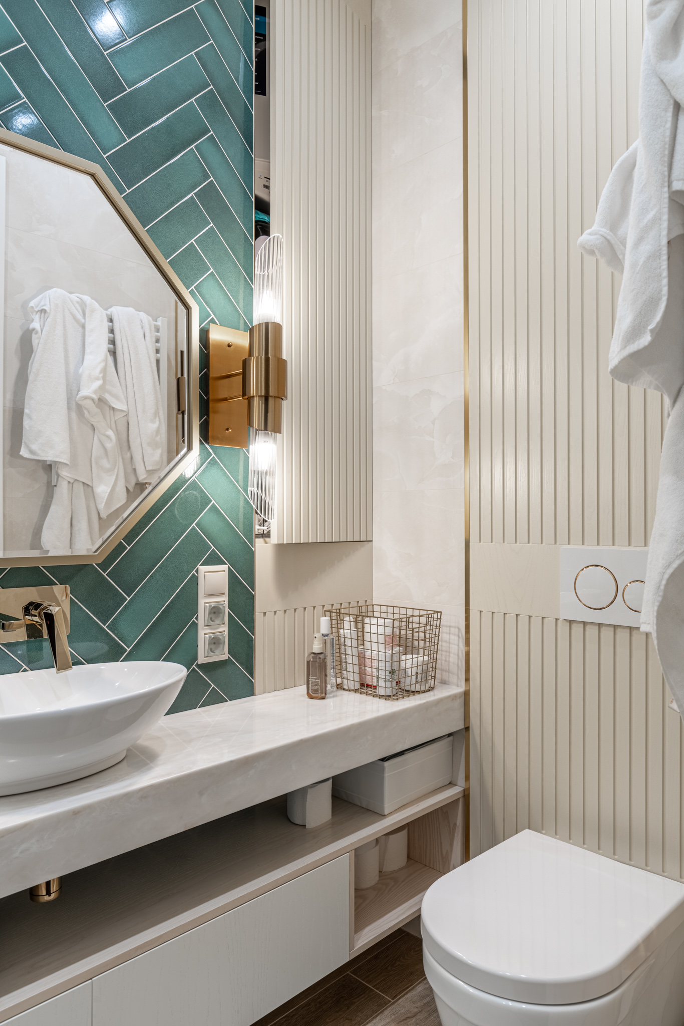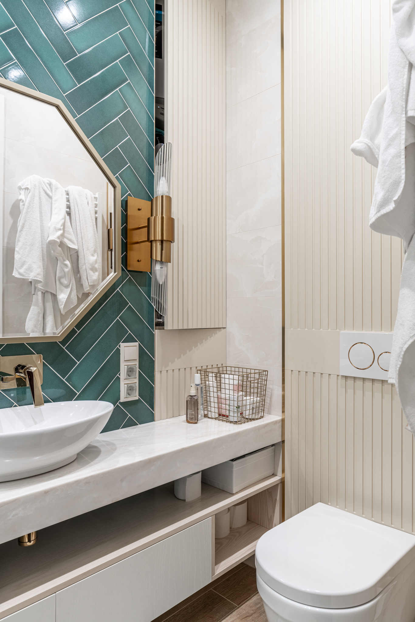 Мебель в ванную комнату из шпона, тонированного морилкой, и фрезерованными фасадами. Посмотреть весь реализованный проект